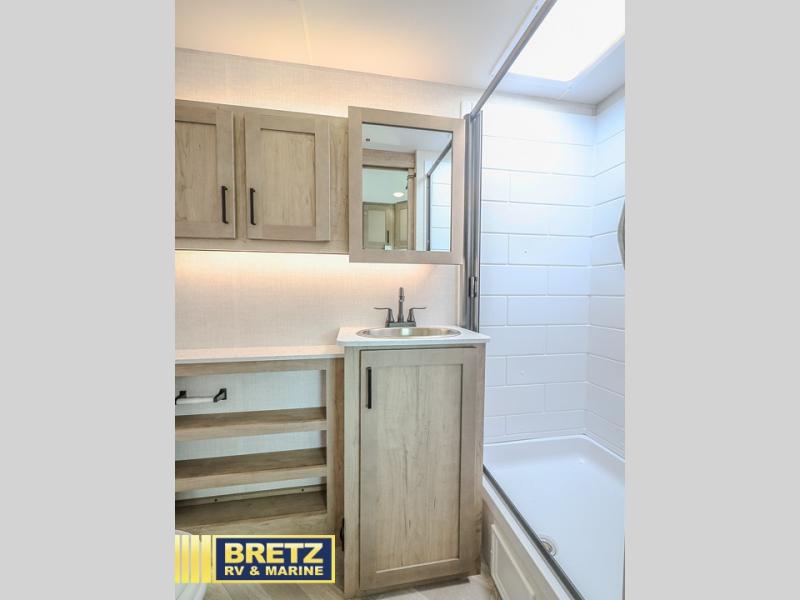 Camping trips just got a whole lot better in this tandem axle, single slide travel trailer! Once you arrive at the campground, you can put out the 18' power awning, grab your camp chairs from the pass-through storage, and relax! When you're getting hungry, head to the rear corner kitchen that includes ample counter space, a two burner cooktop, plus a 10 cu. ft. 12V refrigerator. There is also a pantry to store snacks and paper goods! You can get cozy after dinner on the theater seating that sits directly across from the HDTV for easy viewing, and there is a legless dinette if game night is in order. When you're ready for bed, the queen bed up front will provide a great night's rest, and there is a privacy curtain if you have a guest staying over on the dinette. And don't worry about storage space; this model has you covered with dual bedroom wardrobes, overhead cabinets, and convenient shoe storage!