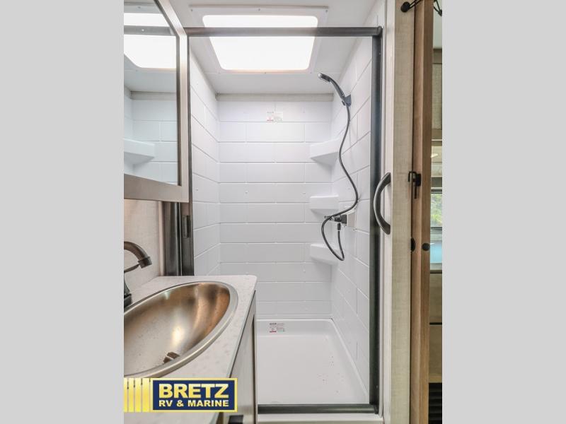 With any E-Series travel trailer by Ember RV you will enjoy a lightweight RV with all the "Essentials" needed for memorable trips in the great outdoors! Each model is constructed with durable laminated Azdel Onboard composite walls, a full walkable roof with a one-piece Tufflex PVC roofing material, and a gel-coated fiberglass exterior. The Dexter axles with E-Z lube hubs and forward self-adjusting electric brakes plus Goodyear Endurance tires will provide a smooth tow from home to campground. You will appreciate the Congoleum DiamondFlor "carpetless" interior that is easy to clean, and the hardwood framed cabinet doors will create a more residential feel. Each model includes a tankless on-demand water heater for endless hot showers and an 18,000 BTU Max Cool "Whisper Quiet" A/C, which is the largest single A/C in its class! An EmberLink Smart RV system will let you easily control features such as lights and slides and you can wash away those rainy day blues by watching the HDTV with a built-in Bluetooth AV system. If you're looking for off-grid capabilities, you might want to choose the optional Off-Grid Solar Package with 400 total watts of solar panels, a 2,000W Pure Sine wave inverter, and a Victron MPPT solar controller!