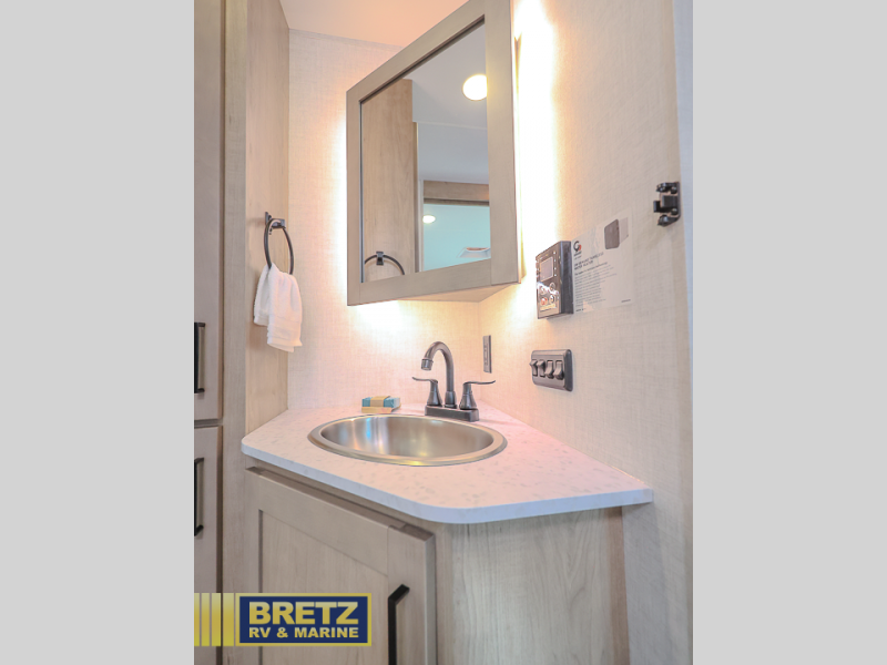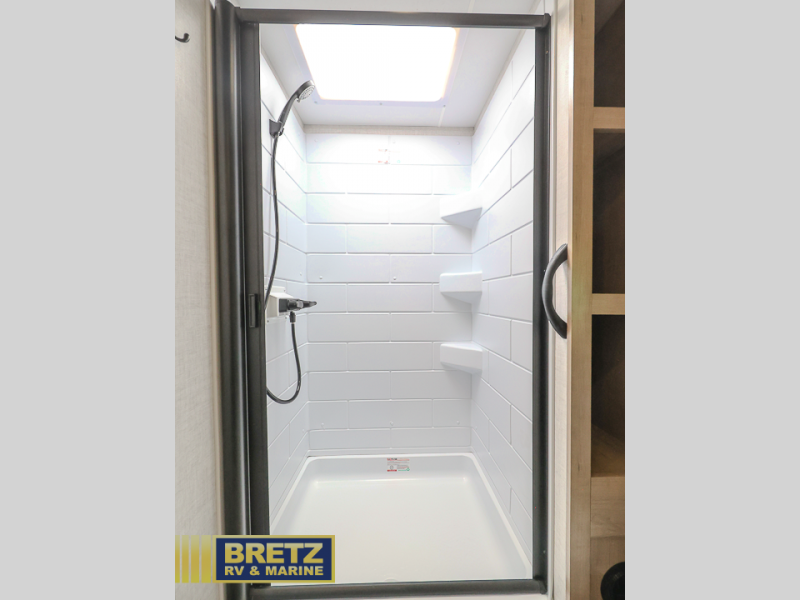 Are you looking for a travel trailer with plenty of interior space and lots of conveniences? Look no further than this E-Series unit! You can sleep three to four comfortably between the true residential queen bed in the front bedroom and the legless dinette, plus there is a walk-through bath that everyone can access easily. You'll also find the second entry door located in the master bedroom, along with dual nightstands and dual wardrobes to keep clothes wrinkle-free. After a day outdoors, you will love relaxing on the theater seating that is directly across from the HDTV to make it a movie night, and the legless dinette provides a place to dine, play games, and let a guest or two sleep over. And we haven't even mention the rear kitchen with tons of counter space, an air fryer convection microwave, a two burner cooktop, and a 10 cu. ft. 12V refrigerator!