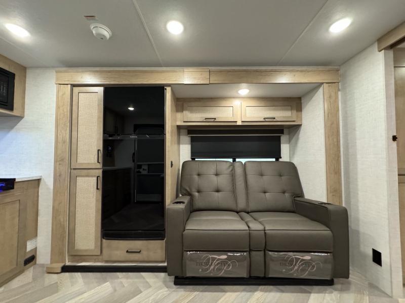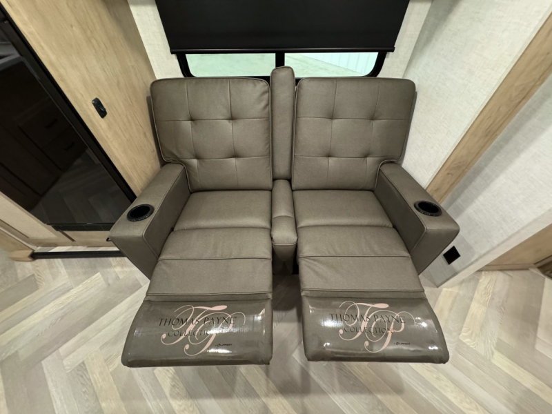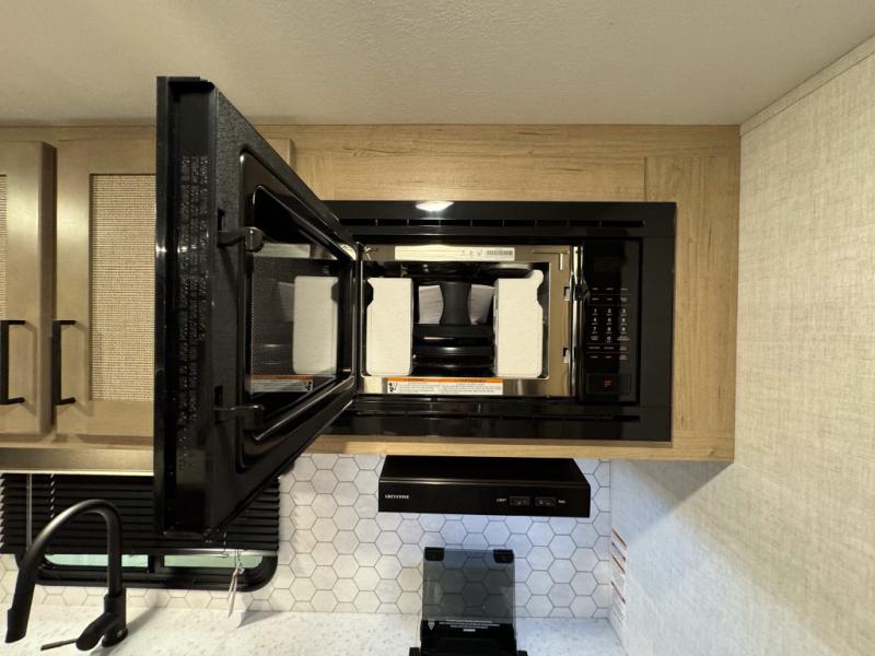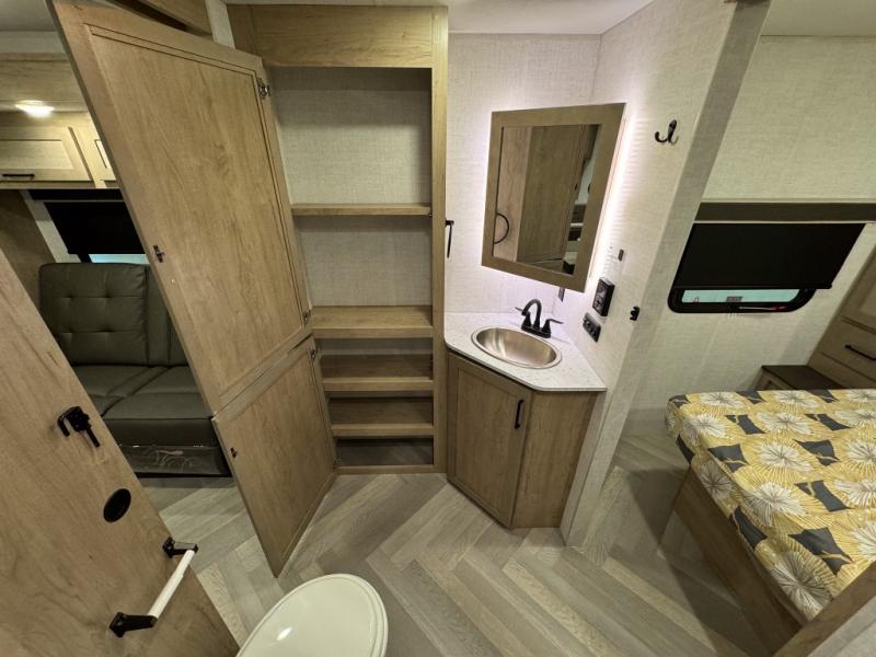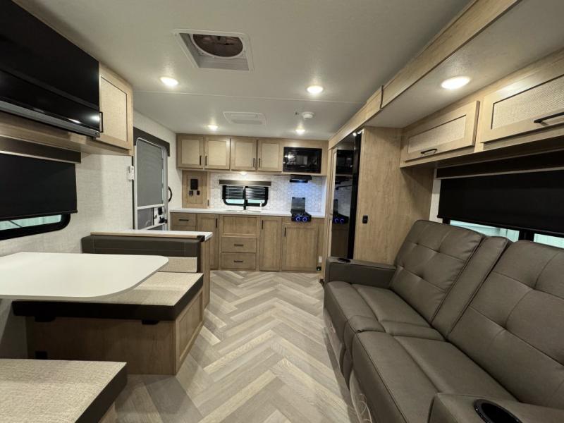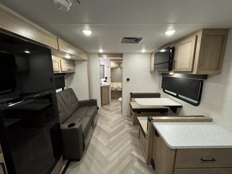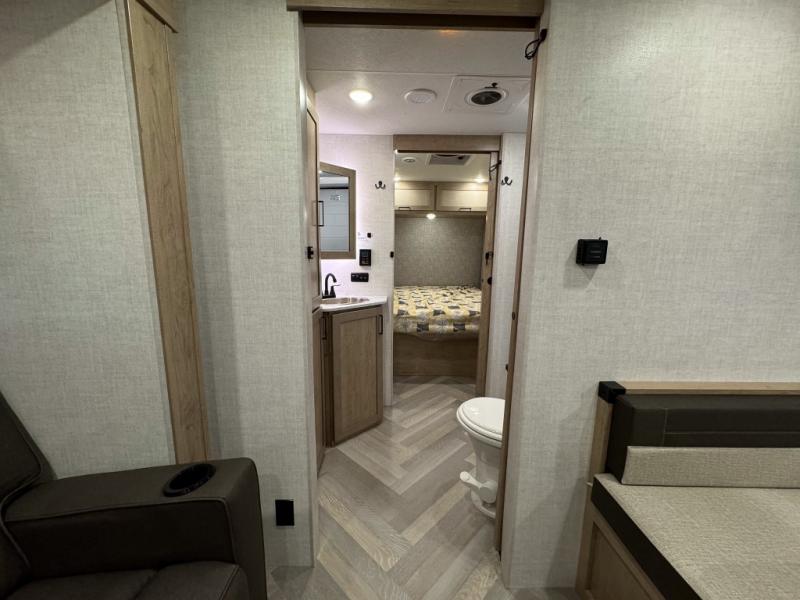 Are you looking for a travel trailer with plenty of interior space and lots of conveniences? Look no further than this E-Series unit! You can sleep three to four comfortably between the true residential queen bed in the front bedroom and the legless dinette, plus there is a walk-through bath that everyone can access easily. You'll also find the second entry door located in the master bedroom, along with dual nightstands and dual wardrobes to keep clothes wrinkle-free. After a day outdoors, you will love relaxing on the theater seating that is directly across from the HDTV to make it a movie night, and the legless dinette provides a place to dine, play games, and let a guest or two sleep over. And we haven't even mention the rear kitchen with tons of counter space, an air fryer convection microwave, a two burner cooktop, and a 10 cu. ft. 12V refrigerator!