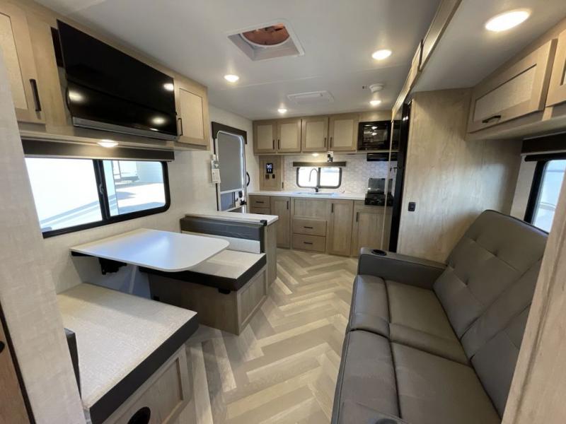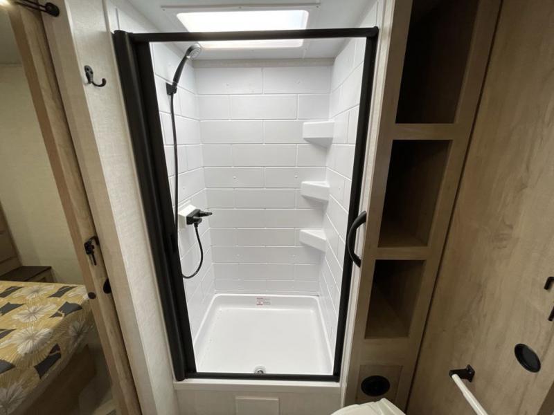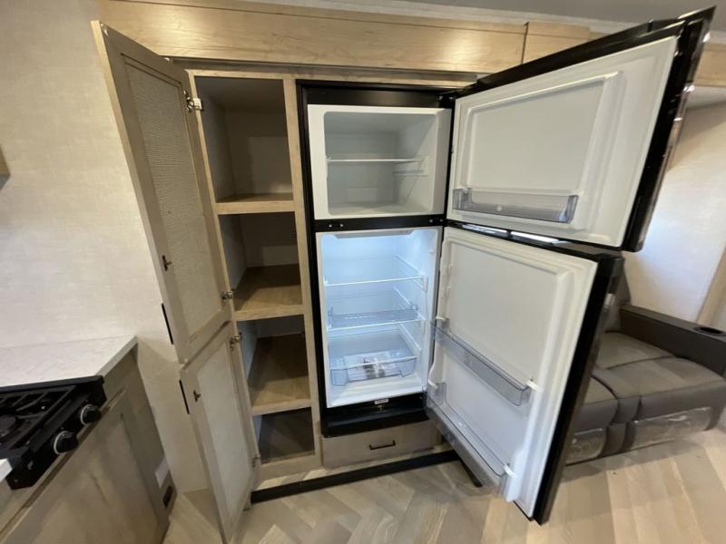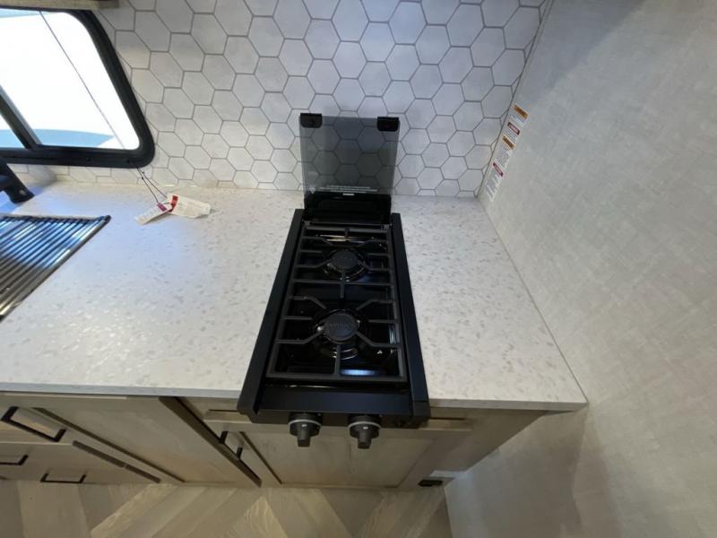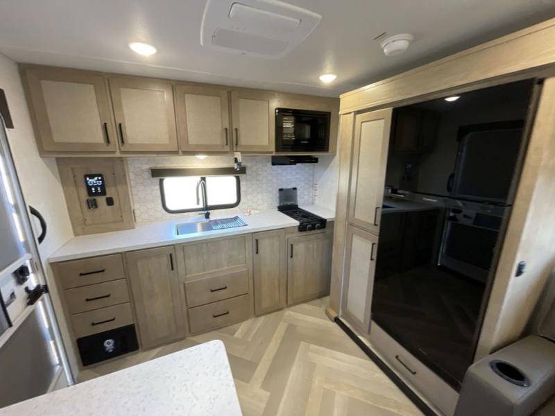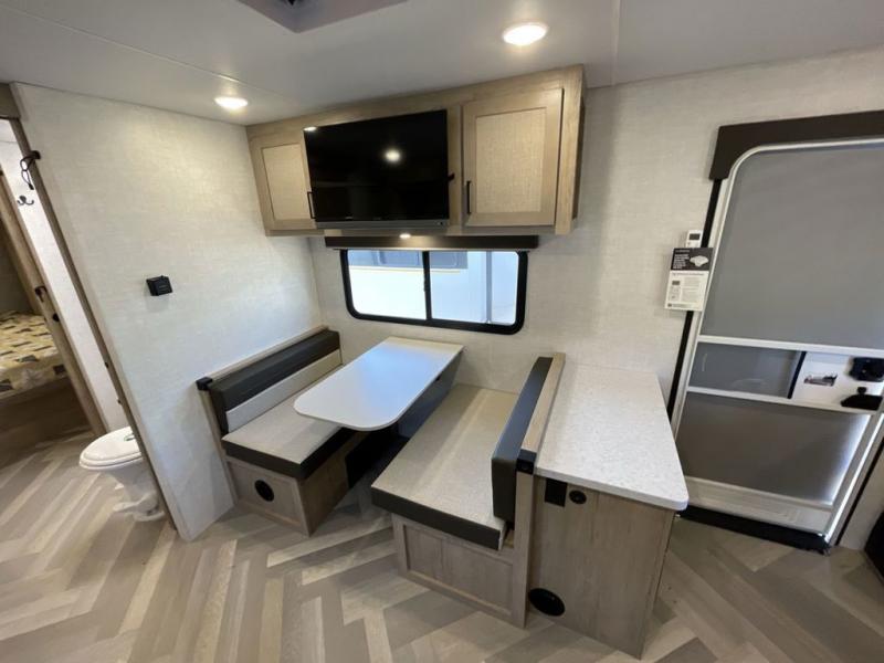 Are you looking for a travel trailer with plenty of interior space and lots of conveniences? Look no further than this E-Series unit! You can sleep three to four comfortably between the true residential queen bed in the front bedroom and the legless dinette, plus there is a walk-through bath that everyone can access easily. You'll also find the second entry door located in the master bedroom, along with dual nightstands and dual wardrobes to keep clothes wrinkle-free. After a day outdoors, you will love relaxing on the theater seating that is directly across from the HDTV to make it a movie night, and the legless dinette provides a place to dine, play games, and let a guest or two sleep over. And we haven't even mention the rear kitchen with tons of counter space, an air fryer convection microwave, a two burner cooktop, and a 10 cu. ft. 12V refrigerator!