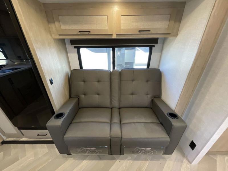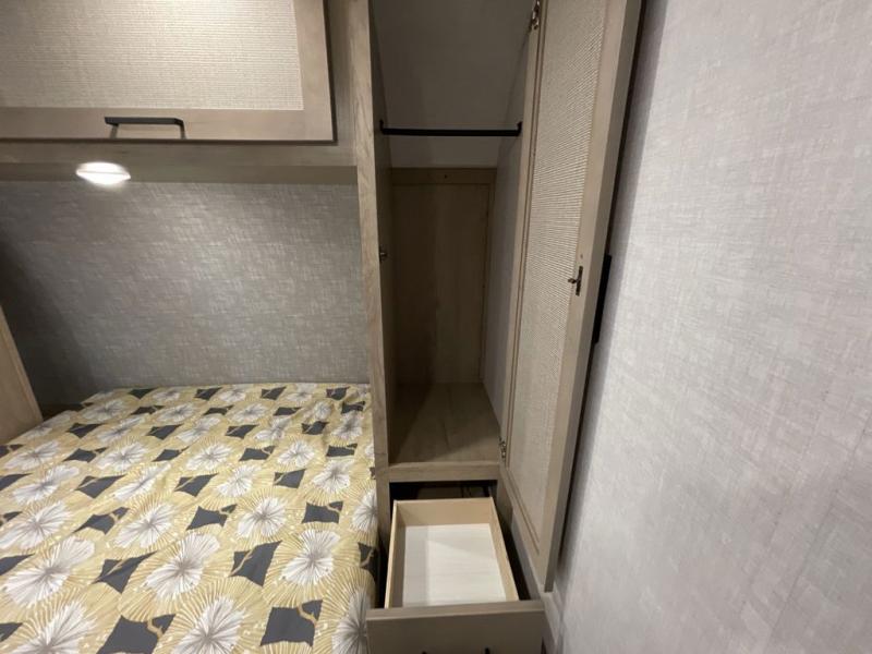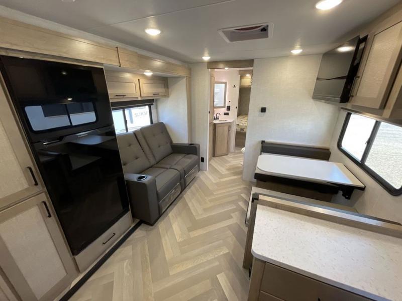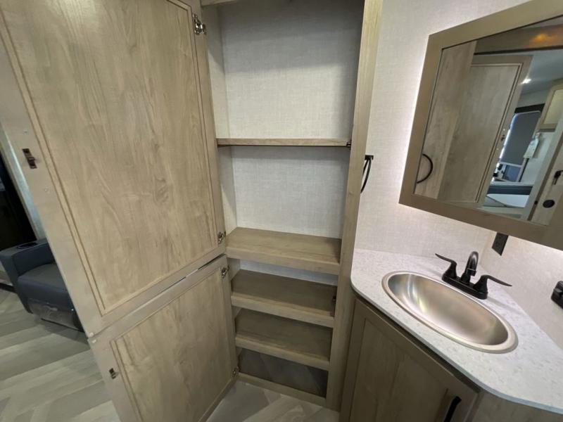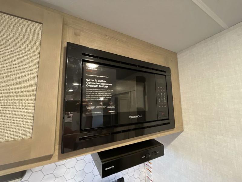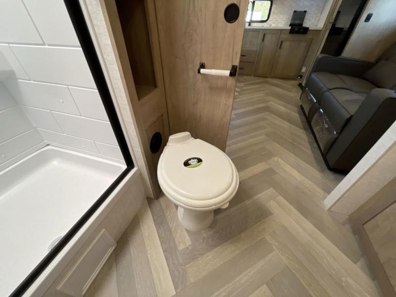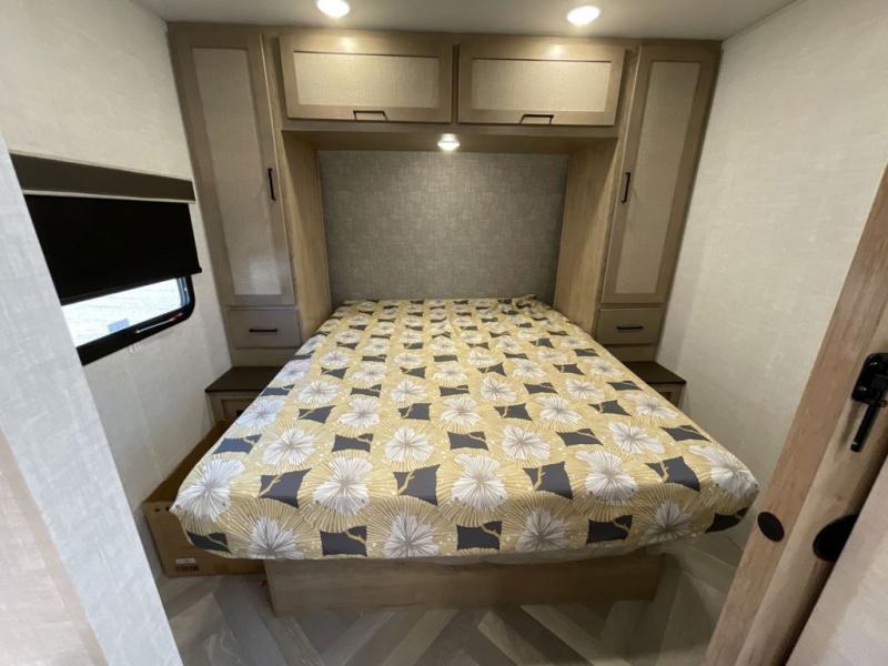 Are you looking for a travel trailer with plenty of interior space and lots of conveniences? Look no further than this E-Series unit! You can sleep three to four comfortably between the true residential queen bed in the front bedroom and the legless dinette, plus there is a walk-through bath that everyone can access easily. You'll also find the second entry door located in the master bedroom, along with dual nightstands and dual wardrobes to keep clothes wrinkle-free. After a day outdoors, you will love relaxing on the theater seating that is directly across from the HDTV to make it a movie night, and the legless dinette provides a place to dine, play games, and let a guest or two sleep over. And we haven't even mention the rear kitchen with tons of counter space, an air fryer convection microwave, a two burner cooktop, and a 10 cu. ft. 12V refrigerator!
