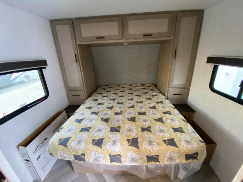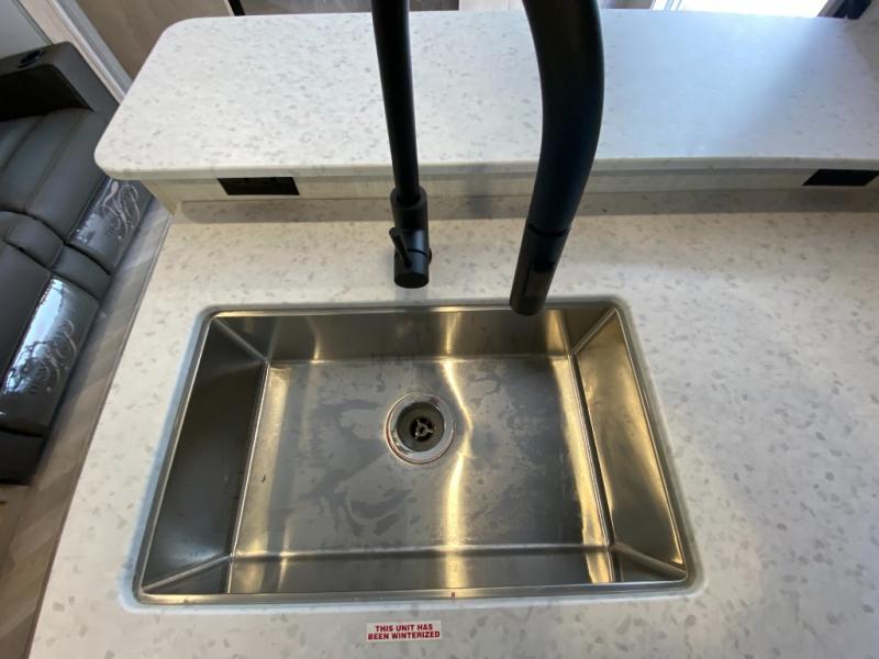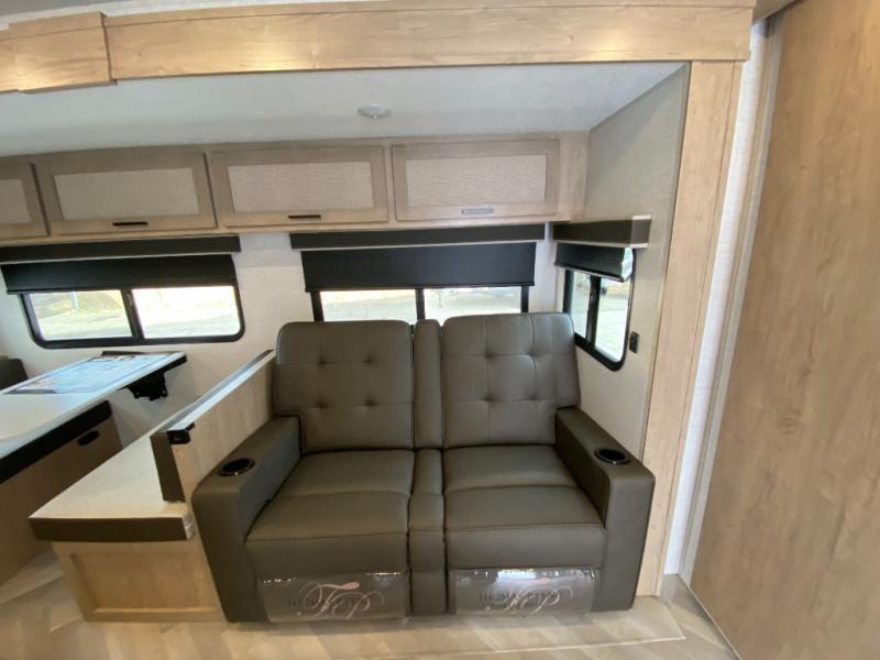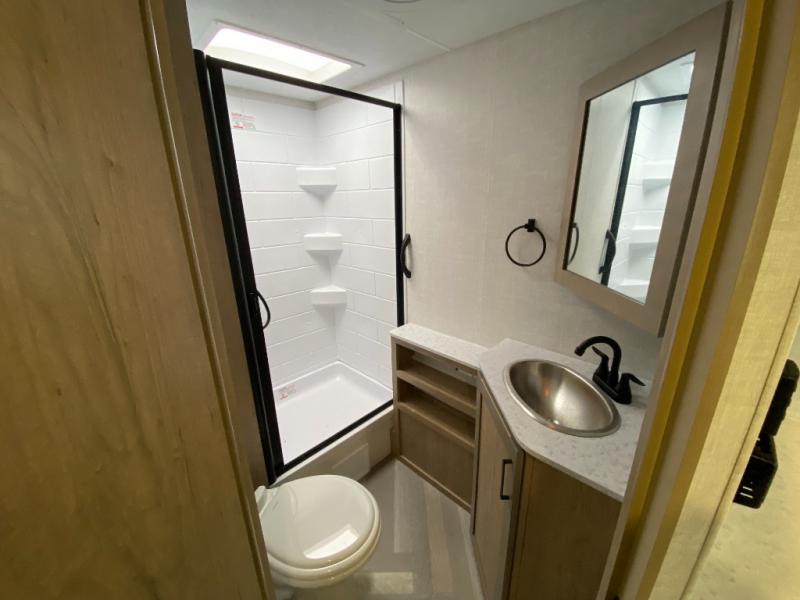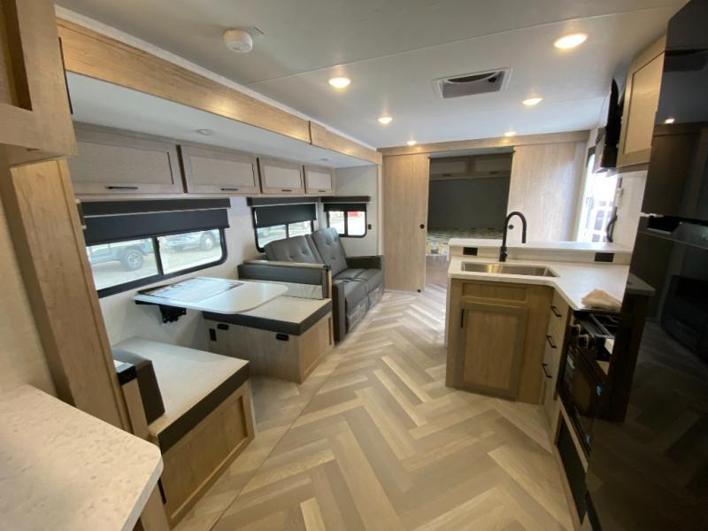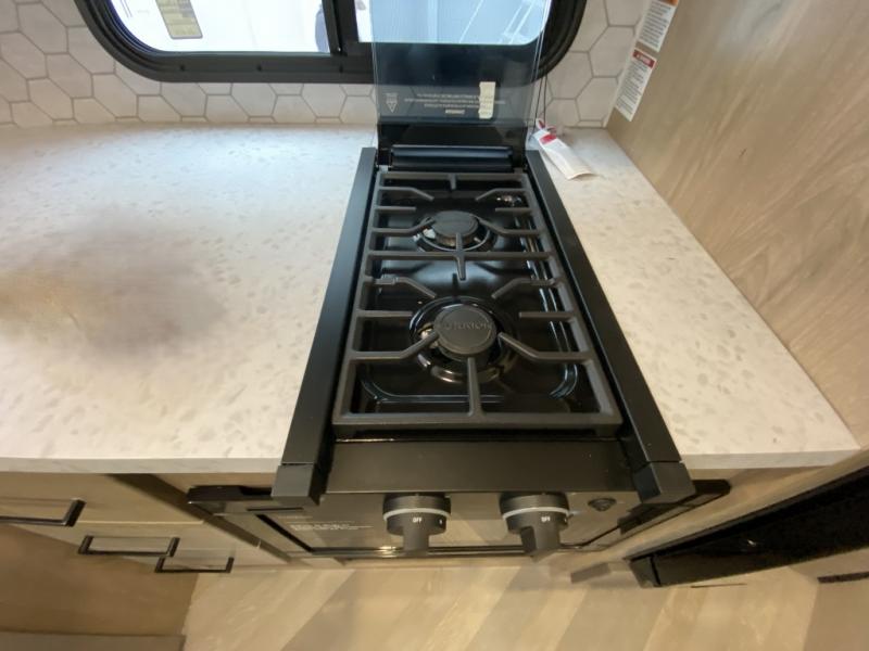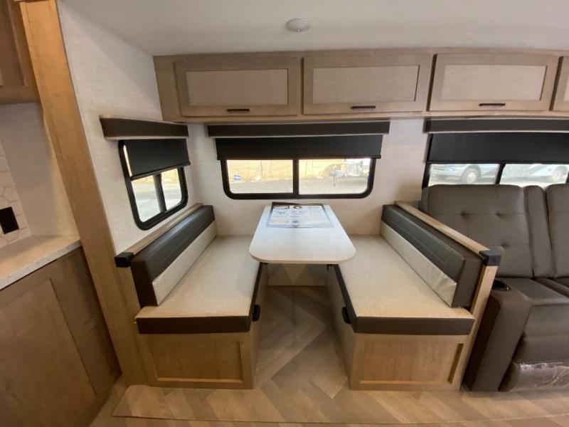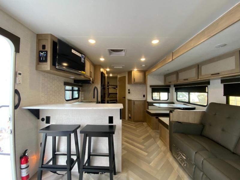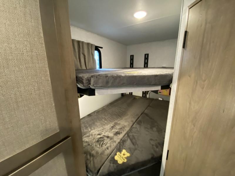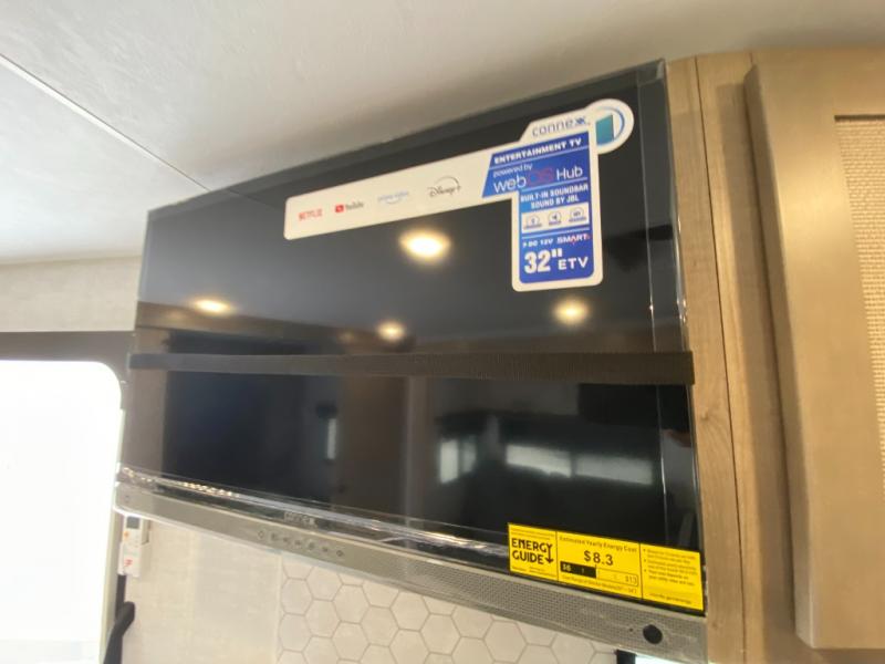 This model resembles 22ETS, but you'll enjoy added theater seating and a larger exterior length for more interior space! The patent-pending repositionable EmberTrack E-Track bunk/storage system includes 74" x 45" cargo space, and there are multiple single/double bunk configurations to fit your needs. The front walk-around true residential queen bed includes dual nightstands and dual wardrobes, and you'll appreciate sliding doors that makes a private bedroom. This E-Series kitchen includes an air fryer convection microwave, a two burner cooktop, plus a breakfast bar with bar stools so you can visit with the chef as they cook meals. A legless dinette will provide a place to dine, or you can take your plate outdoors to sit under the 18' power awning with a dimmable LED light. You'll also find a pass-through storage outside, along with a docking station and a kayak/bike storage door!