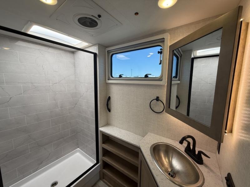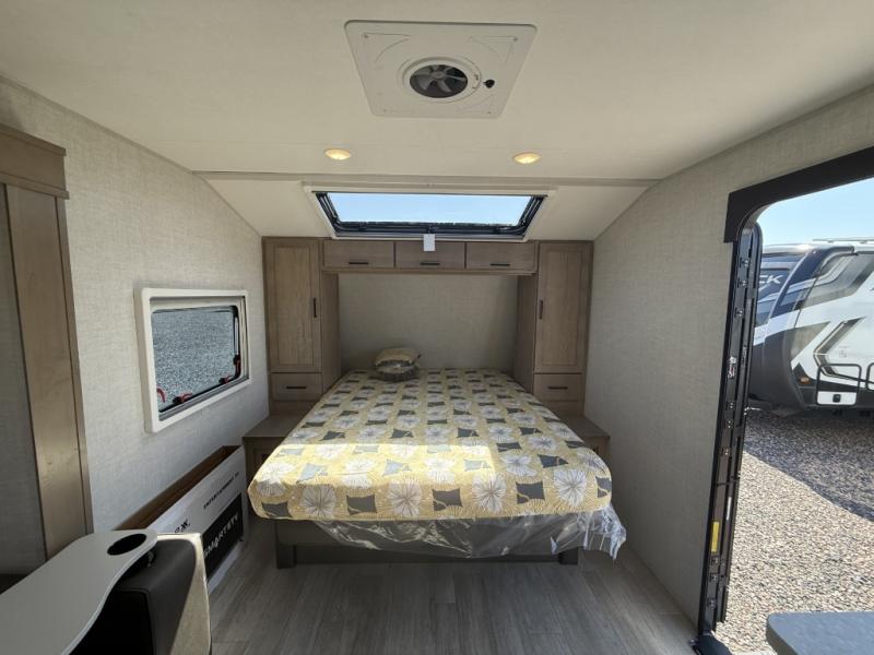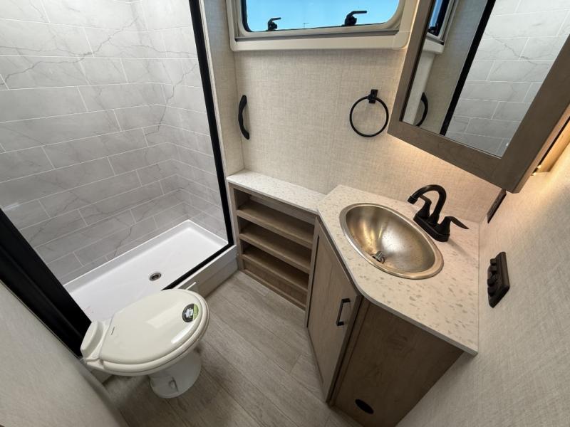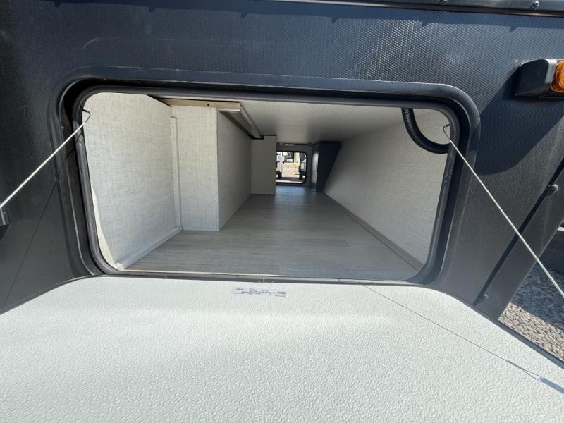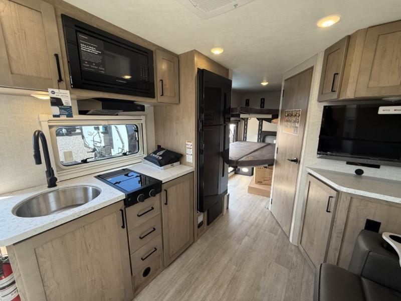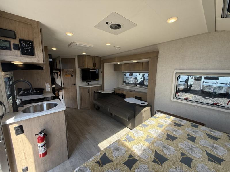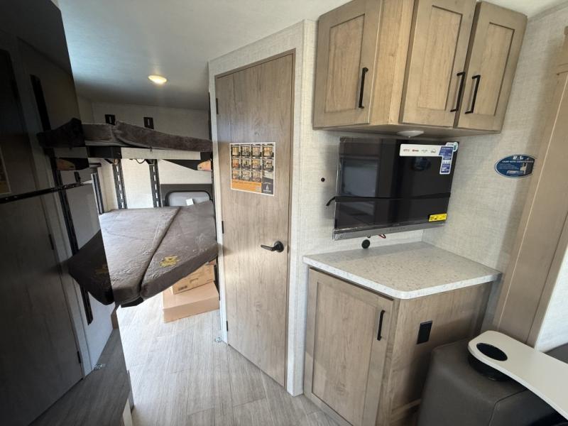 You're going to love everything about this travel trailer that can comfortably sleep three to six people each night, depending on your bunk configurations. There is a spacious storage locker that can be used for hiking gear, plus a kayak/bike storage door for quick and easy packing. The Embertrack system lets you convert the benches to twin bunks, double-size bunks, a desk, or remove them altogether for more storage space. You will enjoy the queen-size Murphy bed up front, along with the "stargazer" skylight for nighttime views, along with dual nightstands and dual wardrobes to keep your clothes tidy. And in the morning you can relax on the jack-knife sofa with a removable table once the bed is put away. This trailer also includes a full kitchen with a 12V refrigerator, an air fryer convection microwave oven, a dual burner cooktop, and a stainless steel sink for easy clean-up.