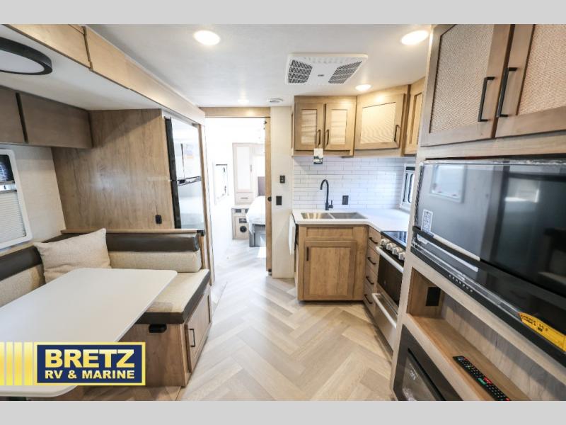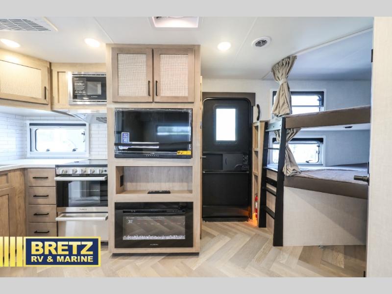 This model is similar to 24BH except that in the front private bedroom of this travel trailer has a Murphy bed and this space can be used as a bedroom, office, or den since there are also removable tables! There is a set of double-size bunks with the lower bunk being able to fold for storage. The chef can prepare their best meals in the fully equipped kitchen with a flip-up countertop for even more prepping space. The U-shaped dinette with a removable table not only provides a comfortable place to enjoy meals. but also to play games and transform into a sleeping space. Everyone can freshen up in the rear corner bathroom with the 30" x 34" shower. You could even add the optional outside kitchen to enjoy meals underneath the 21' electric awning with dimmable lights!