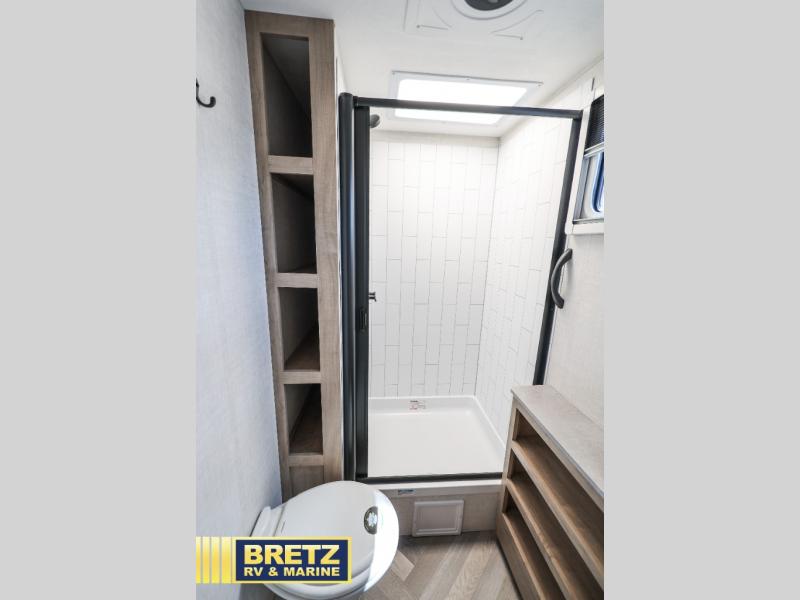 This model is similar to 24BH except that in the front private bedroom of this travel trailer has a Murphy bed and this space can be used as a bedroom, office, or den since there are also removable tables! There is a set of double-size bunks with the lower bunk being able to fold for storage. The chef can prepare their best meals in the fully equipped kitchen with a flip-up countertop for even more prepping space. The U-shaped dinette with a removable table not only provides a comfortable place to enjoy meals. but also to play games and transform into a sleeping space. Everyone can freshen up in the rear corner bathroom with the 30" x 34" shower. You could even add the optional outside kitchen to enjoy meals underneath the 21' electric awning with dimmable lights!