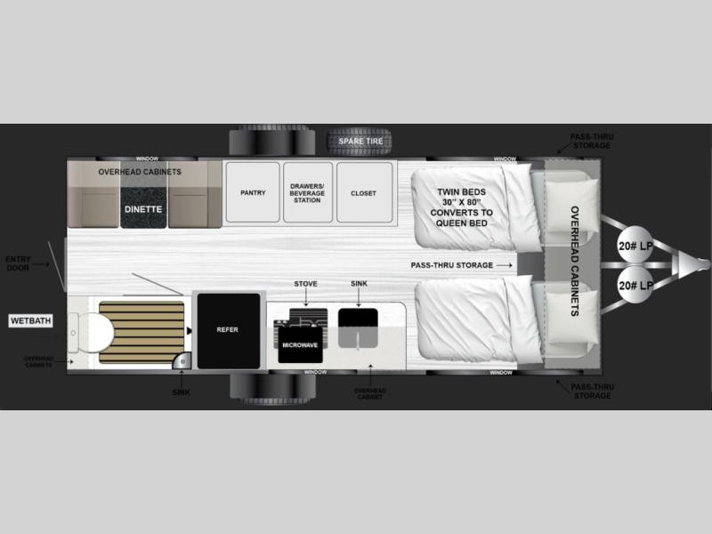 You'll love spending time at the campground in this cozy travel trailer for three. Once you arrive at the site, you can unload the pass-thru storage, then head in through the rear entry door to unpack. A two burner stove and microwave oven will let you make a quick lunch, and there is an 8 cu. ft. refrigerator/freezer to keep your cold items fresh. There are also drawers/beverage station, a pantry and closet plus overhead cabinets so everything has a place. You'll get a great night's rest on the front twin beds that can convert to a queen-size bed, while your guests convert the booth dinette to sleeping space. And the wet bath is complete with a bath mat, cassette toilet, sink, and skylight for more standing space!