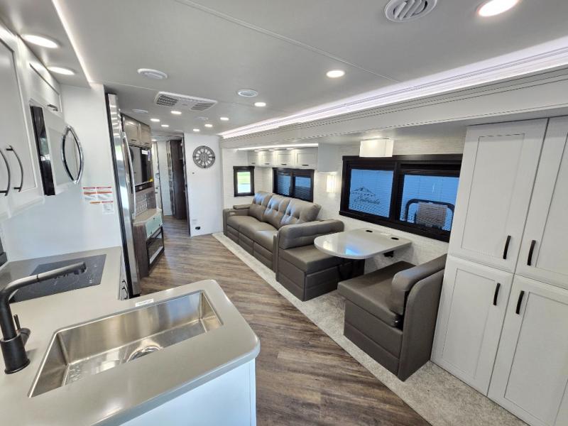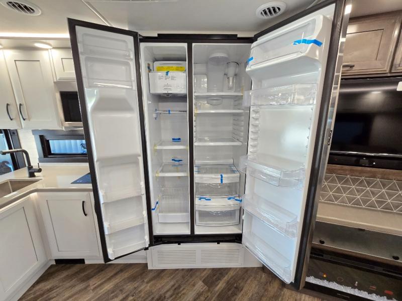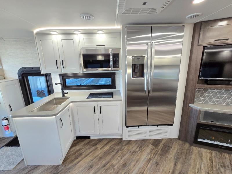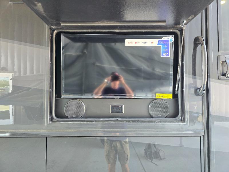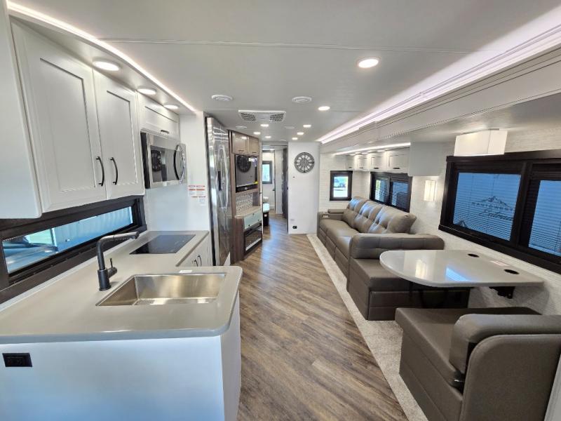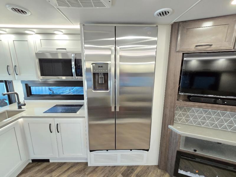 Get ready for fun adventures in this double slide out coach! Once you arrive at your destination, set up the 17' power awning with LED lights and watch the big game on the exterior LED Smart TV. You'll find plenty of seating spaces in the main living area on the 93" reclining sofa or at the booth dinette, plus there is a fireplace here and an LED HD Smart TV. The kitchen is any chef's dream with its residential refrigerator, two burner induction cooktop, and residential-size convection microwave. This model also includes a bath and a half that will come in handy when traveling with friends and family, and don't overlook the master bedroom with a power head lift king bed slide, large wardrobes, and an LED Smart TV!