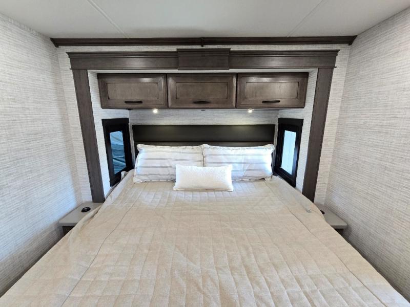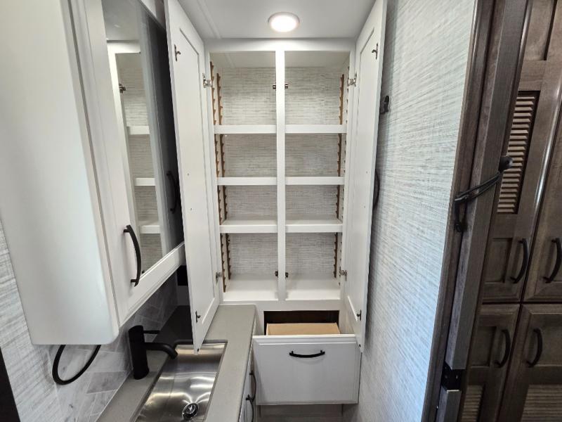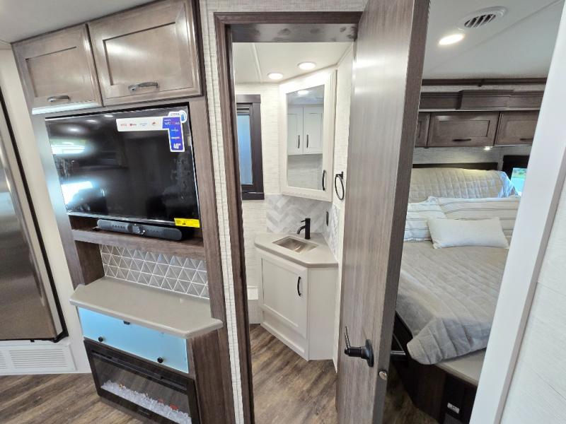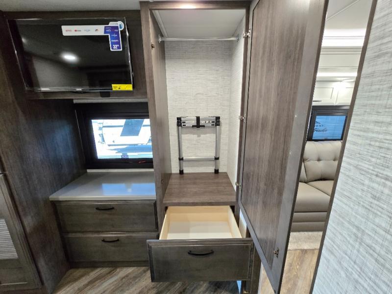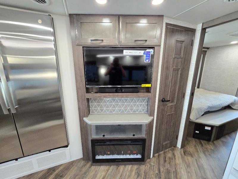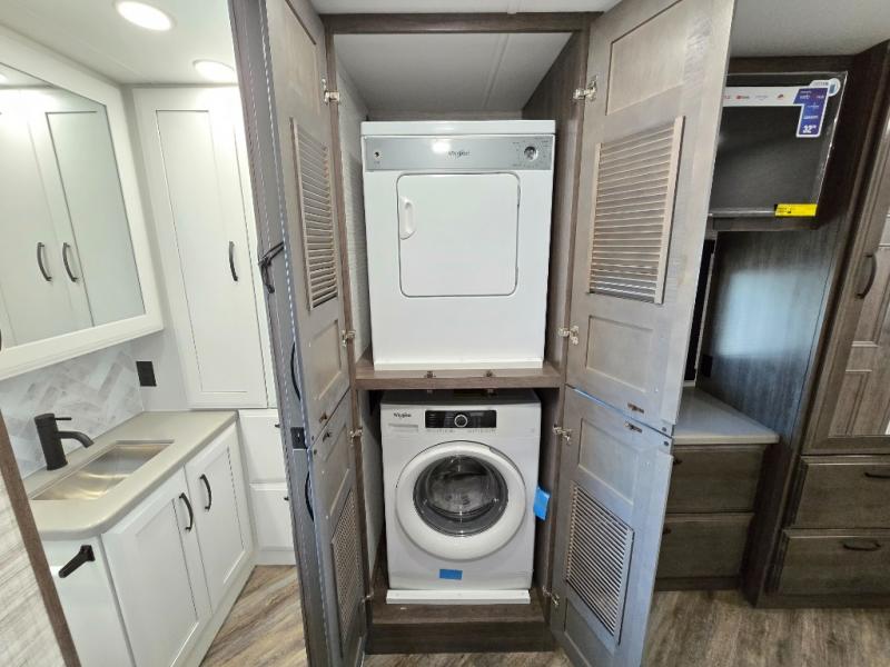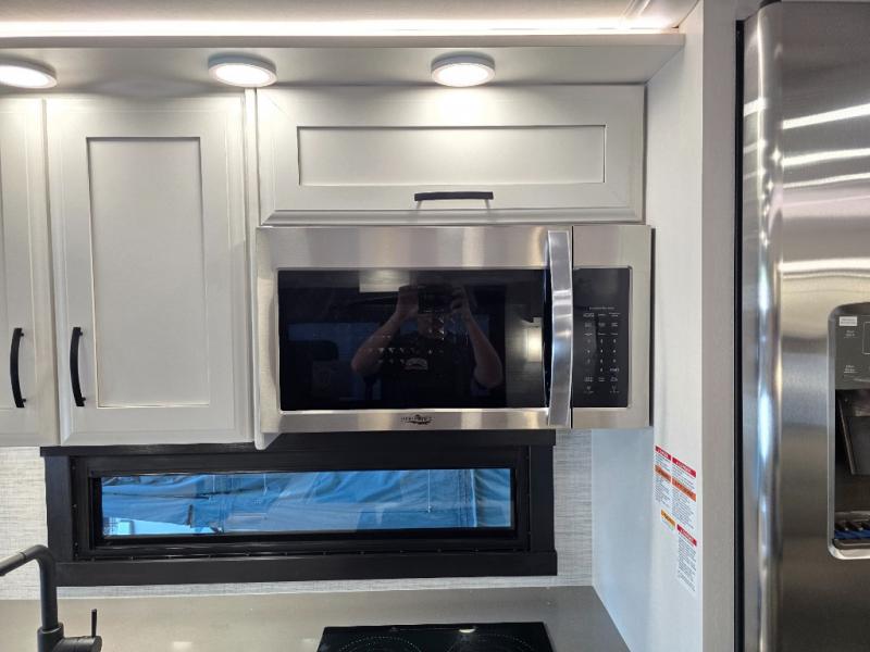 Get ready for fun adventures in this double slide out coach! Once you arrive at your destination, set up the 17' power awning with LED lights and watch the big game on the exterior LED Smart TV. You'll find plenty of seating spaces in the main living area on the 93" reclining sofa or at the booth dinette, plus there is a fireplace here and an LED HD Smart TV. The kitchen is any chef's dream with its residential refrigerator, two burner induction cooktop, and residential-size convection microwave. This model also includes a bath and a half that will come in handy when traveling with friends and family, and don't overlook the master bedroom with a power head lift king bed slide, large wardrobes, and an LED Smart TV!