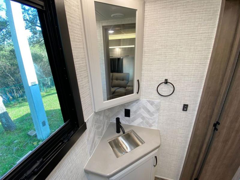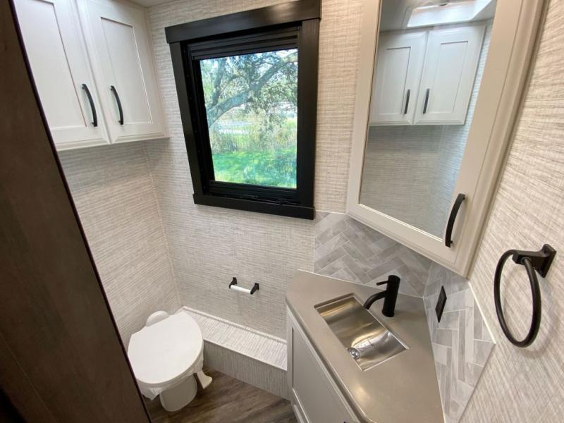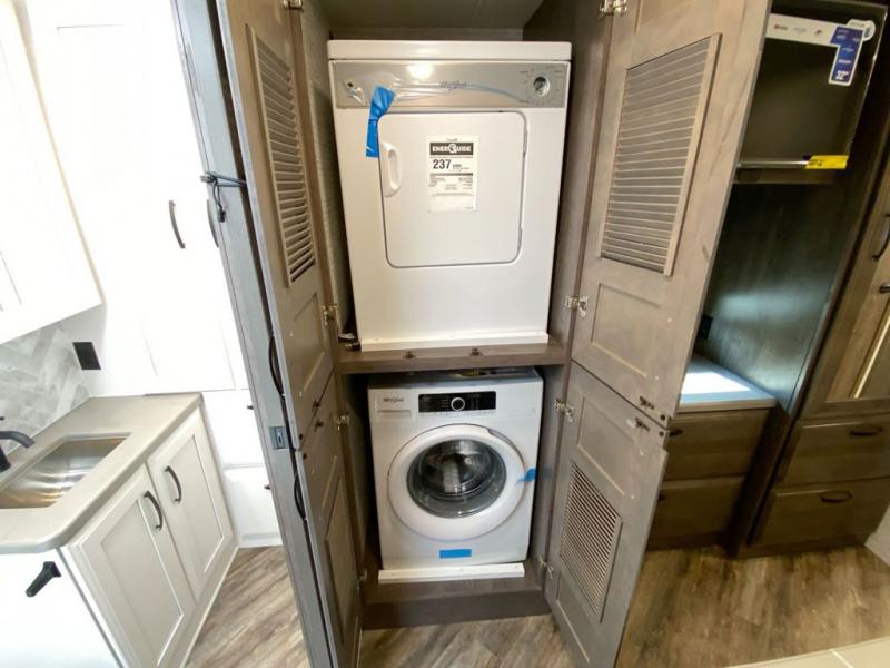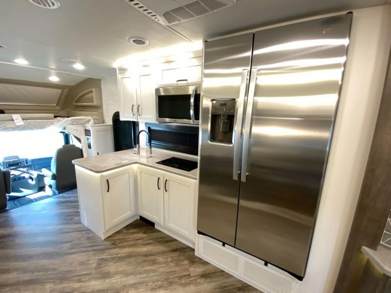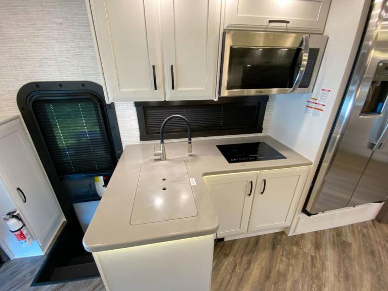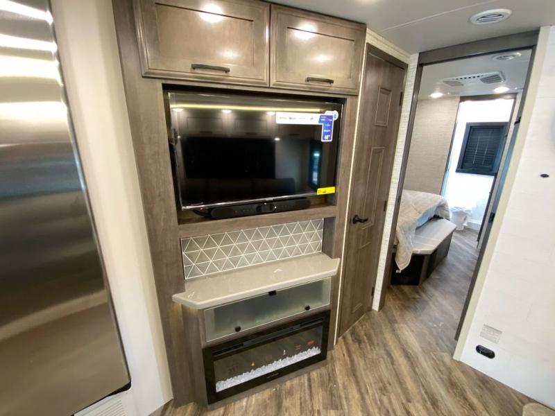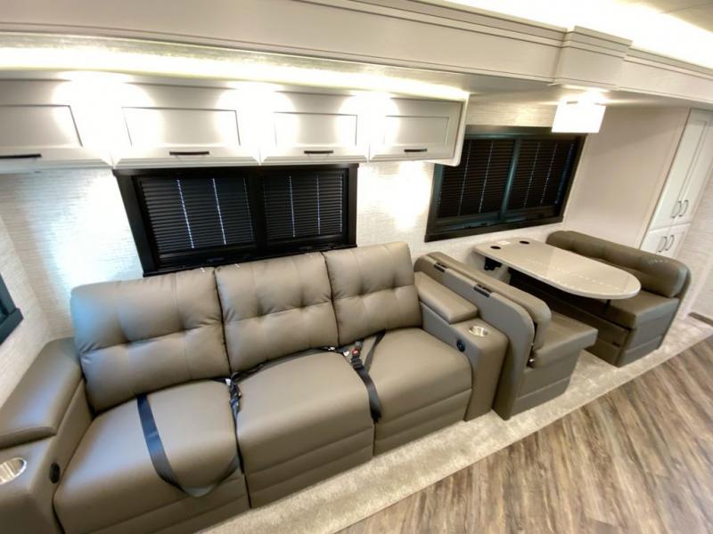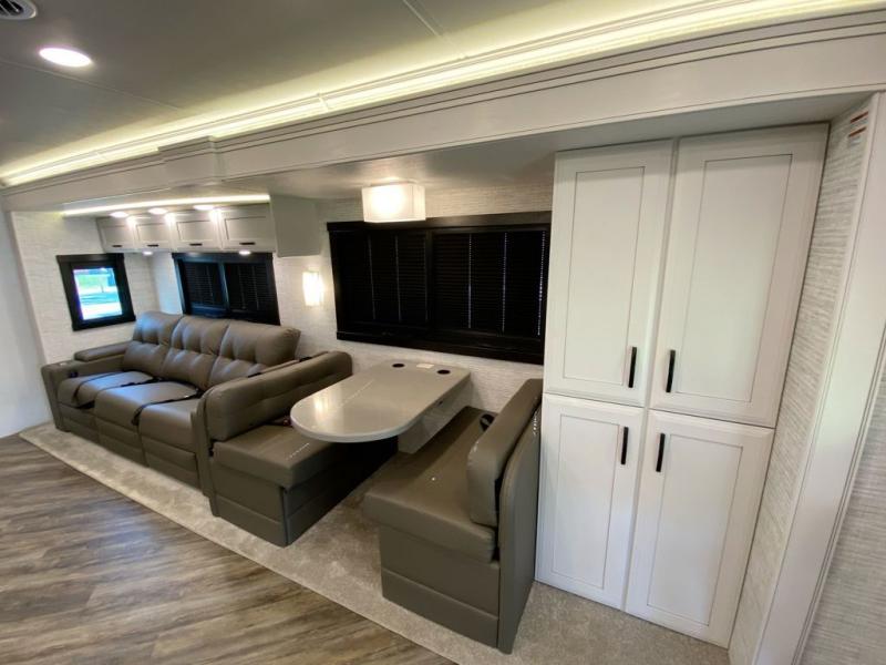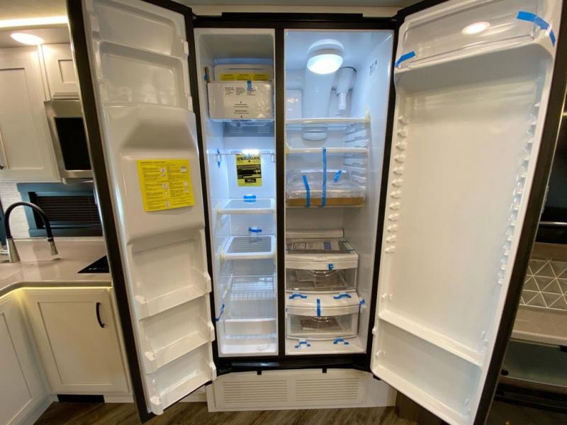 Get ready for fun adventures in this double slide out coach! Once you arrive at your destination, set up the 17' power awning with LED lights and watch the big game on the exterior LED Smart TV. You'll find plenty of seating spaces in the main living area on the 93" reclining sofa or at the booth dinette, plus there is a fireplace here and an LED HD Smart TV. The kitchen is any chef's dream with its residential refrigerator, two burner induction cooktop, and residential-size convection microwave. This model also includes a bath and a half that will come in handy when traveling with friends and family, and don't overlook the master bedroom with a power head lift king bed slide, large wardrobes, and an LED Smart TV!