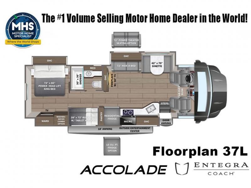 MSRP $378,152. All New Diesel Super C from Entegra Coach! The 2025 Entegra Coach Accolade for Sale at Motor Home Specialist; the #1 Volume Selling Motor Home Dealership in the World. The 37L Bunk Model is approximately 39 feet 4 inches in length and features 3 slide-out rooms including a full-wall slide, King size bed, cab over loft, Freightliner 2SRV chassis and a Cummins 6.7L ISB diesel engine with 360HP. This beautiful RV features the Customer Value Package which includes a 2000 watt pure sine inverter, generator, automatic leveling jacks, backup & sideview cameras with monitors, convection microwave, electric awning with LED lights, electric power cord reel, frameless windows, infotainment system, and EZ Drive Premier. Additional options include the slide out tray w/ electric cooler in basement, exterior blackout package, washer & dryer, customer value package and Starlink satellite. For additional details on this unit and our entire inventory including brochures, window sticker, videos, photos, reviews & testimonials as well as additional information about Motor Home Specialist and our manufacturers please visit us at MHSRV.com or call 800-335-6054. At Motor Home Specialist, we DO NOT charge any prep or orientation fees like you will find at other dealerships. All sale prices include a 200-point inspection, interior & exterior wash, detail service and a fully automated high-pressure rain booth test and coach wash that is a standout service unlike that of any other in the industry. You will also receive a thorough coach orientation with an MHSRV technician, a night stay in our delivery park featuring landscaped and covered pads with full hook-ups and much more! Read Thousands upon Thousands of 5-Star Reviews at MHSRV.com and See What They Had to Say About Their Experience at Motor Home Specialist. WHY PAY MORE? WHY SETTLE FOR LESS?