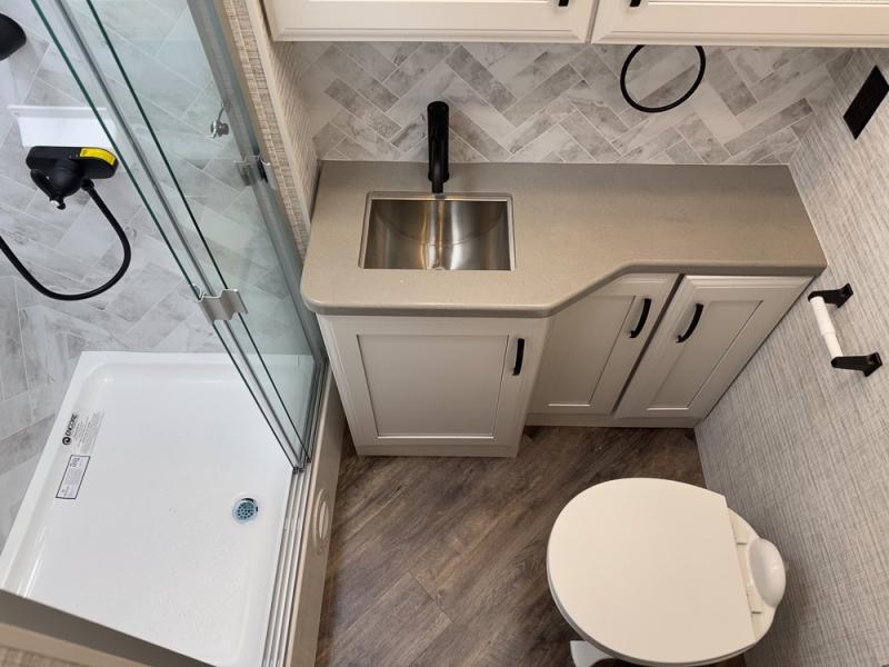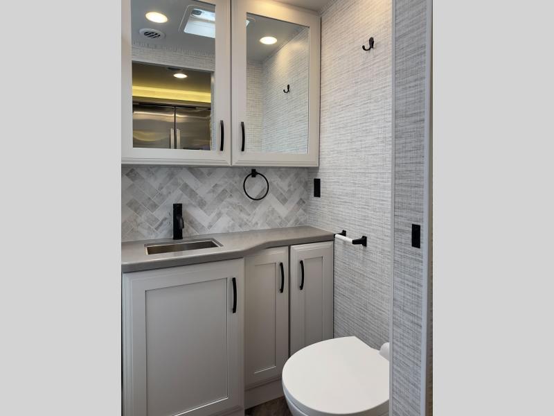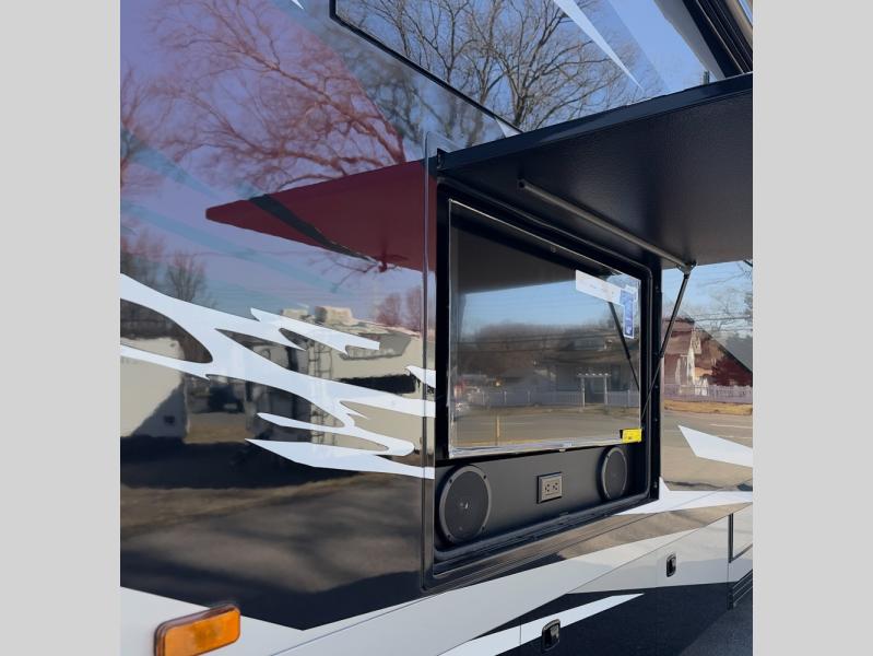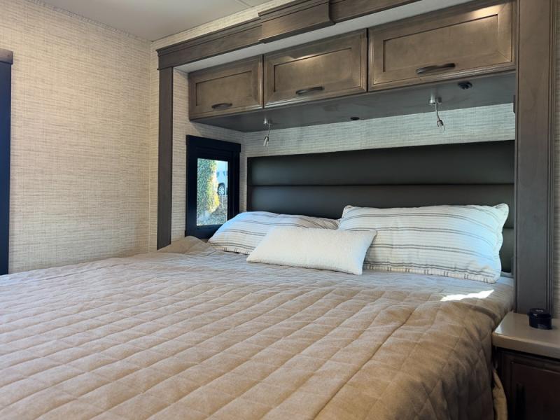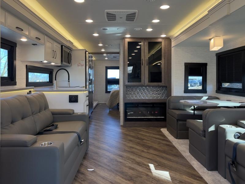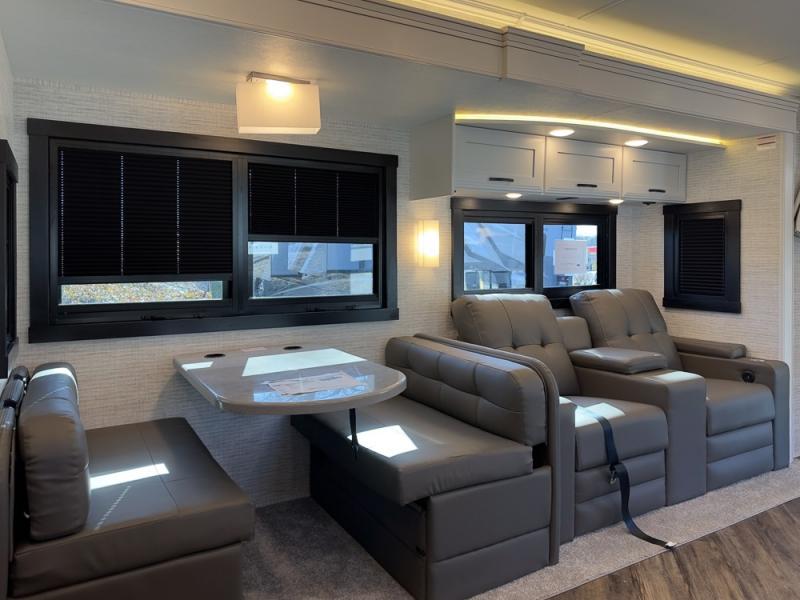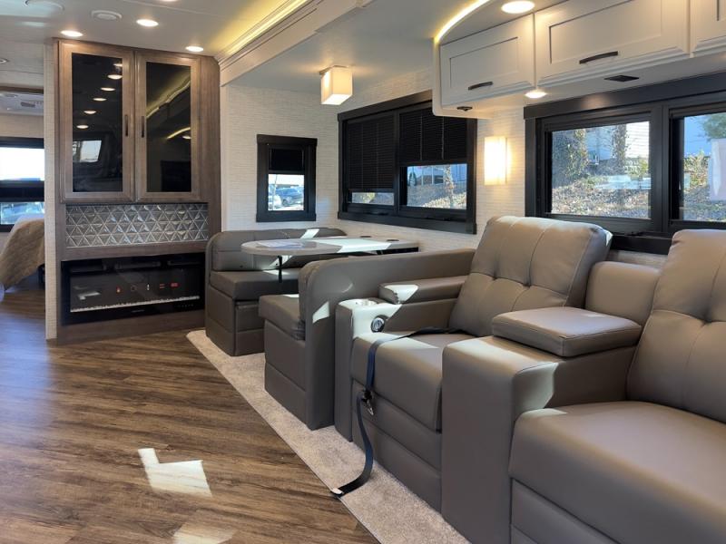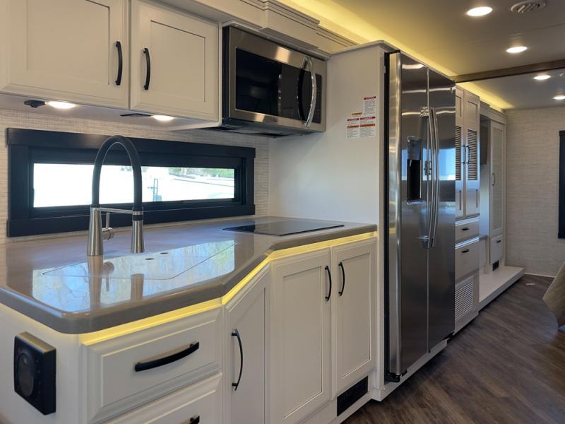 If you liked the Accolade model 37L, but don't need the extra sleeping space from the bunks, this 37M Accolade coach is perfect for you! You'll still have the cab-over bunk, the full-wall slide, and the rear private bedroom. The power head lift king bed will allow you to sit up and read at night, or you may just want to watch a movie on the bedroom LED TV. The chef of your group can prepare meals on the two burner induction cooktop, or use the residential-size convection microwave, and there is a residential refrigerator just like at home. Relaxing each day will be a breeze with the power theater seating across from the 50" TV lift and second sofa, and you can dine at the booth dinette. There is also a hutch for added storage space, and an impressive 23' power awning with LED lights!