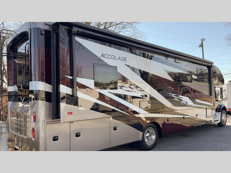 Strength and luxury come together perfectly to bring you the Accolade Super C diesel motorhome by Entegra Coach. The E-Z Drive Premier includes a computer-balanced driveshaft, a heavy-duty rear stabilizer bar, SACHS shocks, and more to provide a smooth drive. You'll be able to feel the power behind the Cummins ISB 6.7L diesel engine with 360 HP and 800 ft. lb. torque, plus each model sits on the advanced Freightliner S2RV chassis. The cockpit is every captain's dream with its Sony infotainment center, backup and side-view cameras, 6-way power driver and passenger seats, and much more. Step inside to find vinyl plank flooring, LED-lit, solid-surface kitchen countertops, and an electric fireplace to name a few comforts. The Accolade also includes many convenient amenities to make each trip enjoyable, like the water filtration system, the Winegard in-motion satellite dish, and the automatic hydraulic leveling jacks!