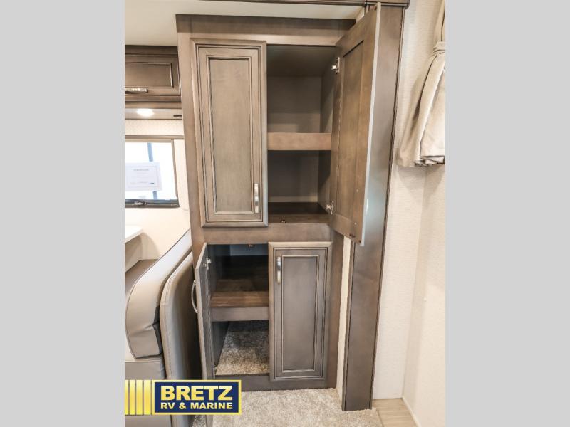You will appreciate all of the conveniences throughout this motorhome starting with the carpeted, full pass-through storage compartment with lockable slam latch doors! The cockpit has a Sony infotainment center with Apple CarPlay and Android Auto to play your favorite tunes, and a panoramic window with a power shade so you can look out at your beautiful scenery driving down the road then enjoy privacy at night. Once you have reached your destination, you can either relax on the 93" reclining sofa or enjoy a meal at the booth dinette after preparing it with the two burner induction cooktop with LED display. You can also choose an optional free-standing dinette in place of the booth dinette. A private bedroom welcomes you to enjoy a good night's rest on the king bed after showering in the 30" x 36" shower in the full rear bathroom. The bathroom also has an area prepped to add an optional washer and dryer!