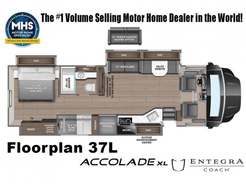MSRP $411,121. All New Luxury Diesel Super C RV from Entegra Coach! The 2025 Entegra Coach Accolade XL is now available for Sale at Motor Home Specialist; the #1 Volume Selling Motor Home Dealership in the World! The 37L Bunk Model is approximately 39 feet 4 inches in length and features 3 slide-out rooms including a full-wall slide, King size bed, cab over loft, Freightliner® S2RV chassis and a Cummins® 6.7L ISB diesel engine with 360HP. This beautiful RV features the Customer Value Package which includes a 2000 watt inverter, backup & sideview cameras with monitors, convection microwave, roof mounted awning, electric power cord reel, frameless windows, infotainment system, residential refrigerator, Aqua Hot with in-floor heat, and E-Z™ Drive Premier package that provides the superior ride and handling experience travelers have come to expect from Entegra Coach. E-Z™ Drive includes a computer-balanced driveshaft, rear air suspension, heavy-duty rear stabilizer bar, full air brakes, and SACHS brand shocks. Additional options include the stackable washer/dryer, power theater seating and Starlink RV Satellite System. The Entegra Accolade XL also boasts an impressive list of standard features including a one-piece fiberglass front cap, full pass through storage compartments with lockable latch doors, exterior entertainment center, large stainless steel sink with sink covers, solid surface countertops with decorative backsplash, water filtration system, variable geometry engine exhaust brake, Michelin® 275/80R 22.5 14 ply tires with Alcoa® aluminum rims, Allison® 3000 MH automatic transmission, TuffShell™ vacuum-bond laminated floor and sidewalls, Dual 15,000-BTU A/C unit with heat pumps, Thetford® Sani-Con Turbo Macerator system, Onan® 8,000-watt diesel generator with auto-gen start, Entrance door with industry’s largest travel-view window, roof-mounted Girard® NOVA II dual-pitched patio awning with LED lights, 9" Sony® infotainment center with Apple CarPlay® and Android Auto™, Backup and side-view cameras, High-intensity recessed LED ceiling lights, Raised-panel high-gloss hardwood cabinetry and stiles throughout with deluxe hidden hinges and much more. At Entegra Coach, excellence doesn't end with stunning interiors and superior craftsmanship. They back each luxury coach with the industry's highest level of service. Entegra Coach's industry leading 2-year limited warranty is double that of most other manufacturers and offers more coverage. For additional details on this unit and our entire inventory including brochures, window sticker, videos, photos, reviews & testimonials as well as additional information about Motor Home Specialist and our manufacturers please visit us at MHSRV.com or call 800-335-6054. At Motor Home Specialist, we DO NOT charge any prep or orientation fees like you will find at other dealerships. All sale prices include a 200-point inspection, interior & exterior wash, detail service and a fully automated high-pressure rain booth test and coach wash that is a standout service unlike that of any other in the industry. You will also receive a thorough coach orientation with an MHSRV technician, a night stay in our delivery park featuring landscaped and covered pads with full hook-ups and much more! Read Thousands upon Thousands of 5-Star Reviews at MHSRV.com and See What They Had to Say About Their Experience at Motor Home Specialist. WHY PAY MORE? WHY SETTLE FOR LESS?