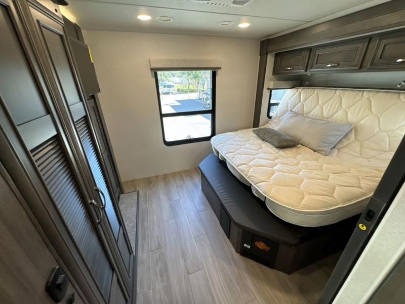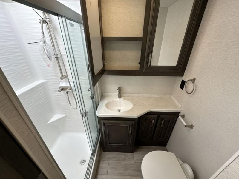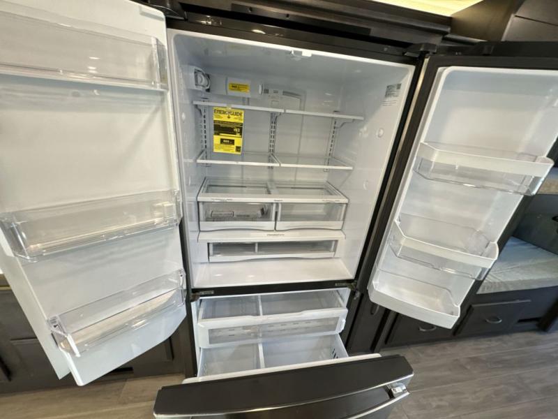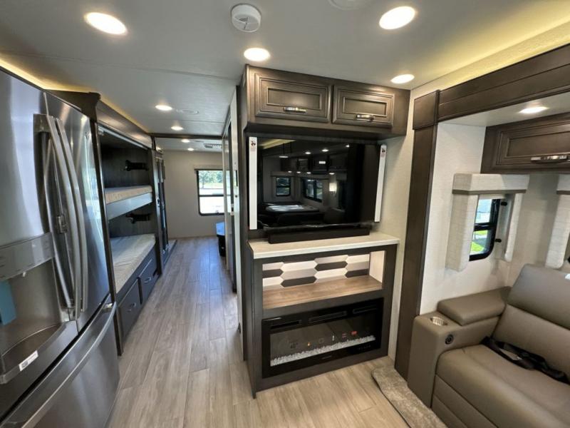 Family vacations just got sweeter in this coach with 28" x 70" bunk beds! The little ones will love having their own bunks with wall-mounted tablet holders in each, plus there is a cab-over bunk for even more sleeping space. You will have your own bedroom in the back with a king bed, a wardrobe to keep your clothes tidy, and an optional washer and dryer if you plan to go full-time. Everyone can meet in the main living area on the72" hide-a-bed sofa or at the booth dinette, and there is an LED HD Smart TV here and a fireplace for a more at-home feel. A residential refrigerator comes standard in the kitchen, as well as a pantry to store snacks and a two burner induction cooktop. The outside is just as impressive as the inside with its 18' power awning with LED lights and outside entertainment center!
