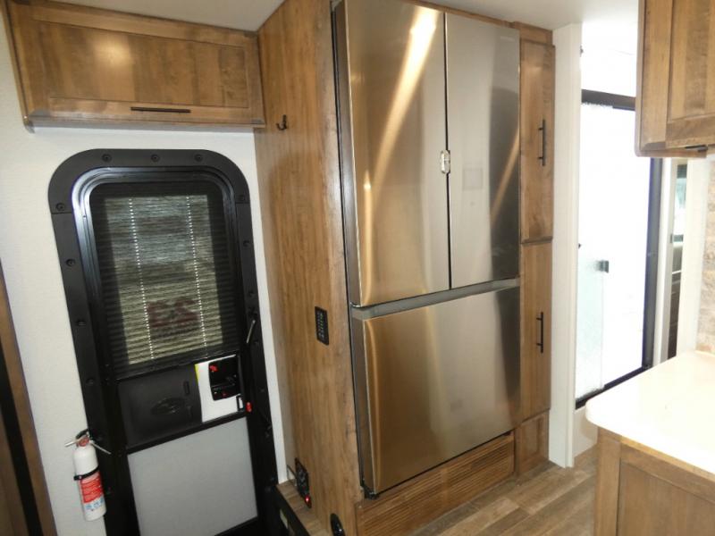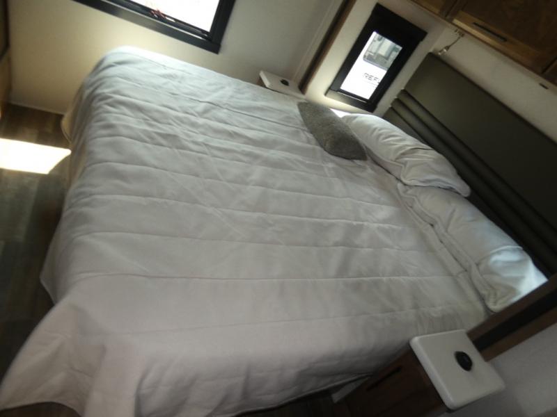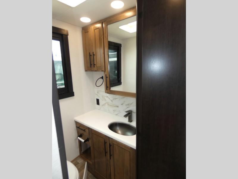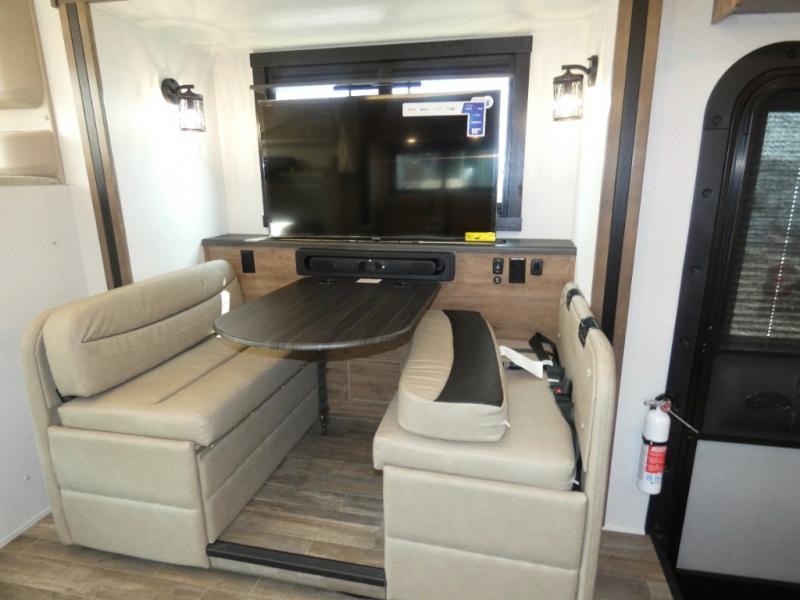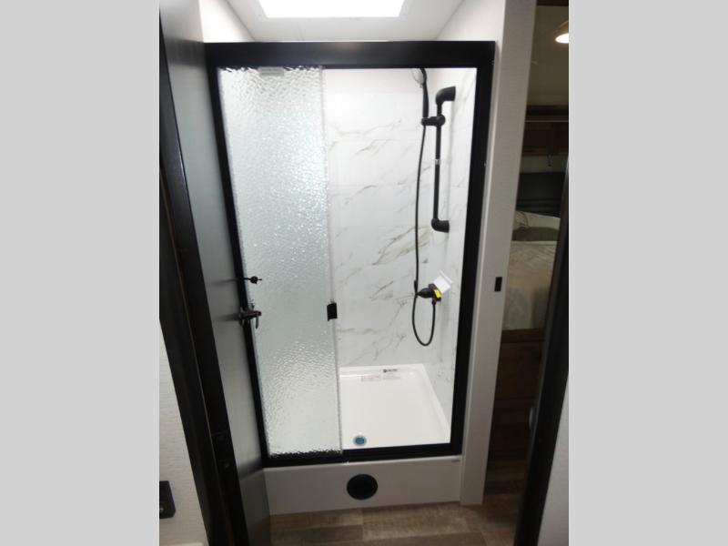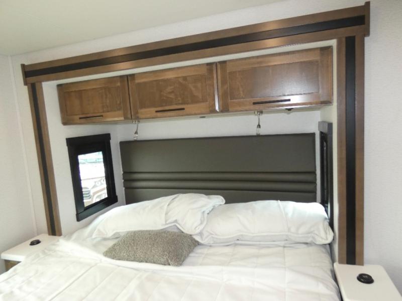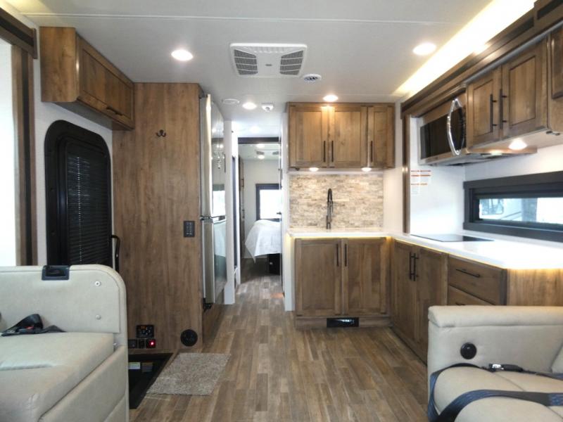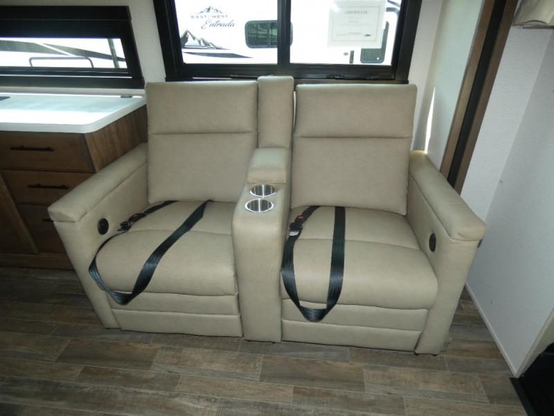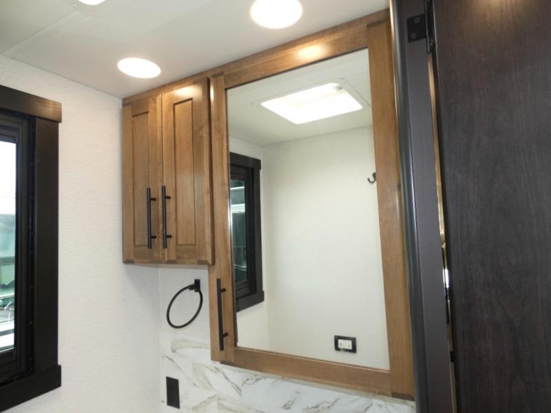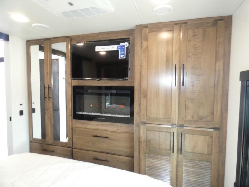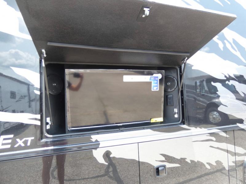 If you choose the 35L model of the Entegra Coach Accolade XT, you'll enjoy the larger chassis as it is built on the Ford F600. Experience the best of outside living with an outside entertainment center including a Smart TV and a Bluetooth receiver so you can stream all your favorite songs and shows. The 17' awning will keep you cool under the sun. Inside you will enjoy even more comforts like a full rear bedroom with its own TV and fireplace. The bedroom storage unit also includes a wardrobe and space for a washer/dryer combo. A split center bath means the shower is across the hall from the toilet and sink for extra convenience.