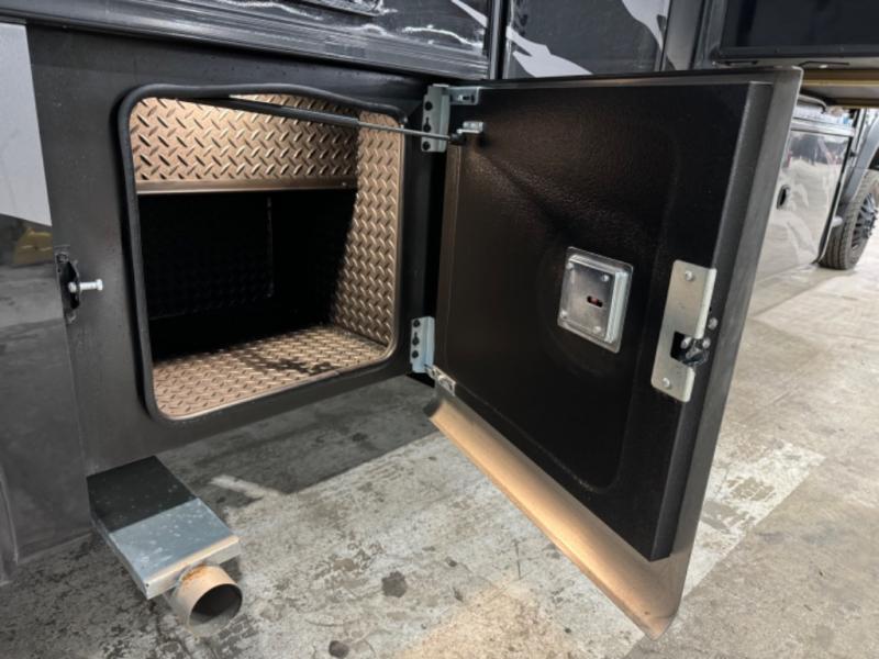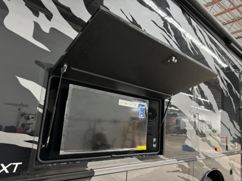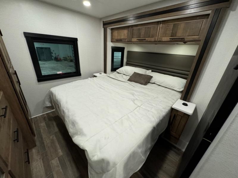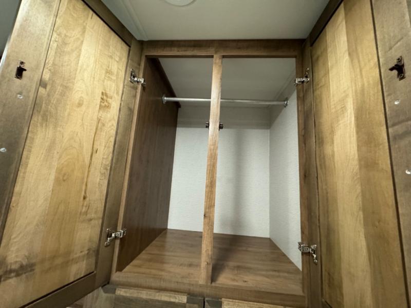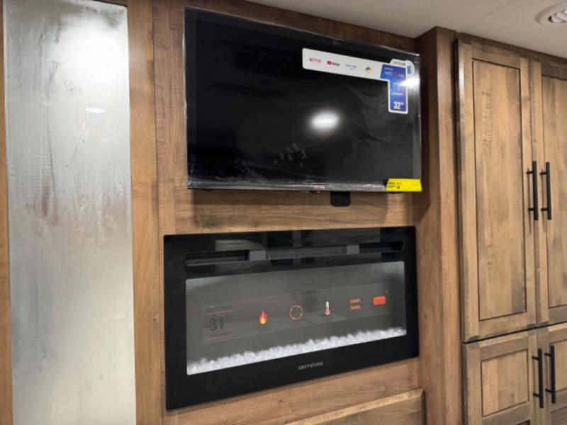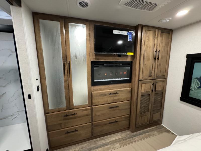 Head across the country in this coach for six to seven! Experience the best of outside living with an outside entertainment center including a Smart TV and a Bluetooth receiver so you can stream all your favorite songs and shows. The 17' awning will keep you cool under the sun. Inside you will enjoy even more comforts like a full rear bedroom with its own TV and fireplace. The bedroom storage unit also includes a wardrobe and space for an optional washer/dryer combo. A split center bath means the shower is across the hall from the toilet and sink for extra convenience.