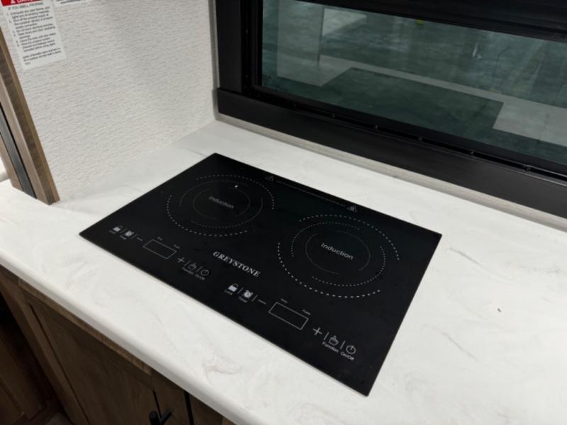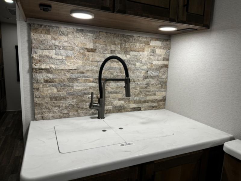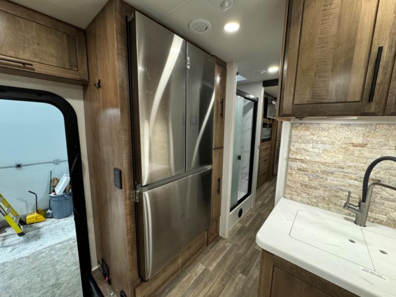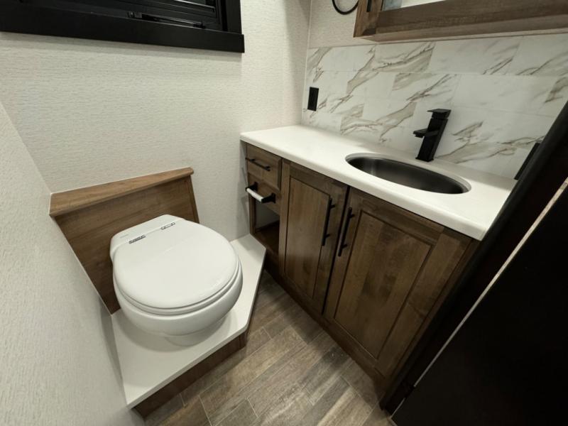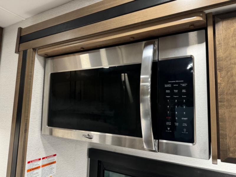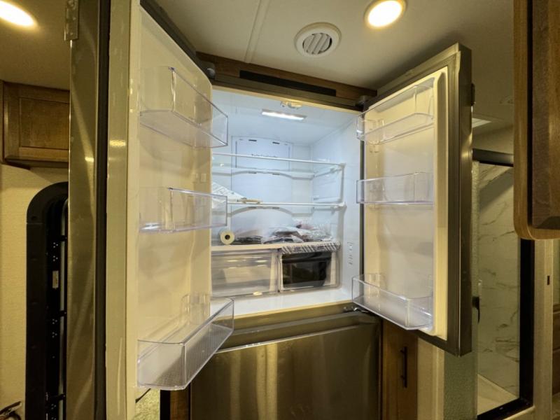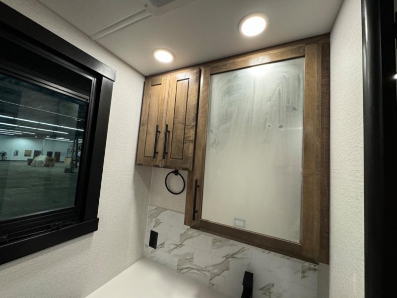Head across the country in this coach for six to seven! Experience the best of outside living with an outside entertainment center including a Smart TV and a Bluetooth receiver so you can stream all your favorite songs and shows. The 17' awning will keep you cool under the sun. Inside you will enjoy even more comforts like a full rear bedroom with its own TV and fireplace. The bedroom storage unit also includes a wardrobe and space for an optional washer/dryer combo. A split center bath means the shower is across the hall from the toilet and sink for extra convenience.