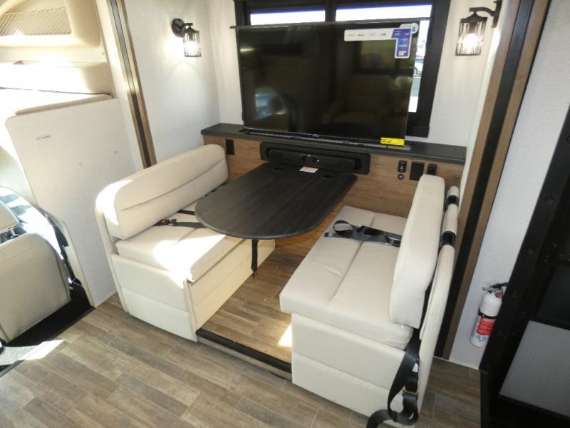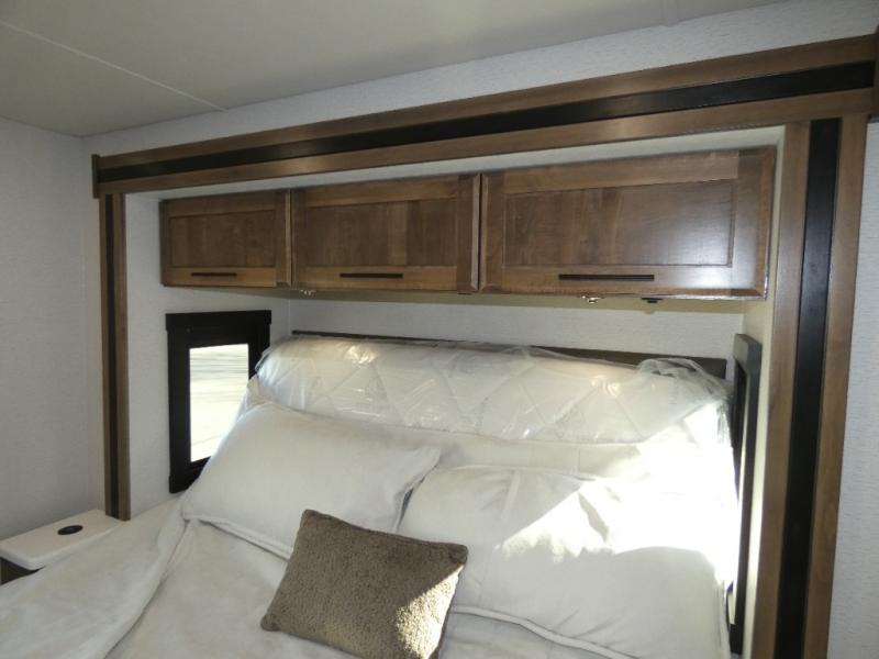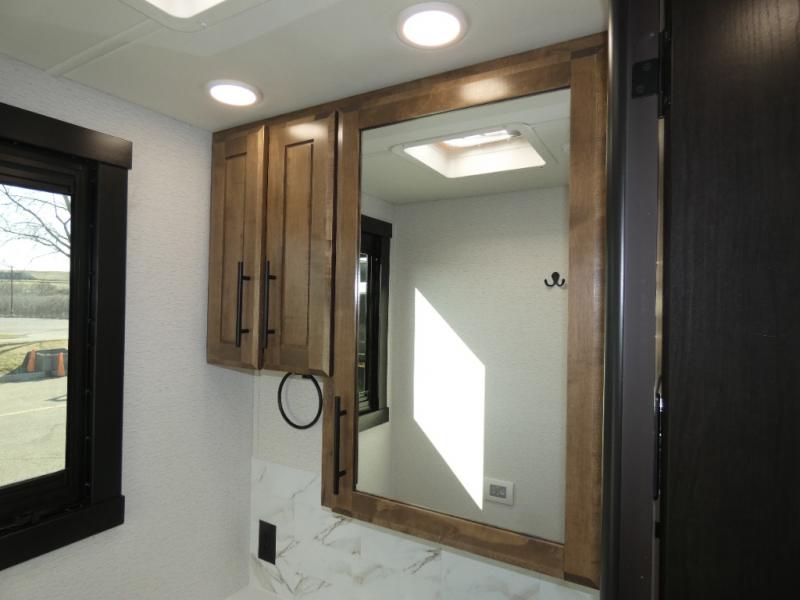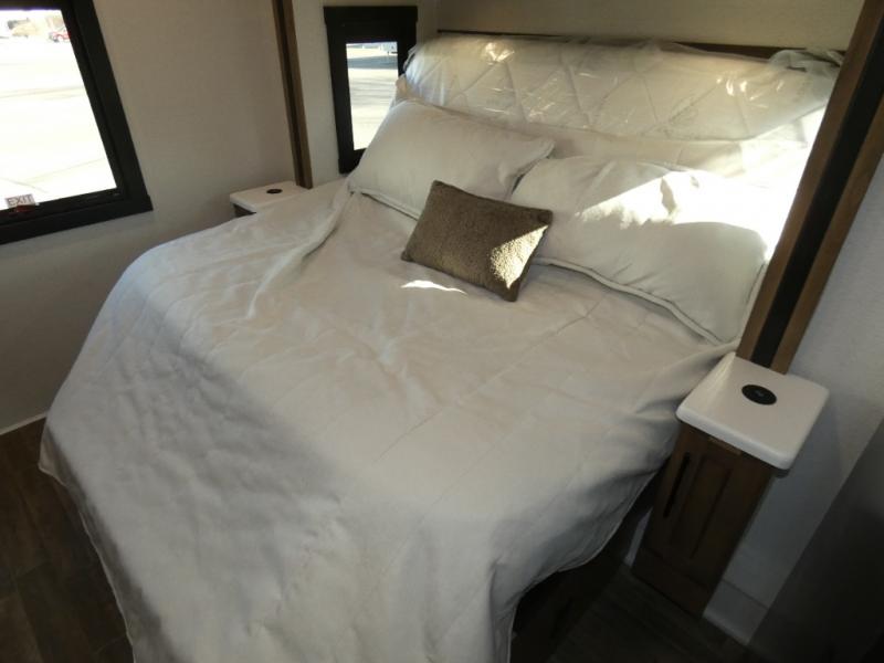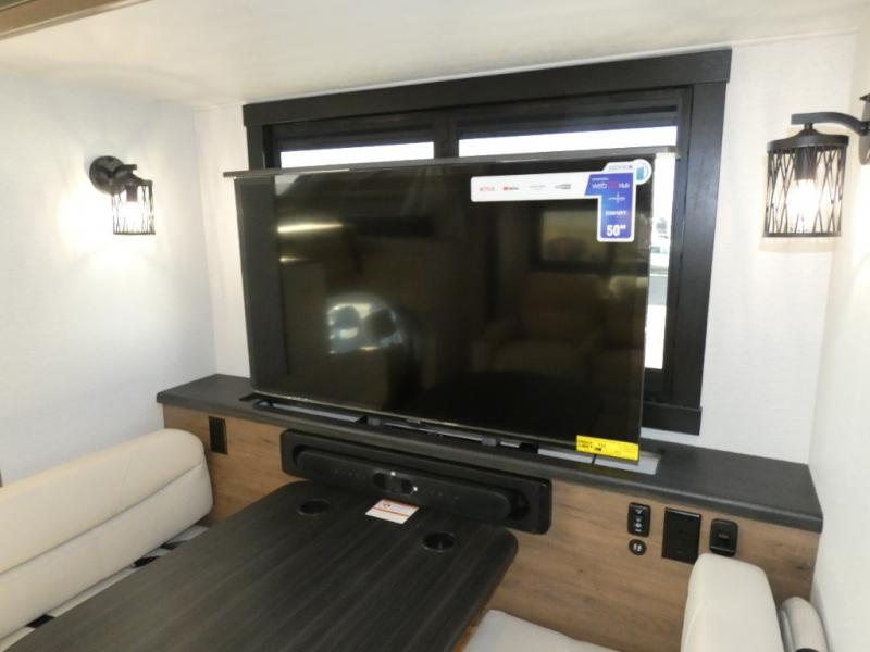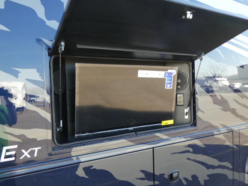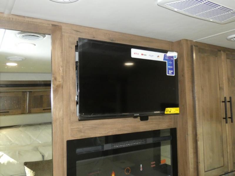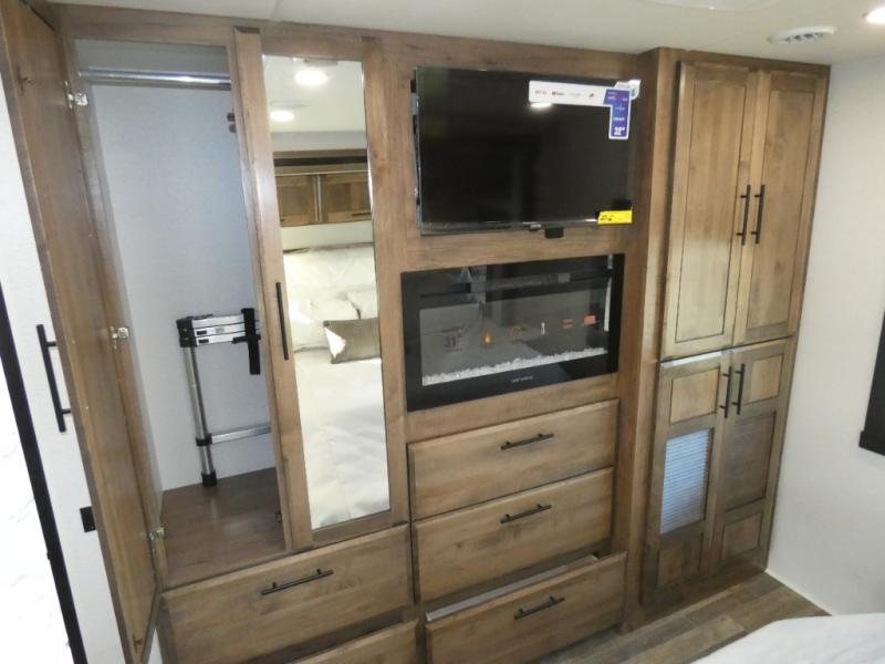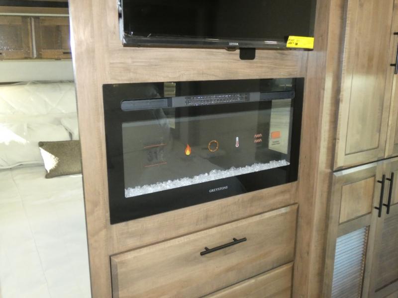 Head across the country in this coach for six to seven! Experience the best of outside living with an outside entertainment center including a Smart TV and a Bluetooth receiver so you can stream all your favorite songs and shows. The 17' awning will keep you cool under the sun. Inside you will enjoy even more comforts like a full rear bedroom with its own TV and fireplace. The bedroom storage unit also includes a wardrobe and a split center bath means the shower is across the hall from the toilet and sink for extra convenience.