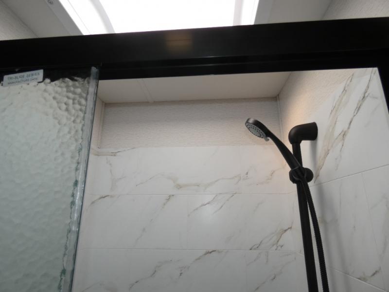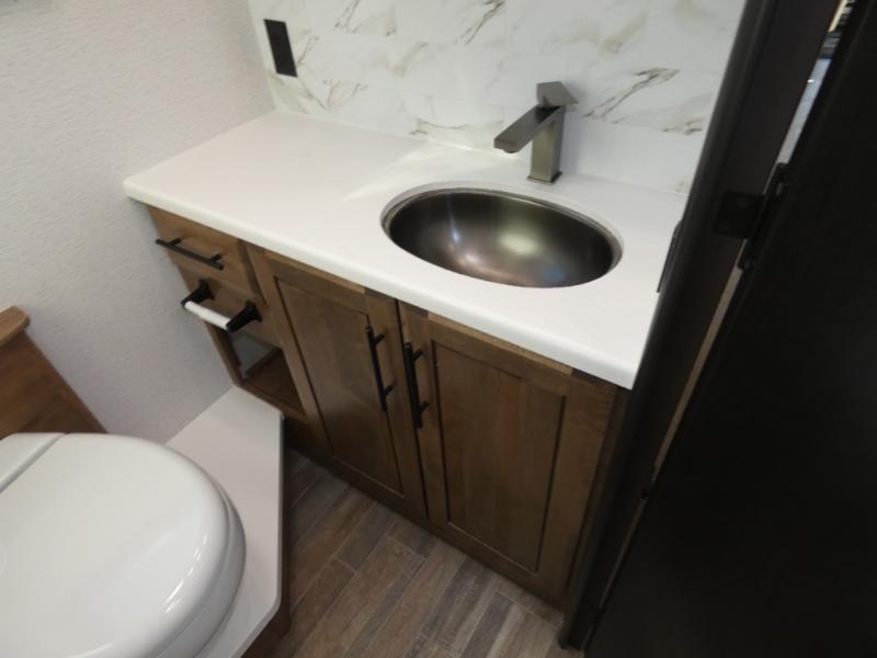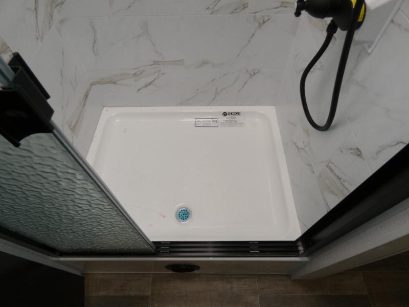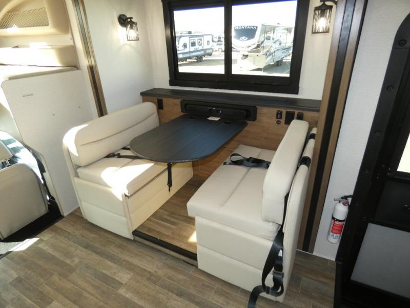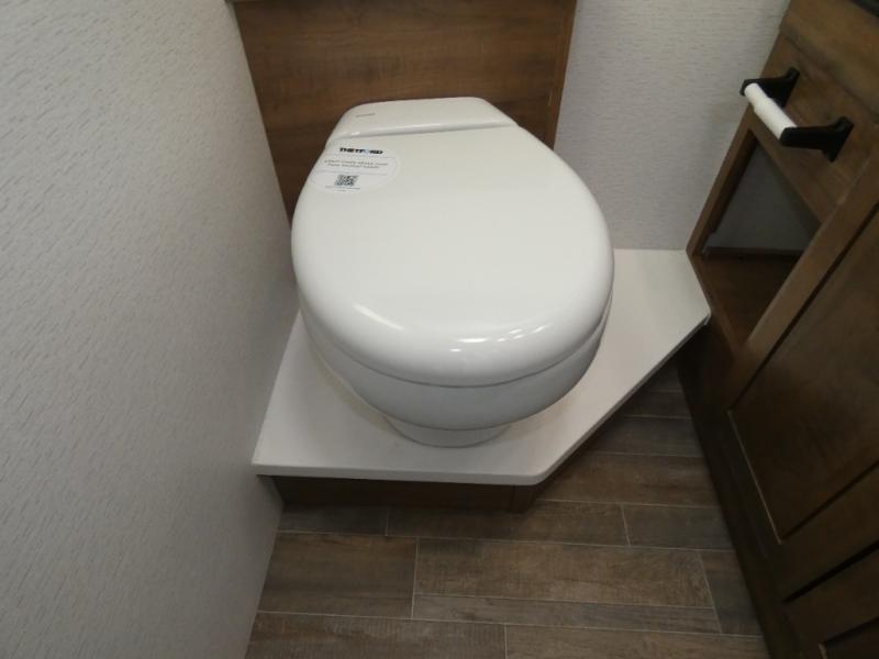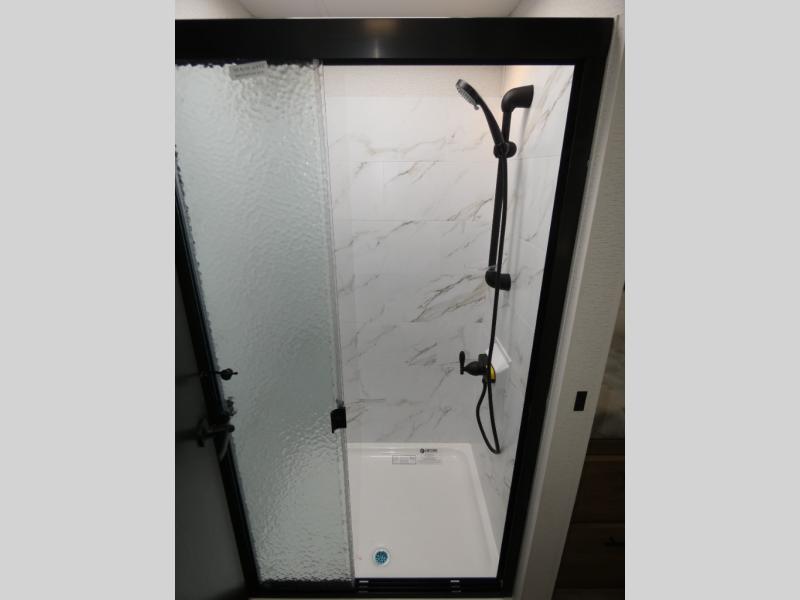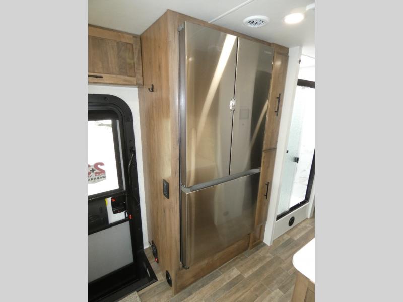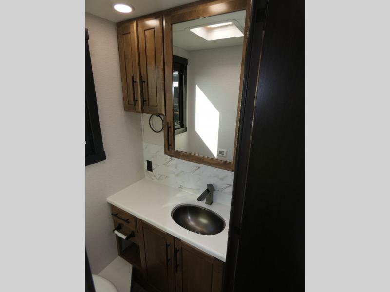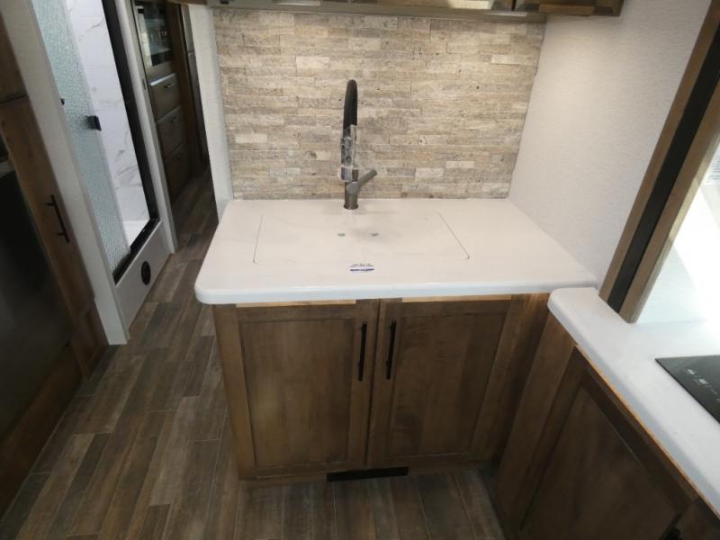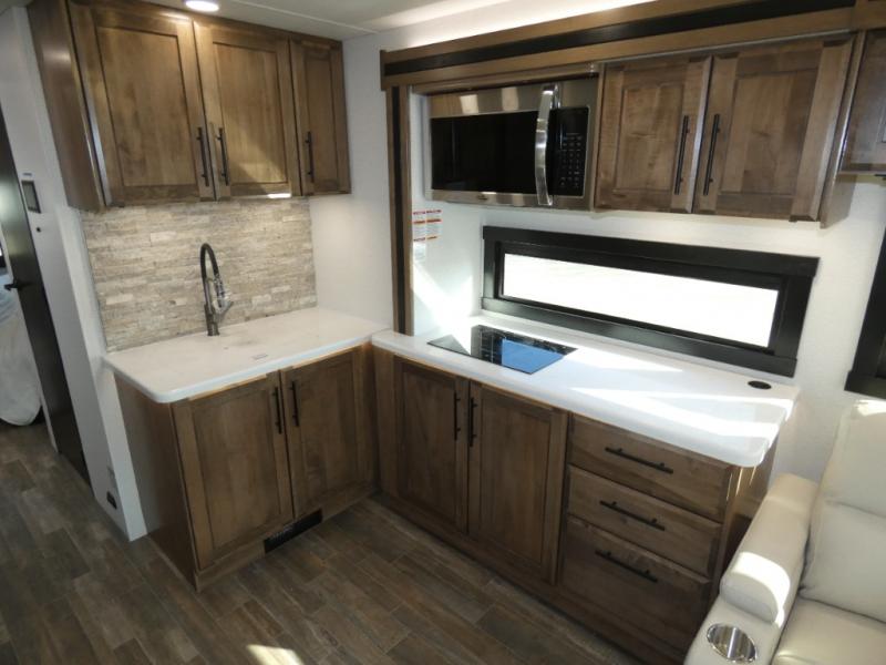Head across the country in this coach for six to seven! Experience the best of outside living with an outside entertainment center including a Smart TV and a Bluetooth receiver so you can stream all your favorite songs and shows. The 17' awning will keep you cool under the sun. Inside you will enjoy even more comforts like a full rear bedroom with its own TV and fireplace. The bedroom storage unit also includes a wardrobe and a split center bath means the shower is across the hall from the toilet and sink for extra convenience.