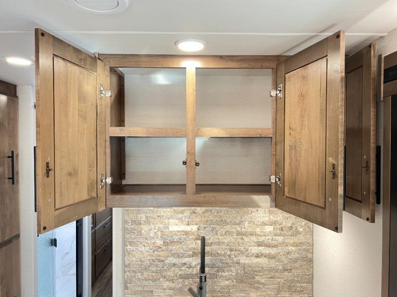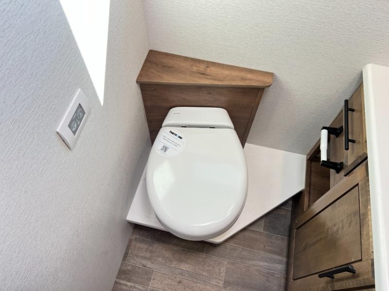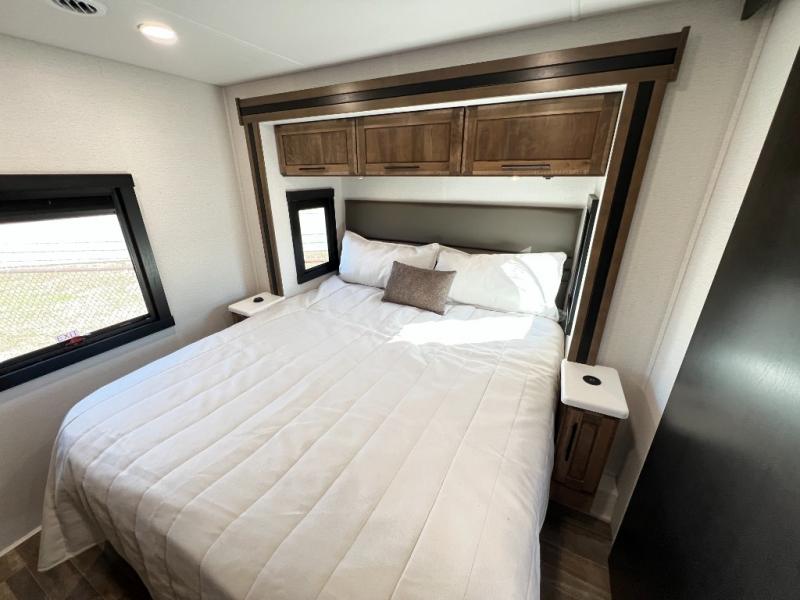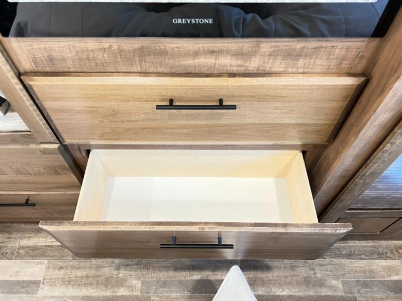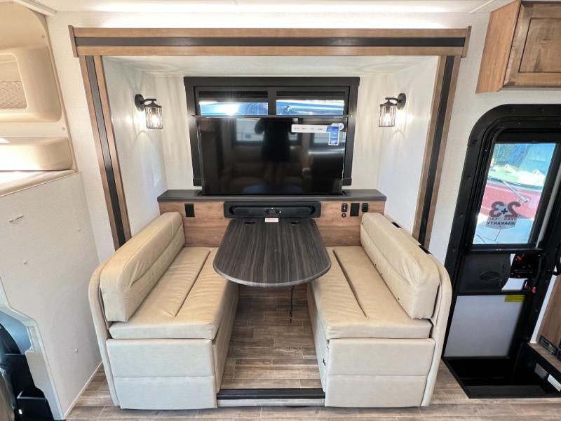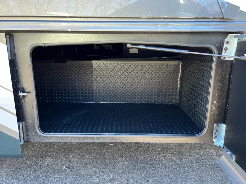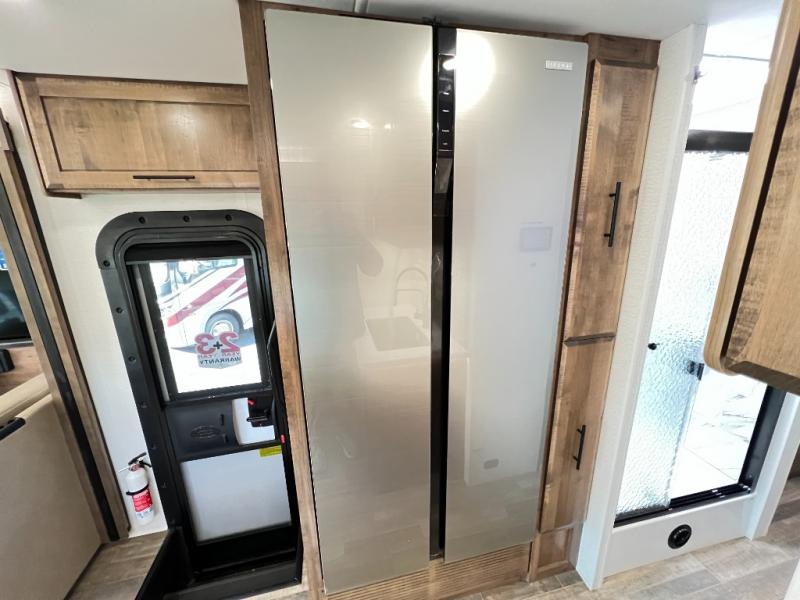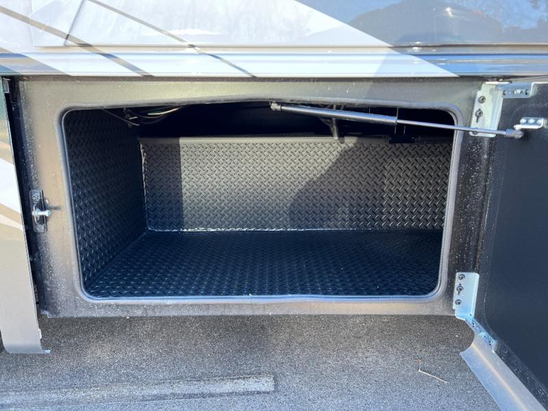 Head across the country in this coach for six to seven! Experience the best of outside living with an outside entertainment center including a Smart TV and a Bluetooth receiver so you can stream all your favorite songs and shows. The 17' awning will keep you cool under the sun. Inside you will enjoy even more comforts like a full rear bedroom with its own TV and fireplace. The bedroom storage unit also includes a wardrobe and space for an optional washer/dryer combo. A split center bath means the shower is across the hall from the toilet and sink for extra convenience.