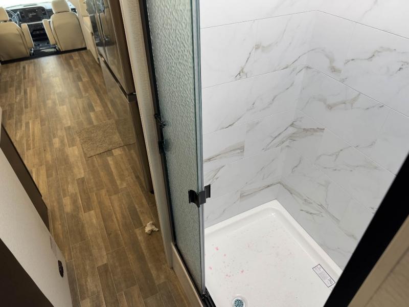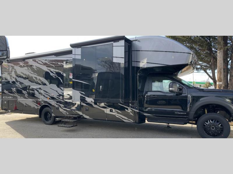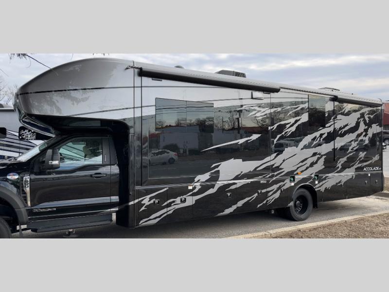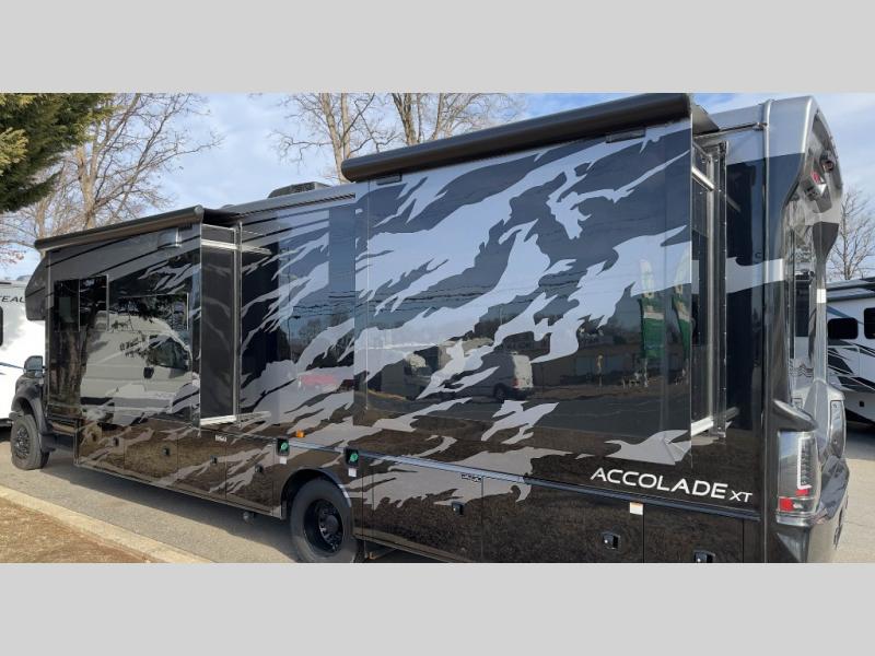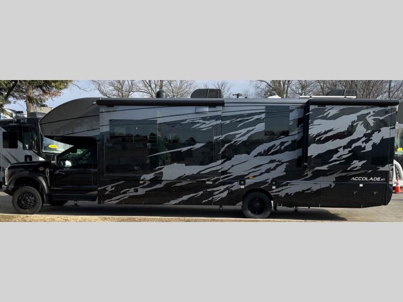 You'll have grand adventures in the Accolade XT Super C diesel motorhome. The Ford 4X4 chassis can tackle difficult roads, but with the E-Z Drive Premier, you'll enjoy a combination of features that make your ride more comfortable, including a computer-balanced driveshaft, front and rear heavy-duty stabilizer bars, and Koni® shocks. The convenience continues into the cockpit, where you'll find an 8-way power driver seat and the Ford® SYNC® 4 infotainment center to cover all your entertainment needs. The Firefly Multiplex command center lets you operate multiple systems, even from a mobile device. Inside, you'll enjoy integrated day/night cassette shades, LED-lit solid surface kitchen countertops, large bedroom wardrobes, and a decorative shower surround with a glass door to name a few comforts!