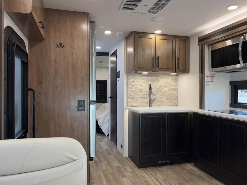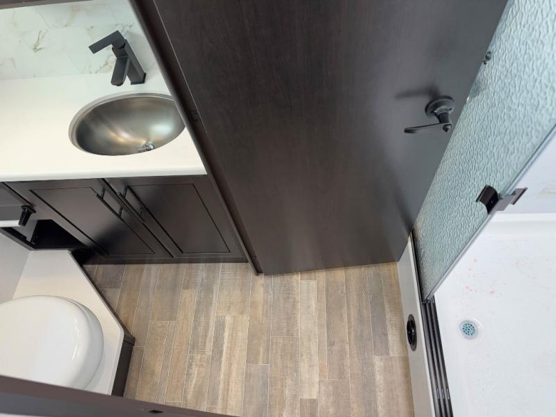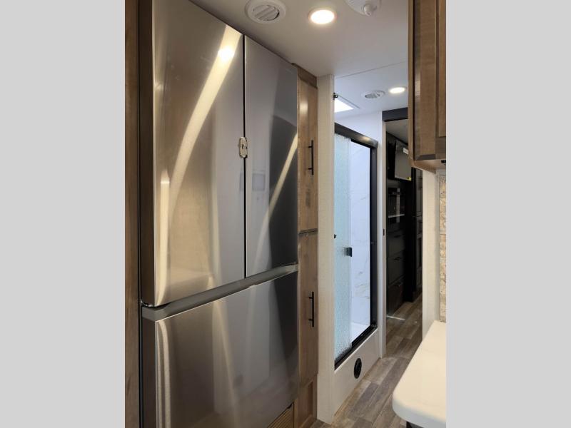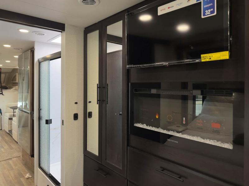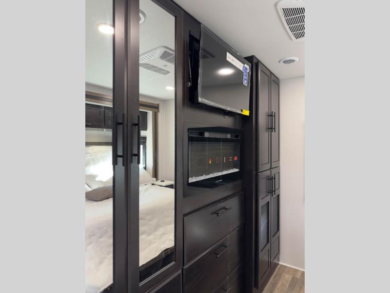Head across the country in this coach for six to seven! Experience the best of outside living with an outside entertainment center including a Smart TV and a Bluetooth receiver so you can stream all your favorite songs and shows. The 17' awning will keep you cool under the sun. Inside you will enjoy even more comforts like a full rear bedroom with its own TV and fireplace. The bedroom storage unit also includes a wardrobe and space for an optional washer/dryer combo. A split center bath means the shower is across the hall from the toilet and sink for extra convenience.