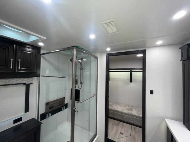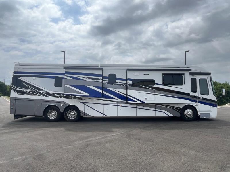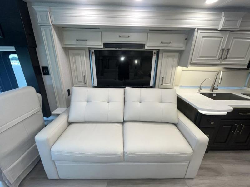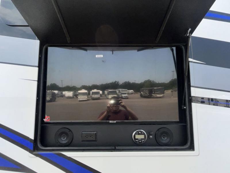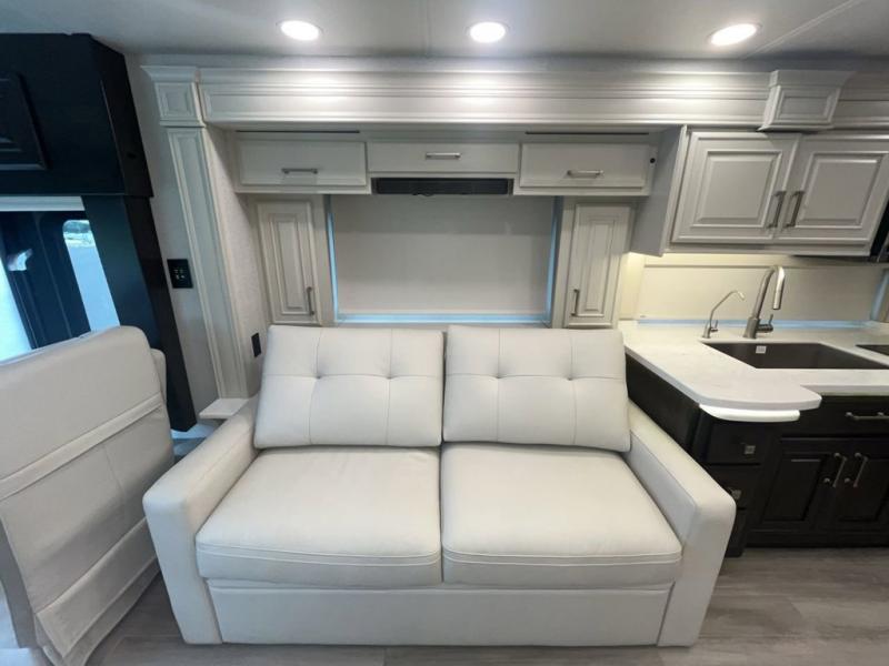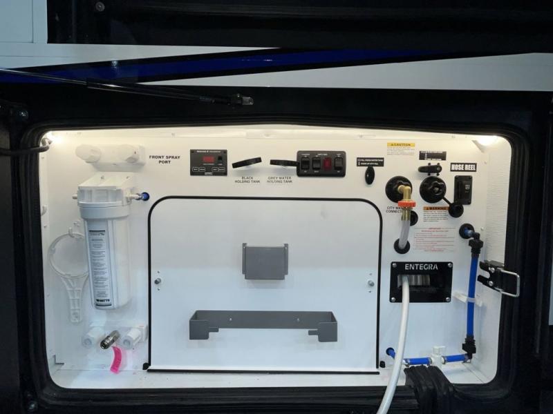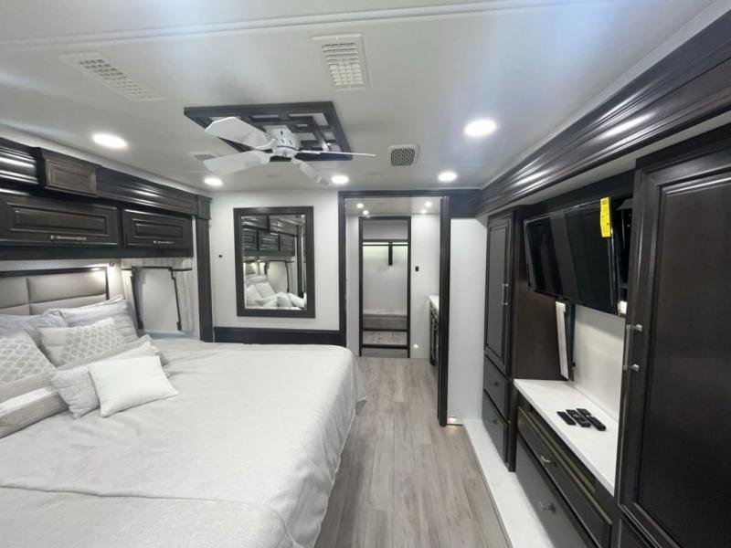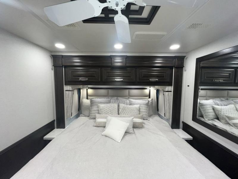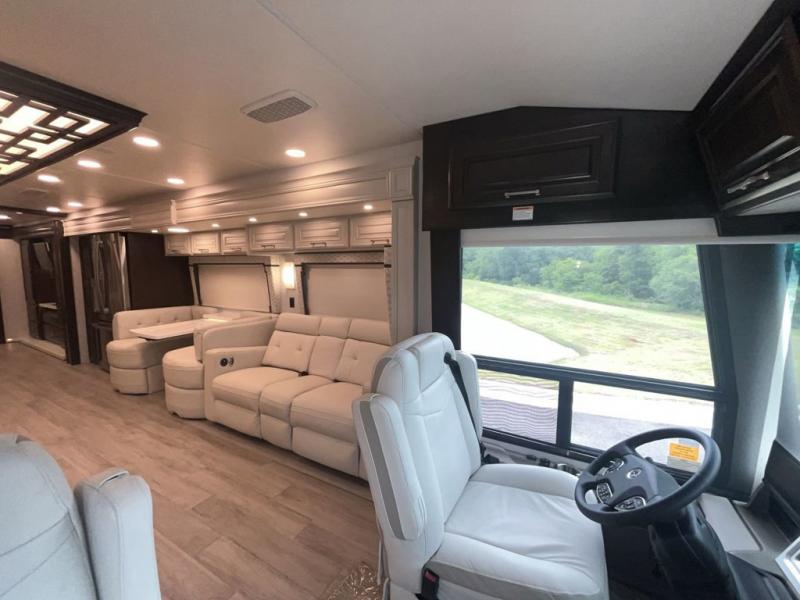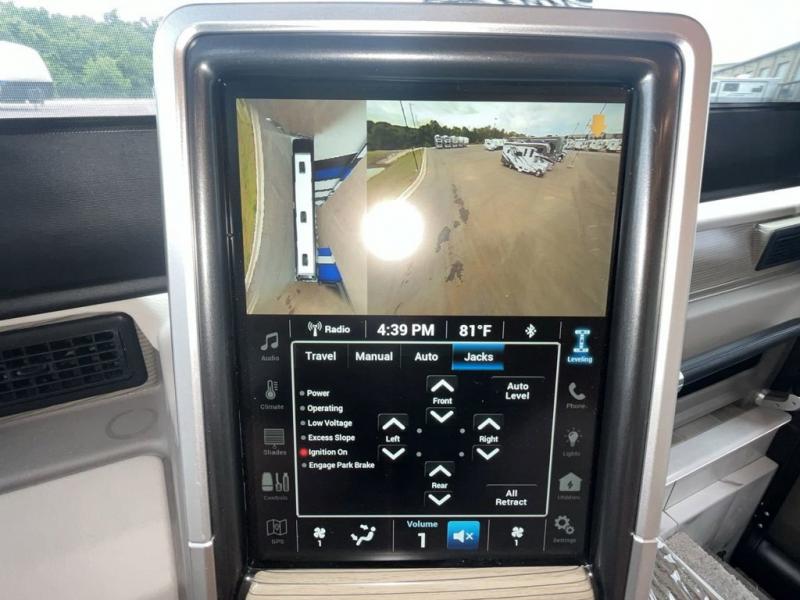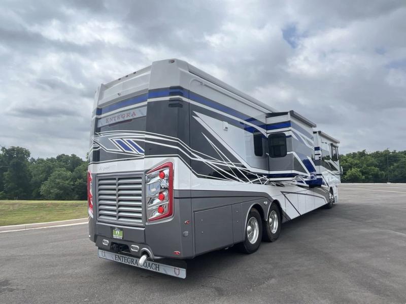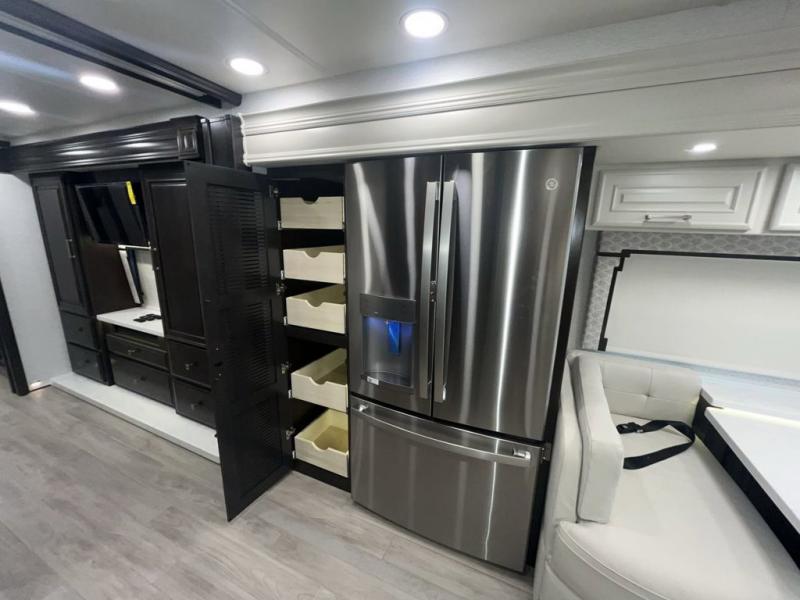 With any Anthem Class A diesel motorhome by Entegra Coach, setting up camp has never been easier with the 15-inch digital dash displaying an integrated 360-degree surround view system with fourteen smart radar sensors and six HD cameras plus the Valid air leveling system. Each roof is constructed with arched aluminum trusses filled with batt insulation and reflective Flexfoil topped with plywood decking then one-piece fiberglass, exterior walls with Aluma-Tru welded tubular aluminum studs, insulated front and rear caps, and X-Bridge bracing welded into the chassis frame. The interior provides the Firefly multiplex system with 10-inch VegaTouch touchscreen for complete integration of the coach controls with remote monitoring and control from the available mobile app, a decorative ceiling feature with integrated accent lighting, powered solar day and blackout night shades, and Aire-Secure travel locks for all pocket doors. There are also three new decor options, a portable Shark vacuum cleaner, and a Splendide stackable washer and dryer that will take up less space!