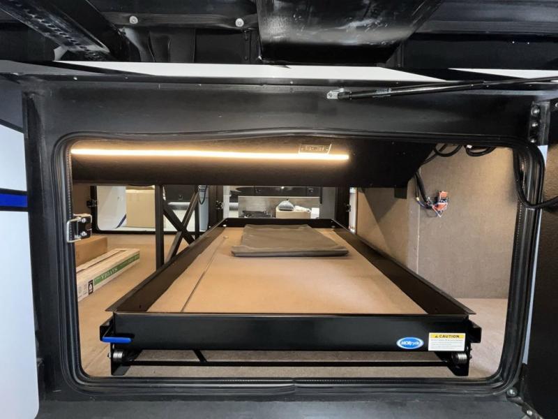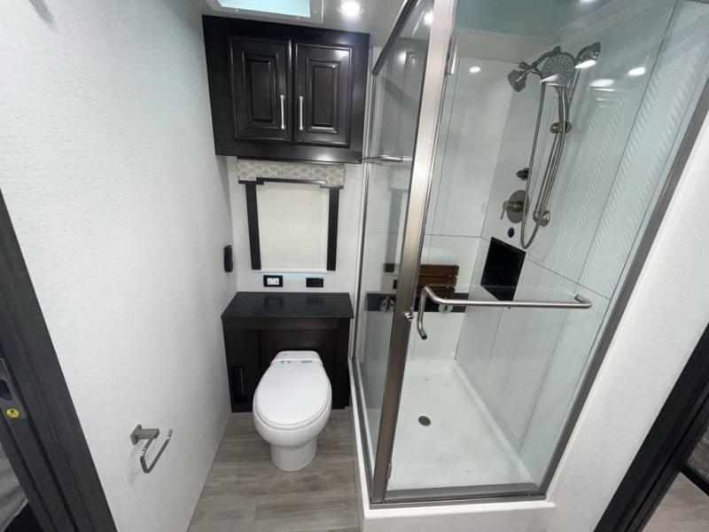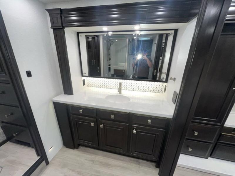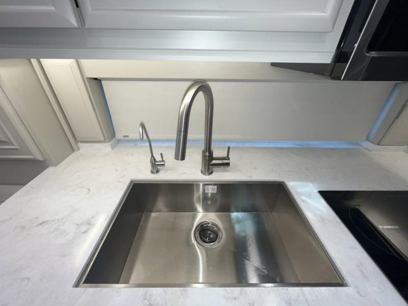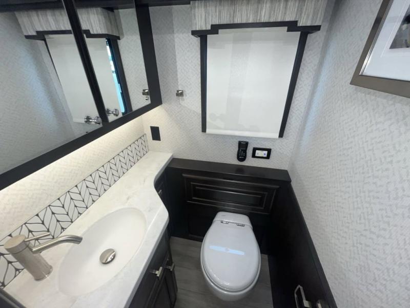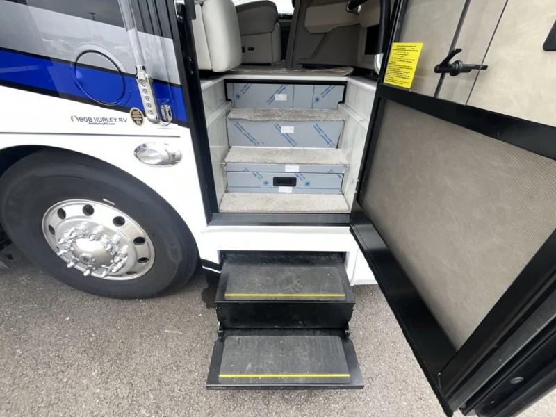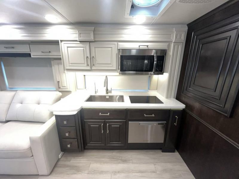 Comfortable traveling and living can be found in this coach with a master suite that includes a slide out king bed, dual wardrobes, drawers for storage and a 32" Smart TV, plus a full bathroom with a dual sink vanity. There is also a huge walk-in wardrobe with more storage areas plus a washer and dryer to keep everything clean while away. There is a mid-coach half bath for convenience, and the combined living and kitchen area offers full kitchen amenities such as a convection microwave, a Fisher & Paykel dishwasher, slide-out storage trays in the overhead cabinet, a buffet/table and two chairs to dine or work from. You'll also enjoy power theater seating while watching one of two Smart TVs in this area, plus a hide-a-bed sofa. There are options to change out the furniture if you wish such as a booth dinette, a 74" sofa with ottomans, and/or another hide-a-bed sofa with the desk/fireplace entertainment center option.
