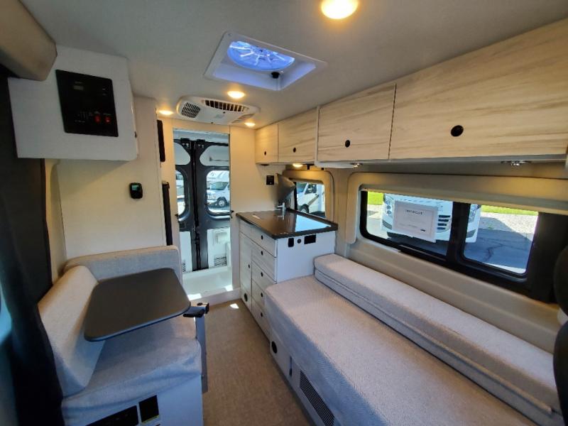 Any trip in this camper van will be spent in comfort thanks to the convenient wet bath and full kitchen amenities. You can whip up a hearty breakfast on the portable induction cooktop or use the microwave oven. There is a stainless steel sink with a cover for more prep space, and the pressed countertops will be easy to clean. After you've hiked for the day and gotten cleaned up in the rear wet bath, you can relax on the 54" sofa that will convert to a 54" x 72" bed. There is also a 27" bench seat for more seating space, overhead cabinets for storage, and an overhead TV to keep you entertained.