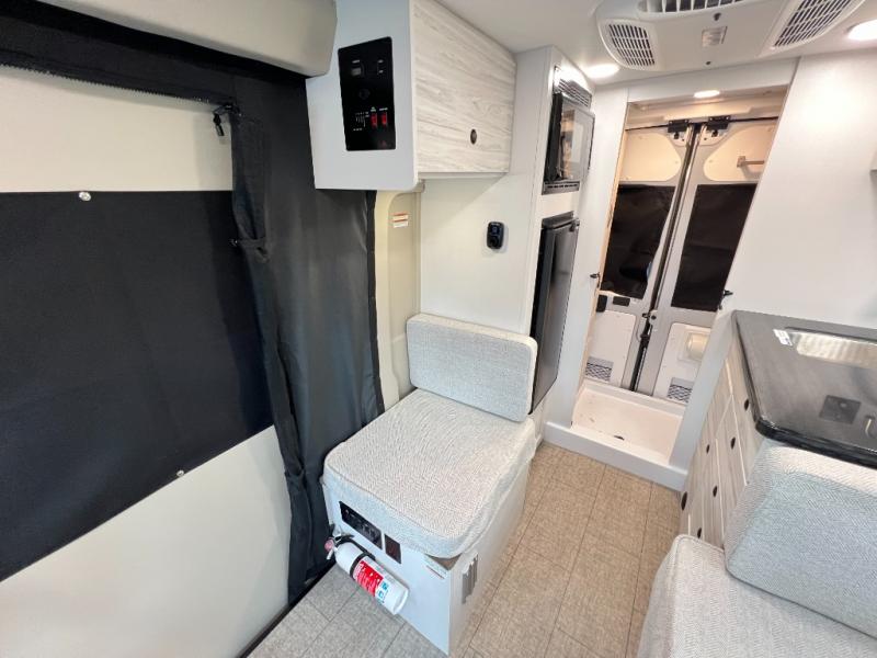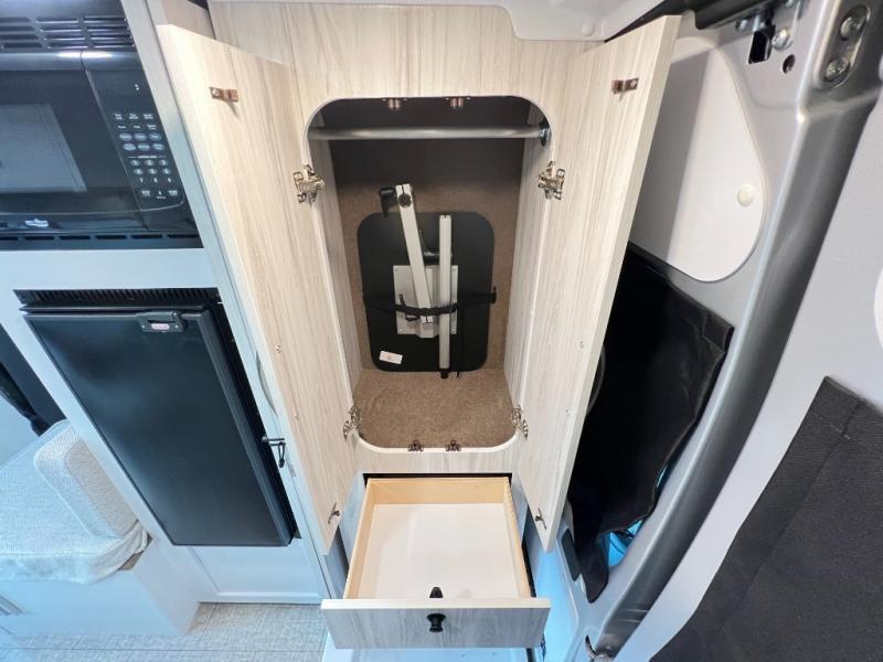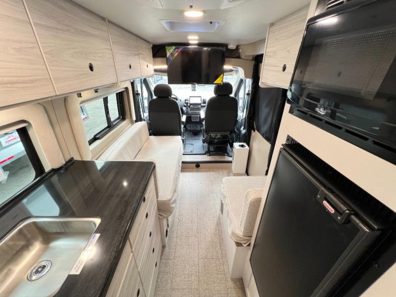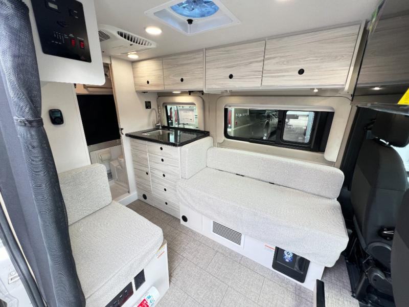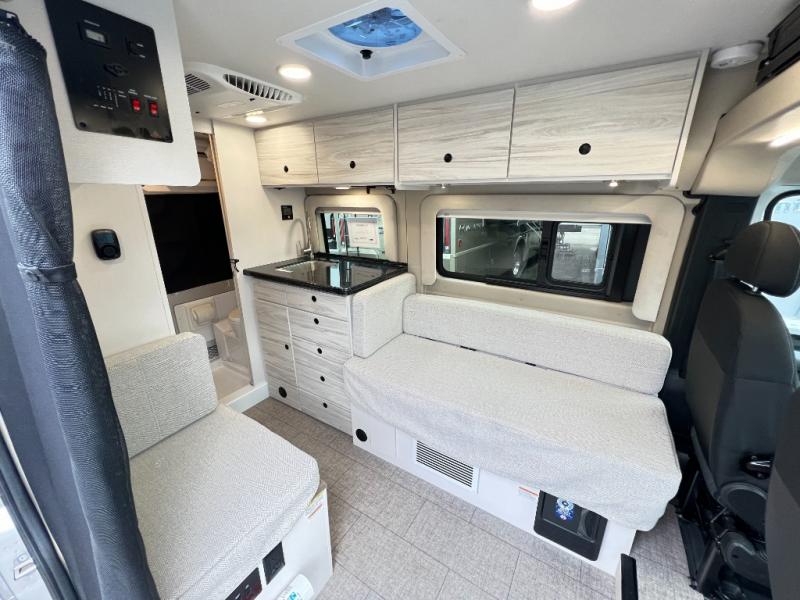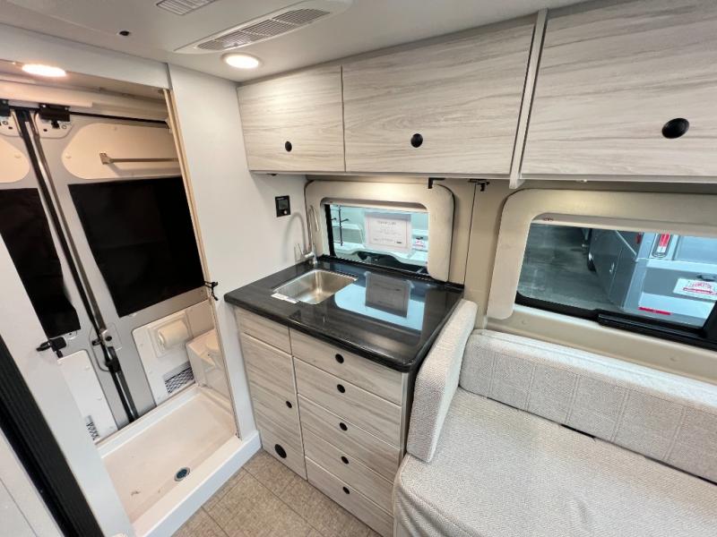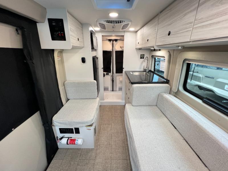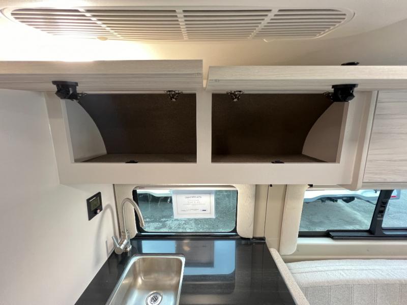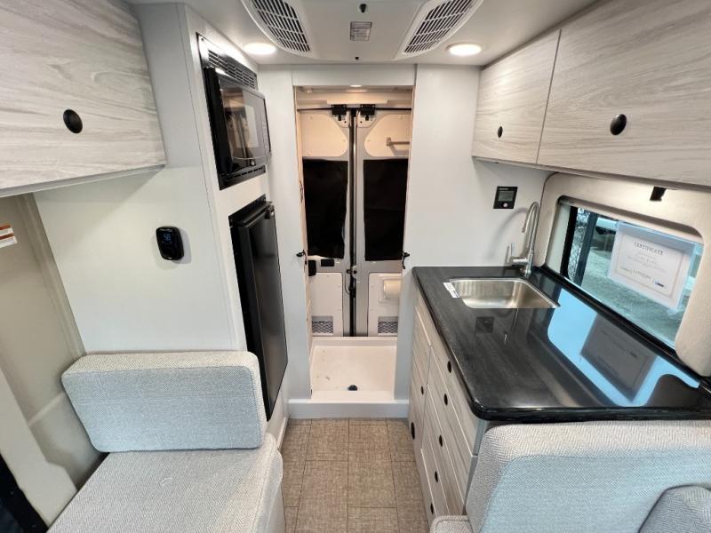 Any trip in this camper van will be spent in comfort thanks to the convenient wet bath and full kitchen amenities. You can whip up a hearty breakfast on the portable induction cooktop or use the microwave oven. There is a stainless steel sink with a cover for more prep space, and the pressed countertops will be easy to clean. After you've hiked for the day and gotten cleaned up in the rear wet bath, you can relax on the 54" sofa that will convert to a 54" x 72" bed. There is also a 27" bench seat for more seating space, overhead cabinets for storage, and an overhead TV to keep you entertained.
