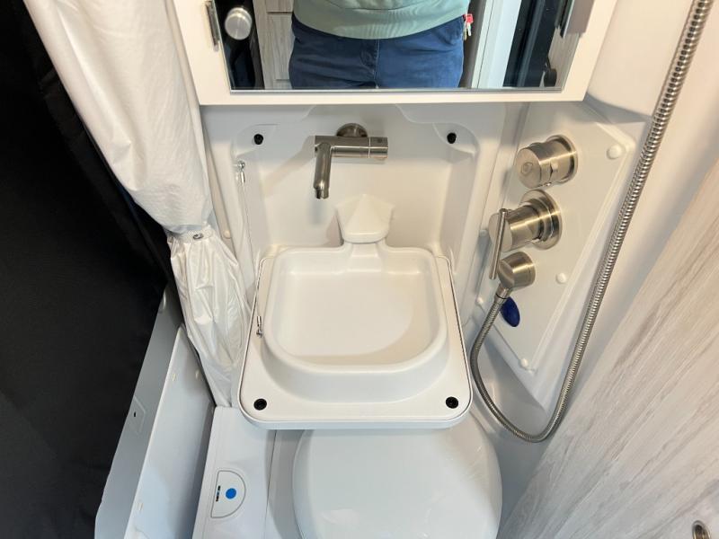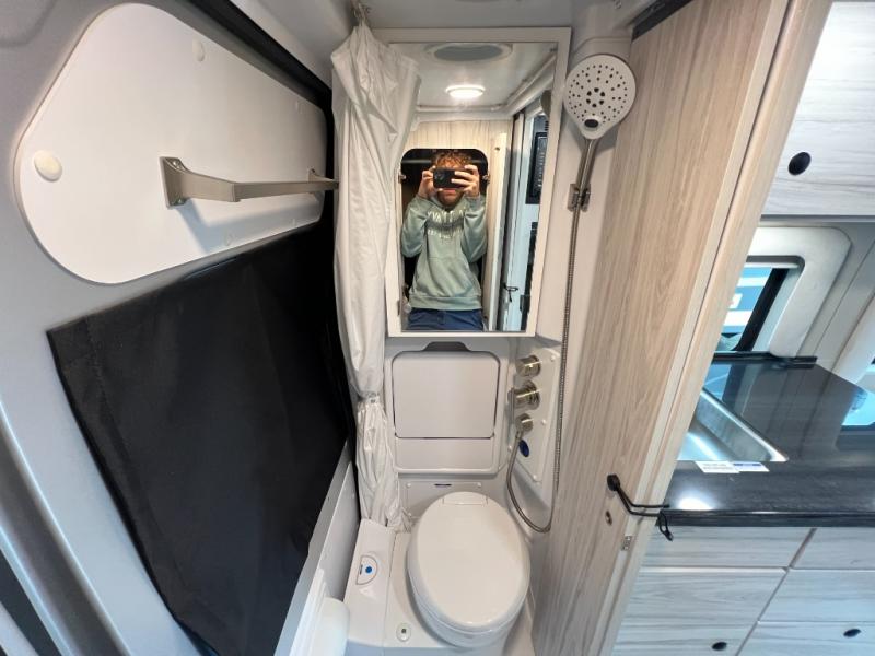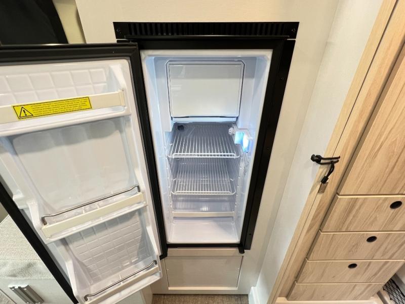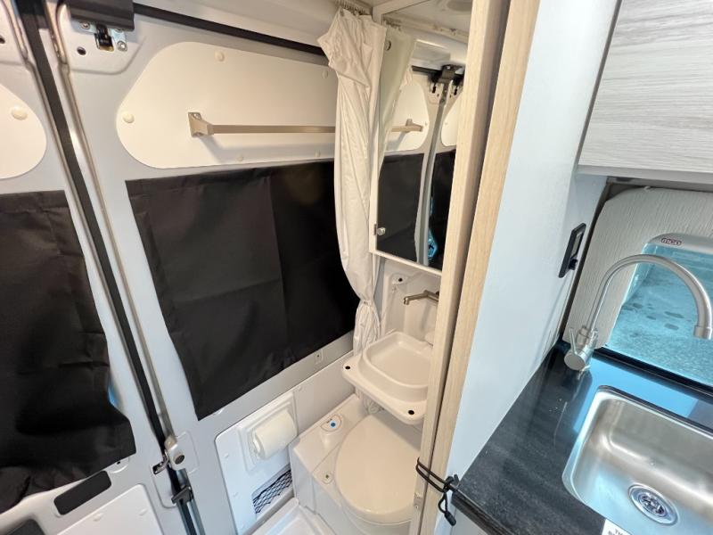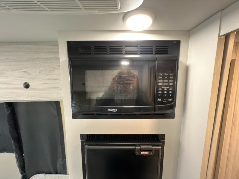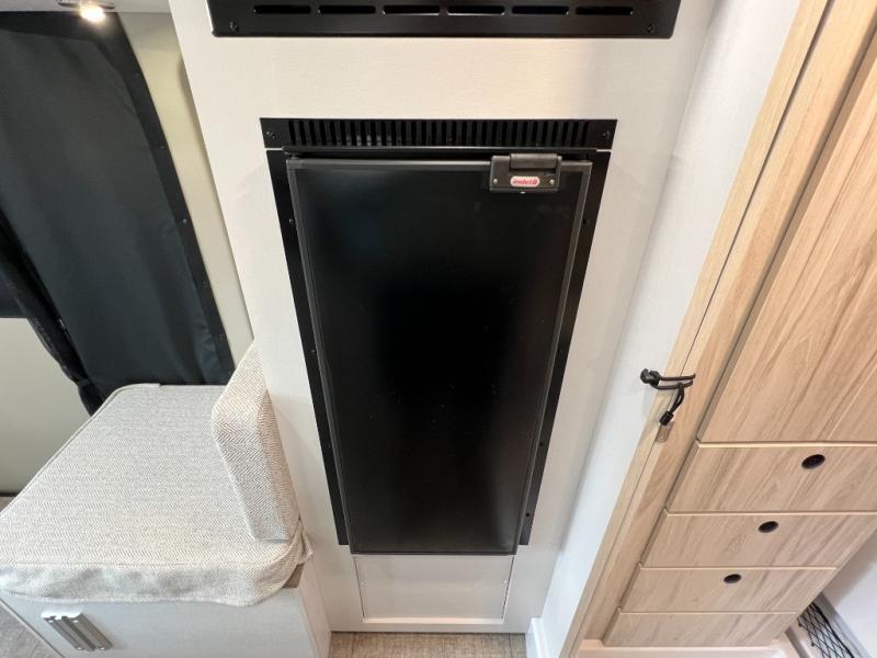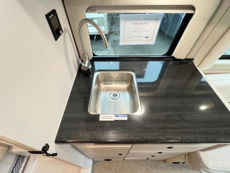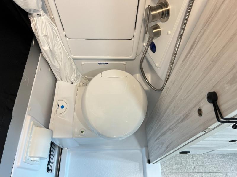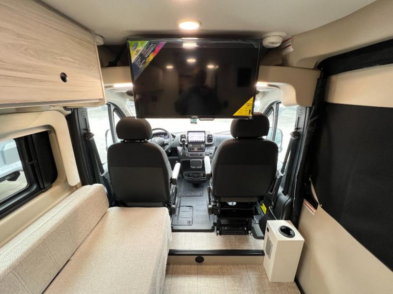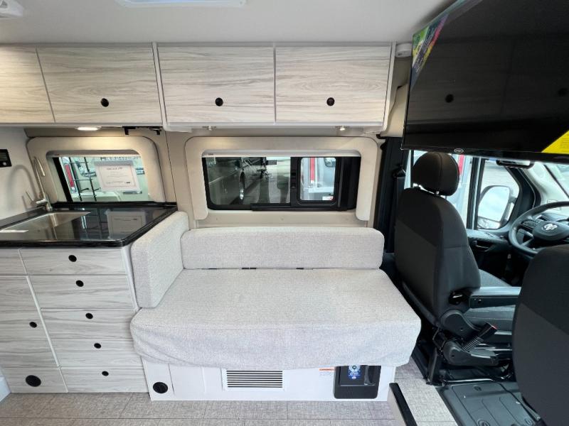 Any trip in this camper van will be spent in comfort thanks to the convenient wet bath and full kitchen amenities. You can whip up a hearty breakfast on the portable induction cooktop or use the microwave oven. There is a stainless steel sink with a cover for more prep space, and the pressed countertops will be easy to clean. After you've hiked for the day and gotten cleaned up in the rear wet bath, you can relax on the 54" sofa that will convert to a 54" x 72" bed. There is also a 27" bench seat for more seating space, overhead cabinets for storage, and an overhead TV to keep you entertained.