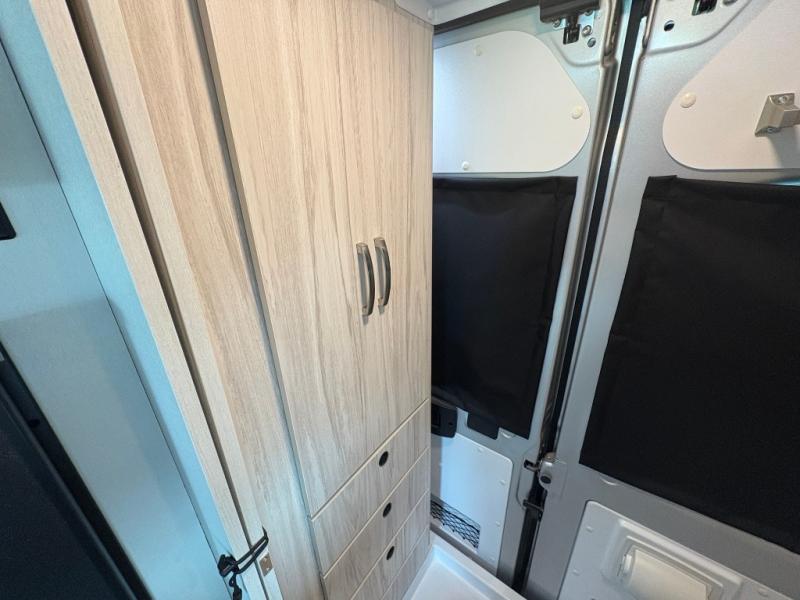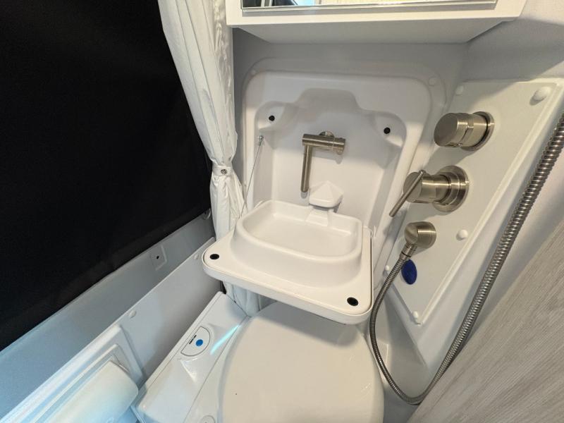 Any trip in this camper van will be spent in comfort thanks to the convenient wet bath and full kitchen amenities. You can whip up a hearty breakfast on the portable induction cooktop or use the microwave oven. There is a stainless steel sink with a cover for more prep space, and the pressed countertops will be easy to clean. After you've hiked for the day and gotten cleaned up in the rear wet bath, you can relax on the 54" sofa that will convert to a 54" x 72" bed. There is also a 27" bench seat for more seating space, overhead cabinets for storage, and an overhead TV to keep you entertained.