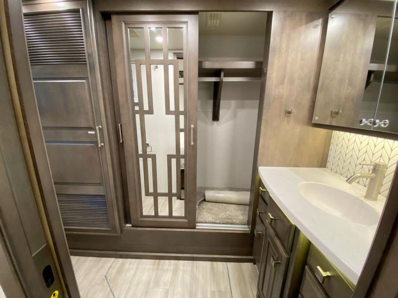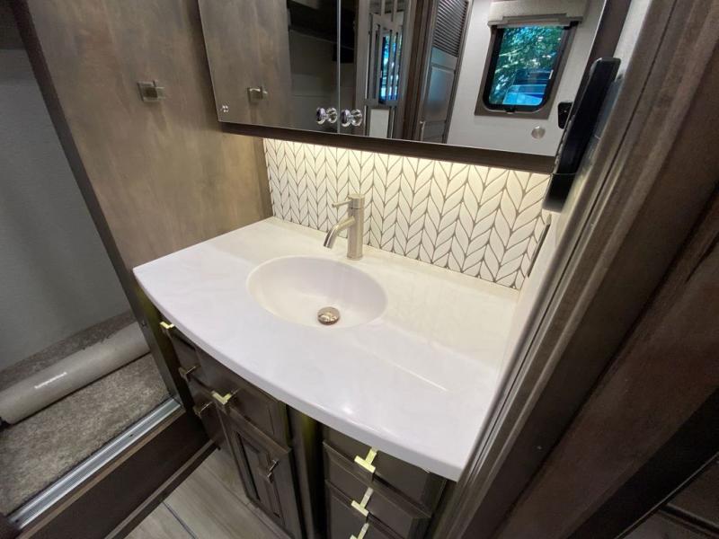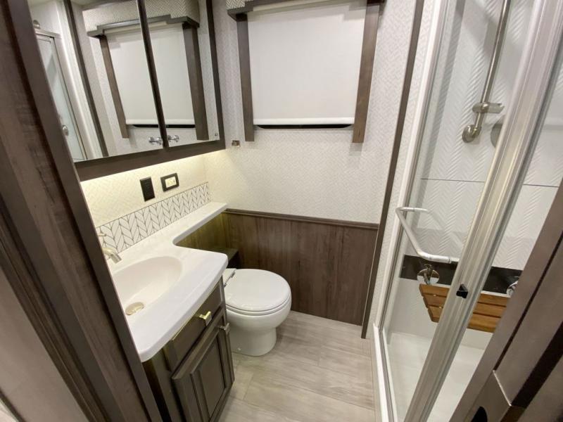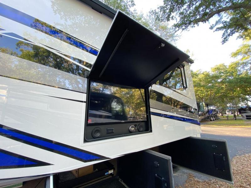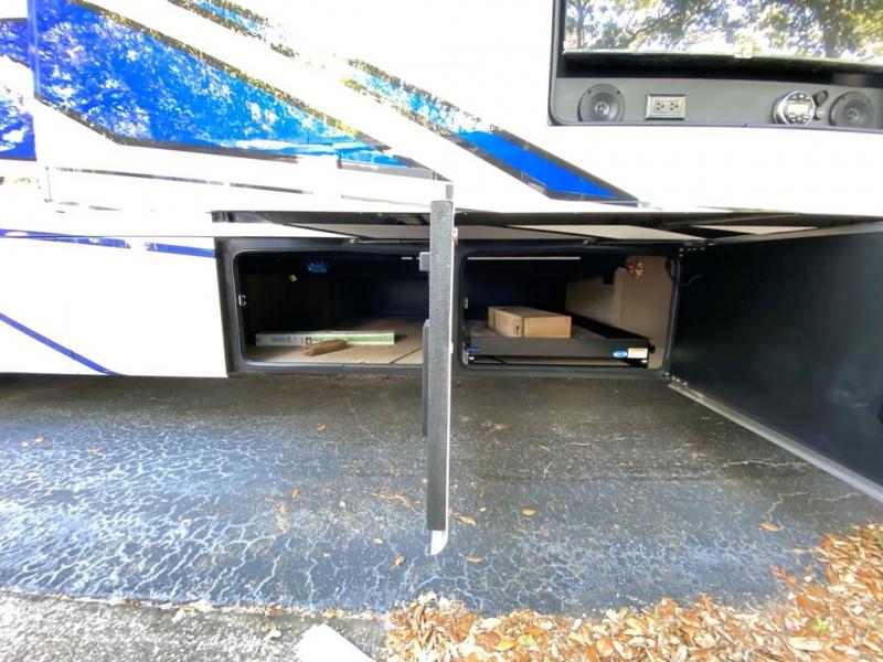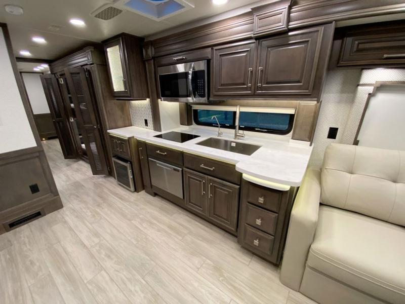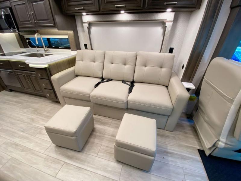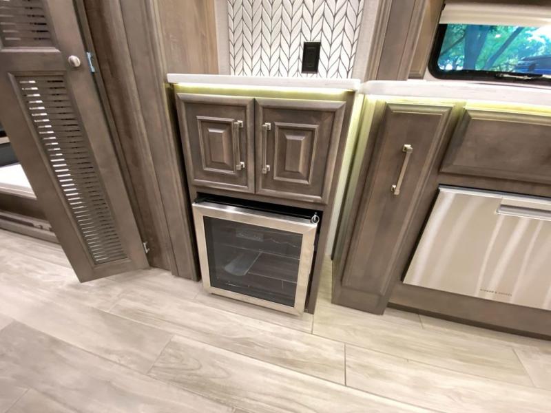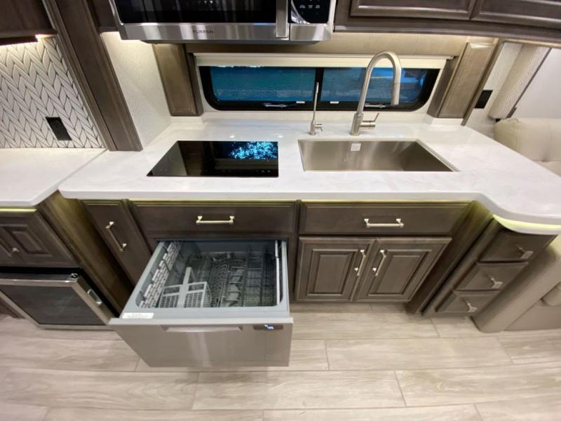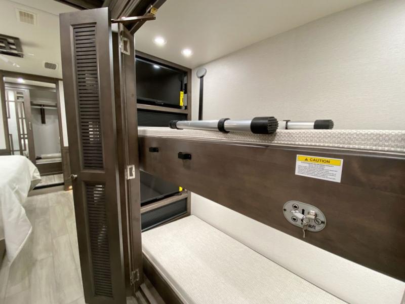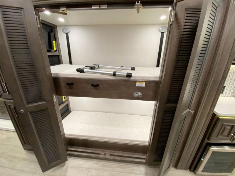 Your search for a family-friendly coach is over with this Aspire 44R! The power bunks include their own 24" TV's, and the full bath is right across from the bunks for convenience. You will enjoy the master bedroom all to yourselves with a king bed slide out, a 32" TV, and your own half bath with a spacious bath wardrobe. The kitchen is any chef's dream kitchen with its two burner induction cooktop, stainless steel residential refrigerator, two pantries, plus an additional refrigerator/cooler for drinks! This model also includes a hide-a-bed sofa for even more sleeping space, or you can add the optional power theater seating.