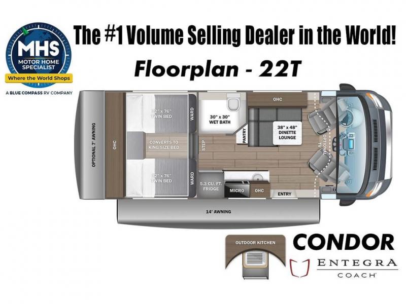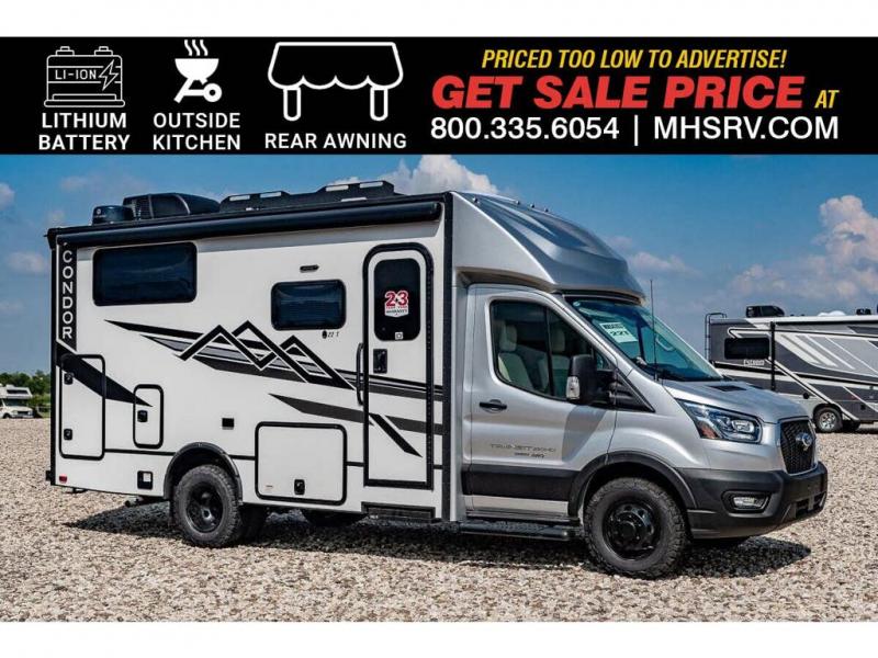 MSRP $242,761. New 2025 Entegra Condor 22T All-Wheel Drive (AWD) Luxury B+ RV. The Condor features all-terrain tires, one-piece seamless fiberglass front cap, van compass front and rear lift, 12V lithium battery, 2KW inverter, 360W solar panel with dual controller, backup camera, aqua-view showermiser, internal holding tanks, 2 twin-size beds that convert to a king-size bed, stainless steel sink, induction cooktop, convection microwave, Firefly multiplex system, High-Intensity LED ceiling lights, 4-way swivel driver and passenger seats, adaptive cruise control, lane-keeping system, rain-sensing wiper system, dual-pane acrylic windows and E-Z drive which includes a computer-balanced driveshaft, heavy-duty rear stabilizer bar, hellwig helper springs and rubber body isolation body mounts. Options include the customer value package, outdoor kitchen, 7 ft. rear awning, smart TV with cab and bedroom mounts. For additional details on this unit and our entire inventory including brochures, window sticker, videos, photos, reviews & testimonials as well as additional information about Motor Home Specialist and our manufacturers please visit us at MHSRV.com or call 800-335-6054. At Motor Home Specialist, we DO NOT charge any prep or orientation fees like you will find at other dealerships. All sale prices include a 200-point inspection, interior & exterior wash, detail service and a fully automated high-pressure rain booth test and coach wash that is a standout service unlike that of any other in the industry. You will also receive a thorough coach orientation with an MHSRV technician, a night stay in our delivery park featuring landscaped and covered pads with full hook-ups and much more! Read Thousands upon Thousands of 5-Star Reviews at MHSRV.com and See What They Had to Say About Their Experience at Motor Home Specialist. WHY PAY MORE? WHY SETTLE FOR LESS?