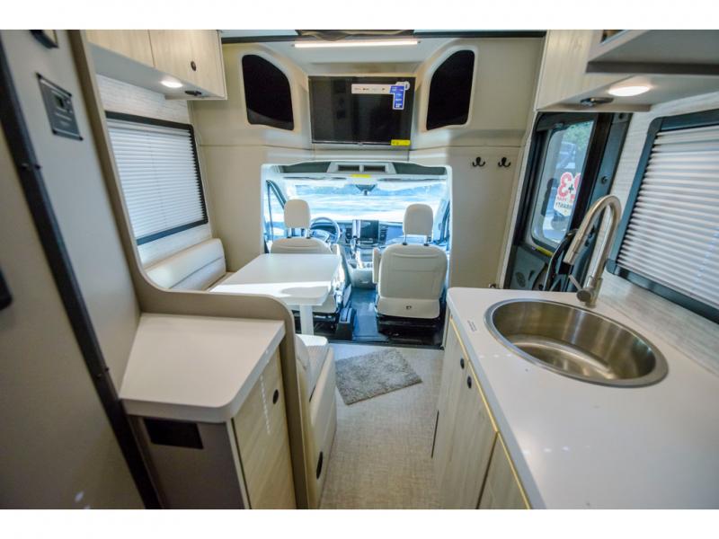 Pack your bags and load up the bikes in this all-wheel drive coach for two! Once you're parked for the day, you can swivel the seats around and relax with a cold drink. The kitchen includes everything you need to whip up a quick lunch, including an induction cooktop and a convection microwave, and the stainless steel sink will make clean up a breeze. There is a dinette lounge where you can dine at, or you might just sit outside in your camp chair under the 14' awning or optional 7' rear awning. There is even an outdoor kitchen option for added convenience! The wet bath includes a shower with a curtain surround, a medicine cabinet with a mirror, and an Aqua View Showermiser water management system. When you're ready to call it a night, you'll find twin beds with a king bed conversion, and there are dual wardrobes to keep your clothes tidy!