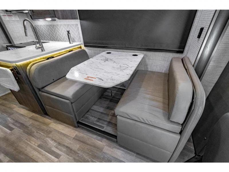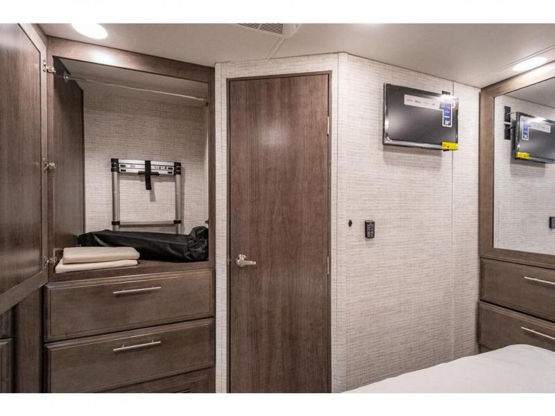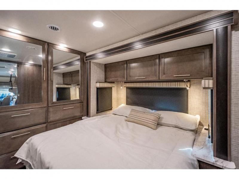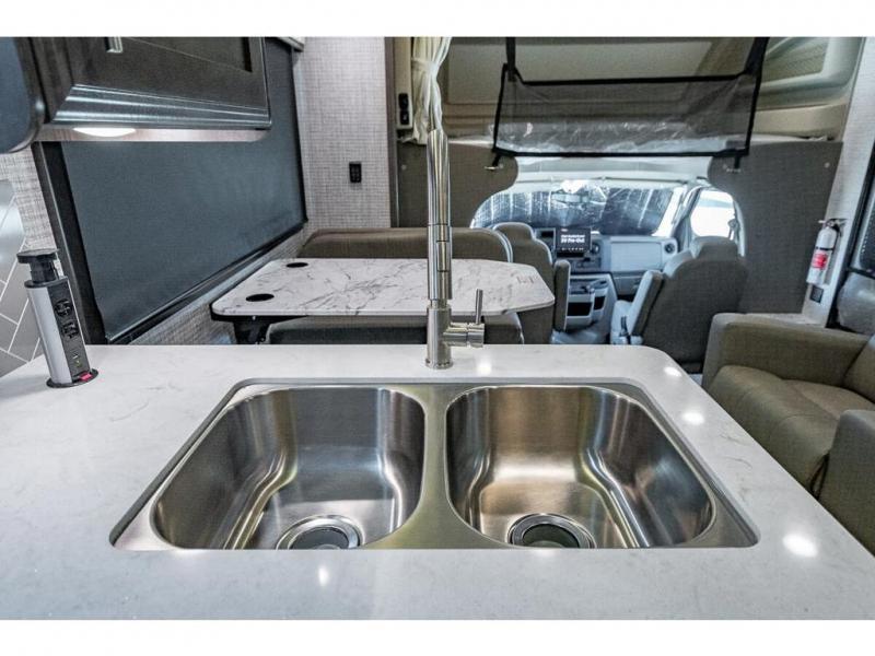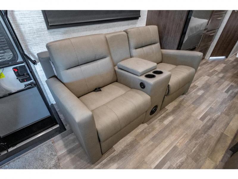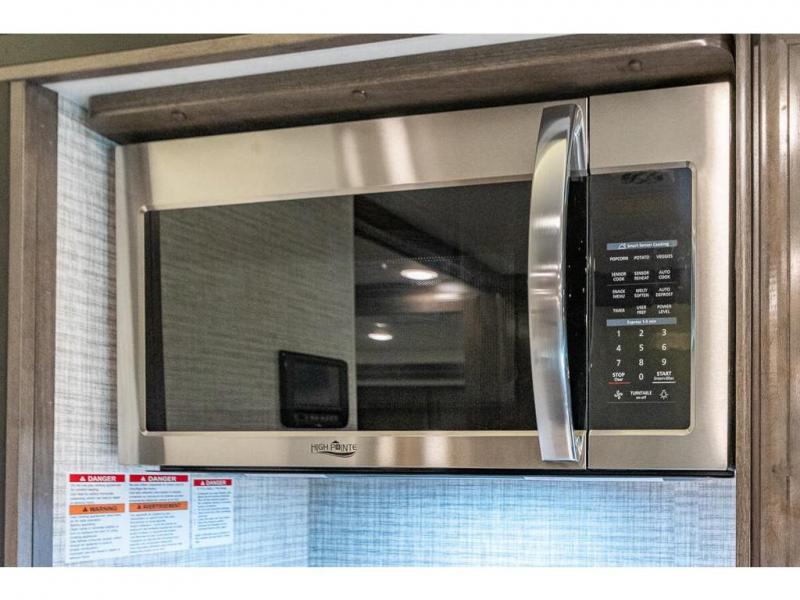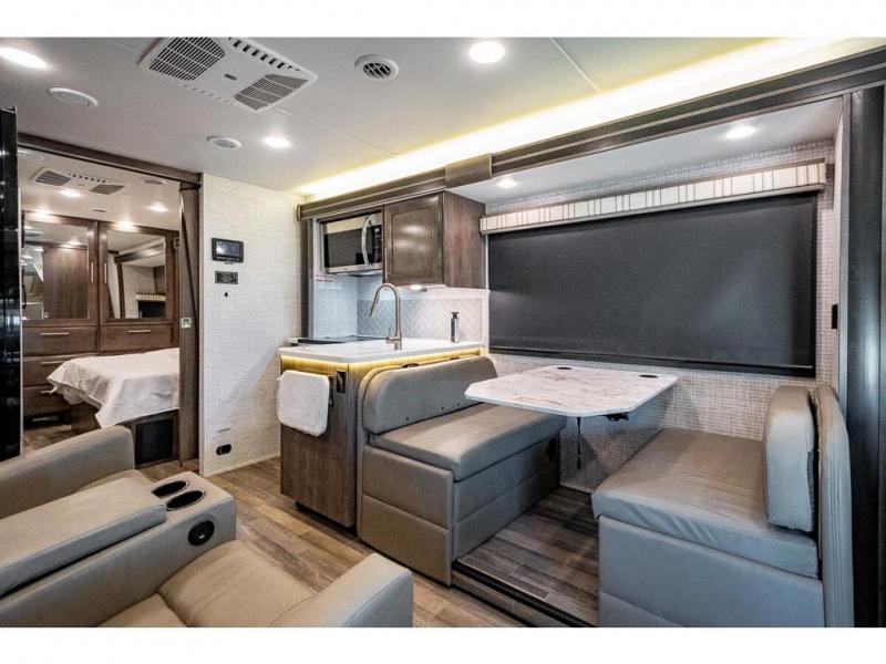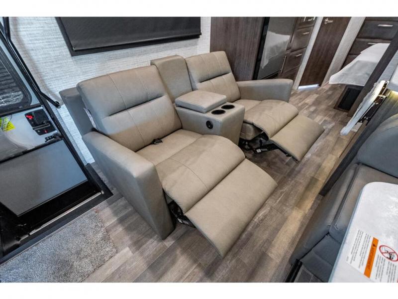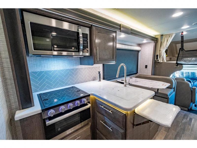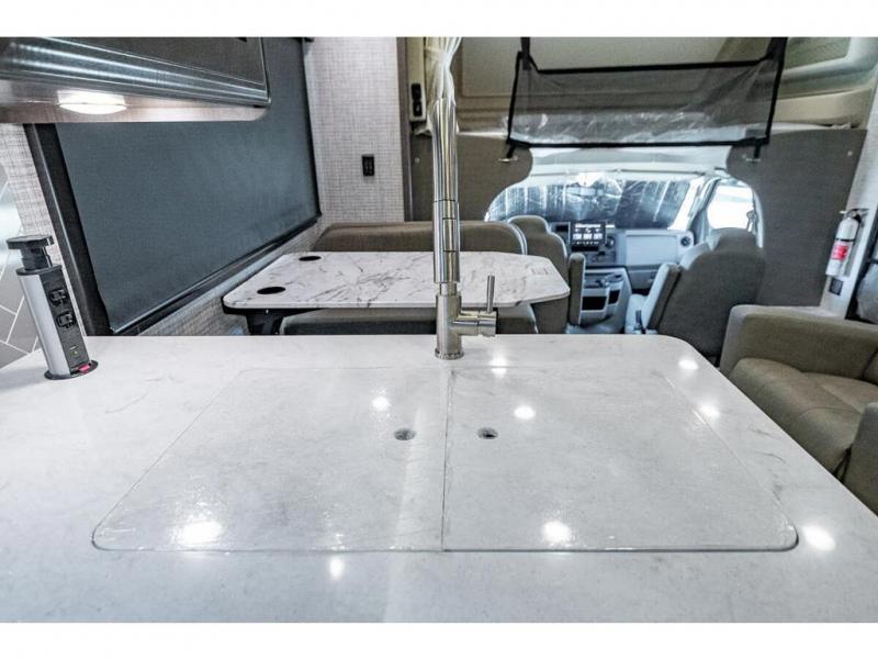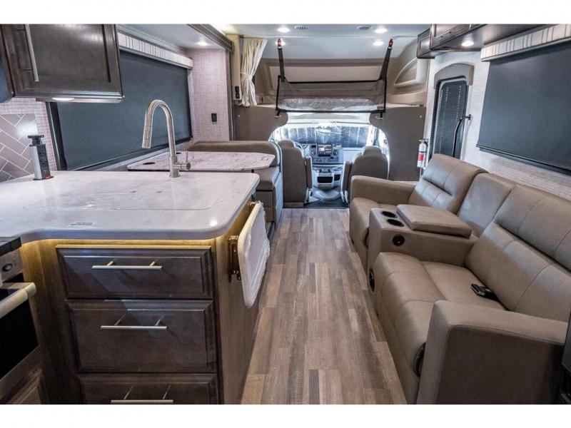 You can bring a few guests to join in on the fun with this motorhome! The bunk over cab and 66" x 76" king bed offer comfortable places to sleep, plus you can transform the booth dinette and the sofa into extra sleeping spaces if needed. Everyone can freshen up each morning with the 30" x 36" shower in the rear corner bathroom, and keep their bellies full with a Furrion all-in-one cooktop and oven plus a residential microwave. There is even a countertop extension to make meal prepping easier. Take the fun outside and watch movies on the exterior LED HD Smart TV while staying protected by the 18' electric awning with LED lights!