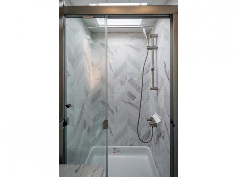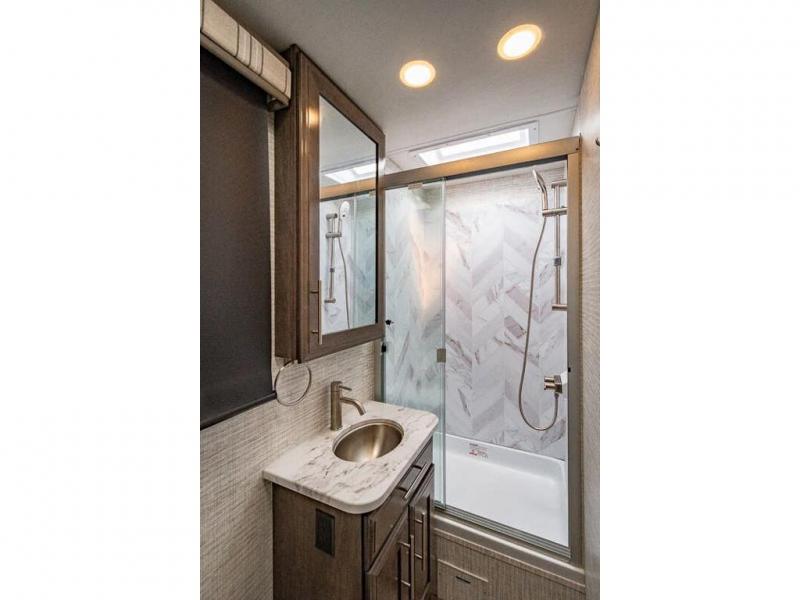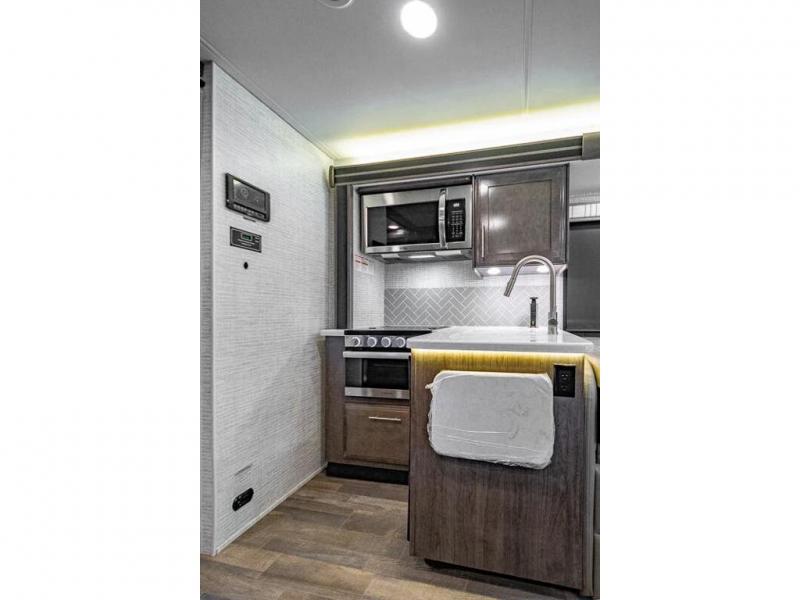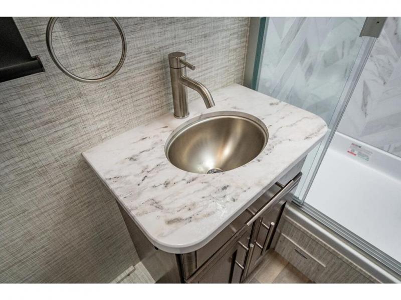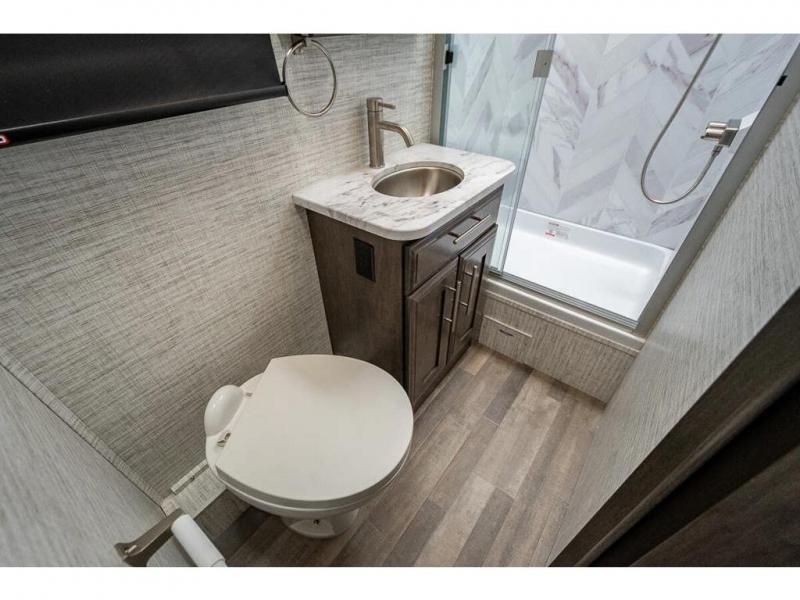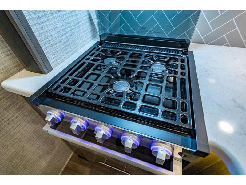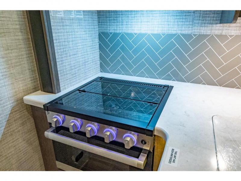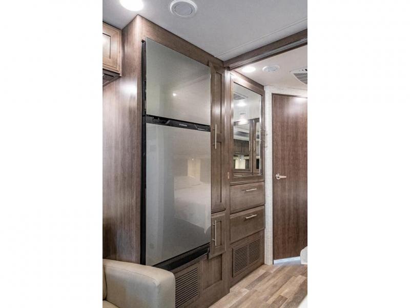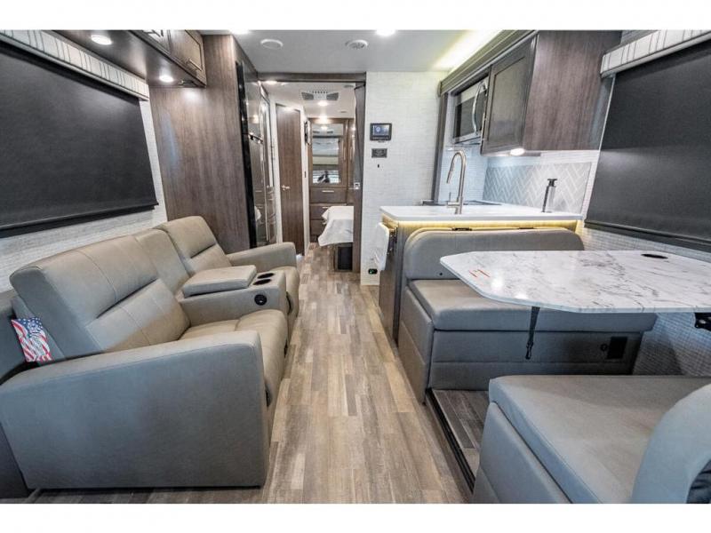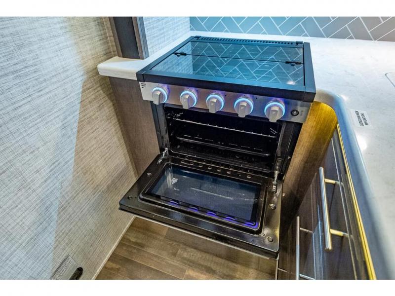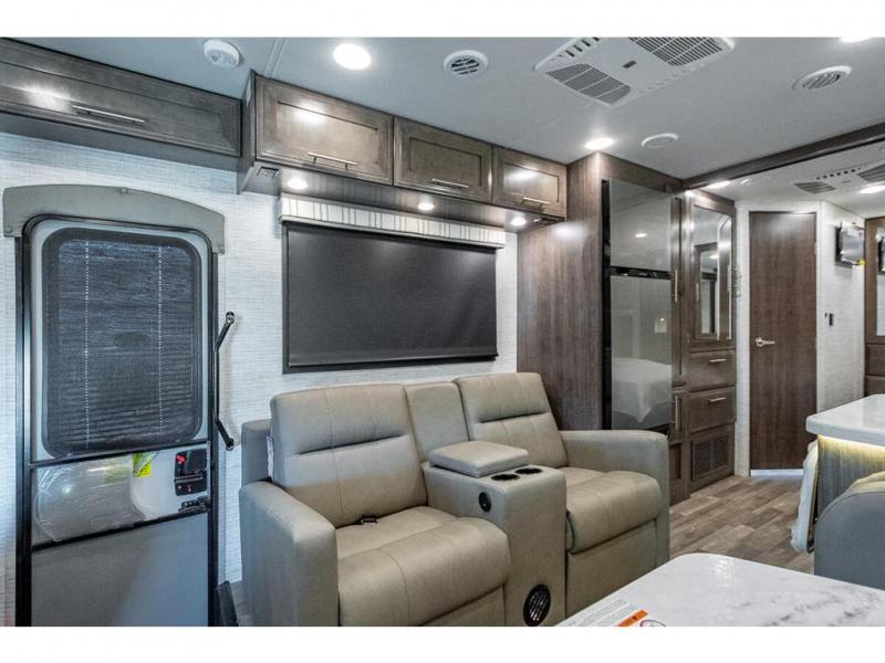You can bring a few guests to join in on the fun with this motorhome! The bunk over cab and 66" x 76" king bed offer comfortable places to sleep, plus you can transform the booth dinette and the sofa into extra sleeping spaces if needed. Everyone can freshen up each morning with the 30" x 36" shower in the rear corner bathroom, and keep their bellies full with a Furrion all-in-one cooktop and oven plus a residential microwave. There is even a countertop extension to make meal prepping easier. Take the fun outside and watch movies on the exterior LED HD Smart TV while staying protected by the 18' electric awning with LED lights!