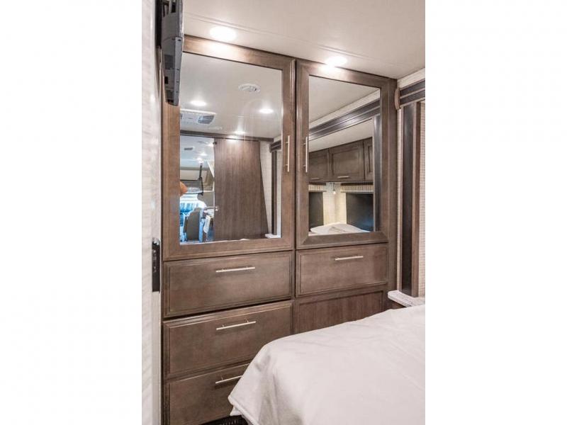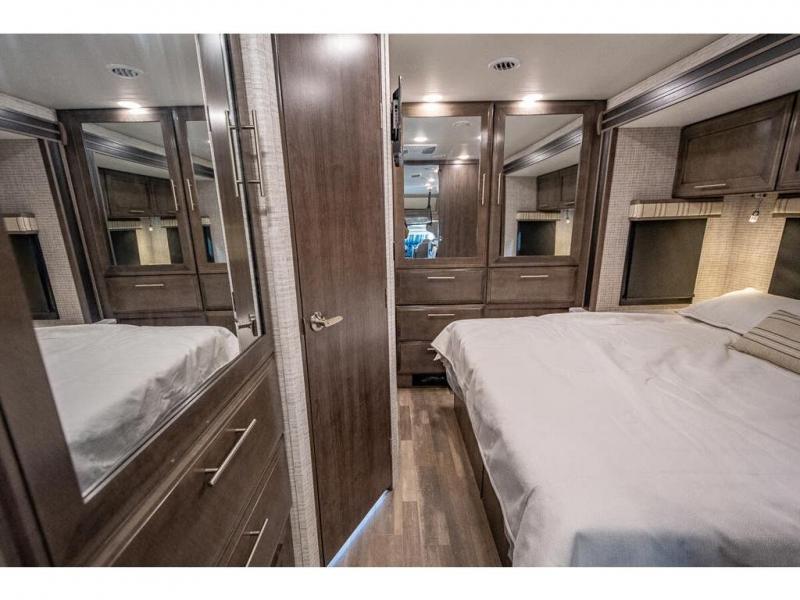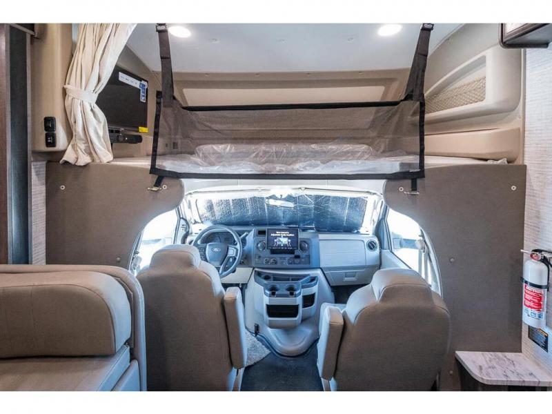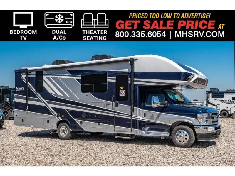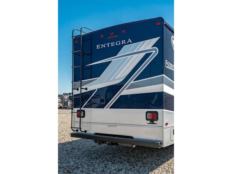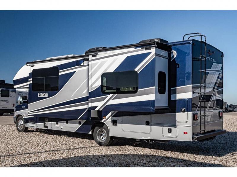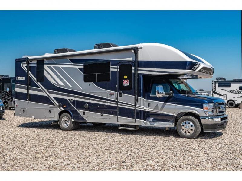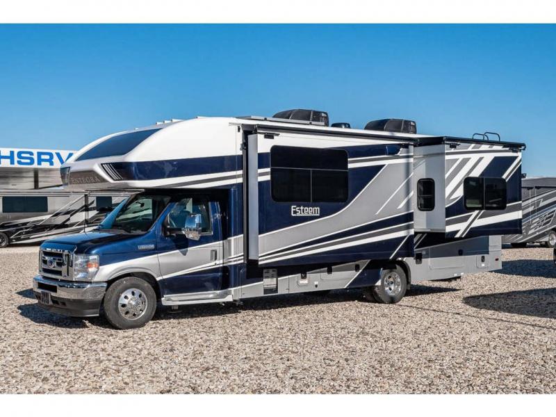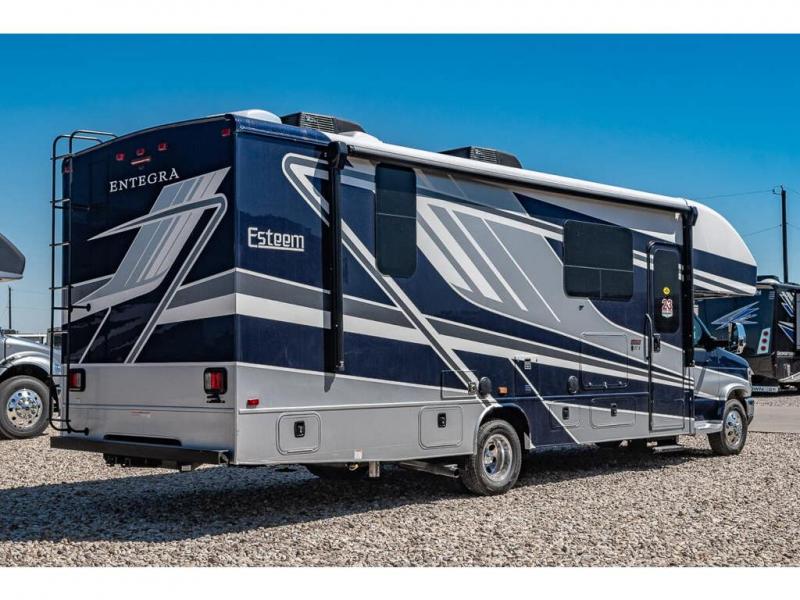 Make one of these Entegra Coach Esteem Class C gas motorhomes your own! The interior design includes solid-surface countertops that pair well with the many technological upgrades. The fully custom-molded ABS surround in the cab area features its signature panoramic window and power shade for a beautiful view while you drive and provide privacy at night. They also come with E-Z Drive Elite which has a computer-balanced driveshaft, Koni FSD shocks, Hellwig helper springs, and a heavy-duty rear stabilizer bar for a smooth ride. Automatic leveling jacks will make set-up a breeze and the electric awning with LED lights will create an outdoor living space where you can relax after unpacking. Inside, you'll enjoy hardwood cabinet doors and drawer fronts, blackout night roller shades, and high-intensity recessed LED ceiling lights to keep your space well lit. There is also a JBL audio system and a BMPRO total coach control system to easily manage your unit's functions!