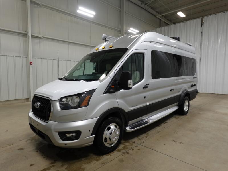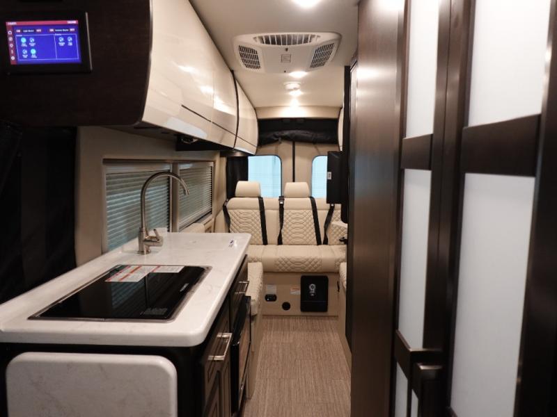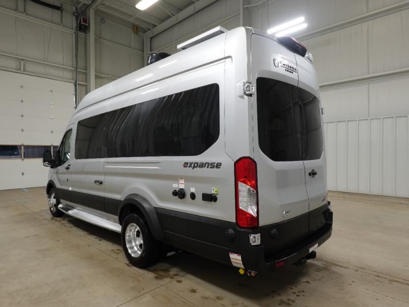 The Expanse brings you luxury, comfort, and safety all in an easy-to-drive Class B size. The rear 68" wide power sofa has plenty of space to stretch out, and two additional jump seats and a table mount make it comfortable enough for a few people to eat dinner or watch the 24" LED HD TV. You could also enjoy meals up front, where the driver and passenger seats can be swiveled around to access the table there. Conveniently, the kitchen is in the middle so no matter where you decide to eat, the table is only a few steps away! The wet bath is also centrally located, with a 25" x 46 3/4" shower, foot flush toilet, and Aqua View® SHOWERMI$ER™ water management system. Thoughtful design includes styling elements like the Tecnoform® European-style high-gloss cabinetry, residential vinyl flooring, and a removable privacy shade for the sliding door window.