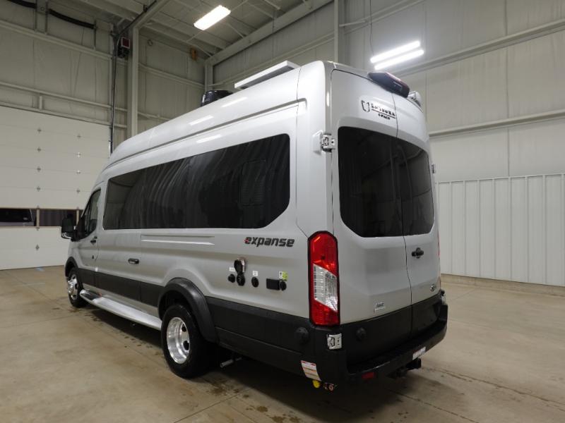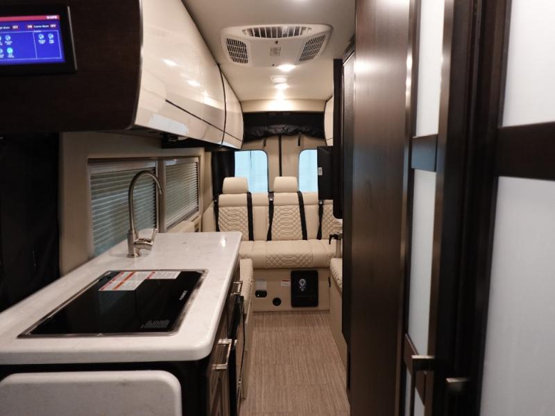 The Expanse brings you luxury, comfort, and safety all in an easy-to-drive Class B size. The rear 68" wide power sofa has plenty of space to stretch out, and two additional jump seats and a table mount make it comfortable enough for a few people to eat dinner or watch the 24" LED HD TV. You could also enjoy meals up front, where the driver and passenger seats can be swiveled around to access the table there. Conveniently, the kitchen is in the middle so no matter where you decide to eat, the table is only a few steps away! The wet bath is also centrally located, with a 25" x 46 3/4" shower, foot flush toilet, and Aqua View® SHOWERMI$ER™ water management system. Thoughtful design includes styling elements like the Tecnoform® European-style high-gloss cabinetry, residential vinyl flooring, and a removable privacy shade for the sliding door window.