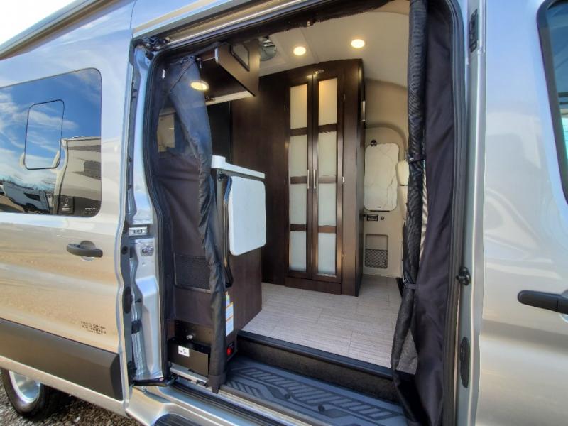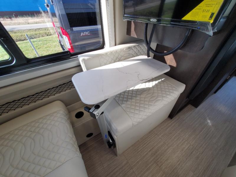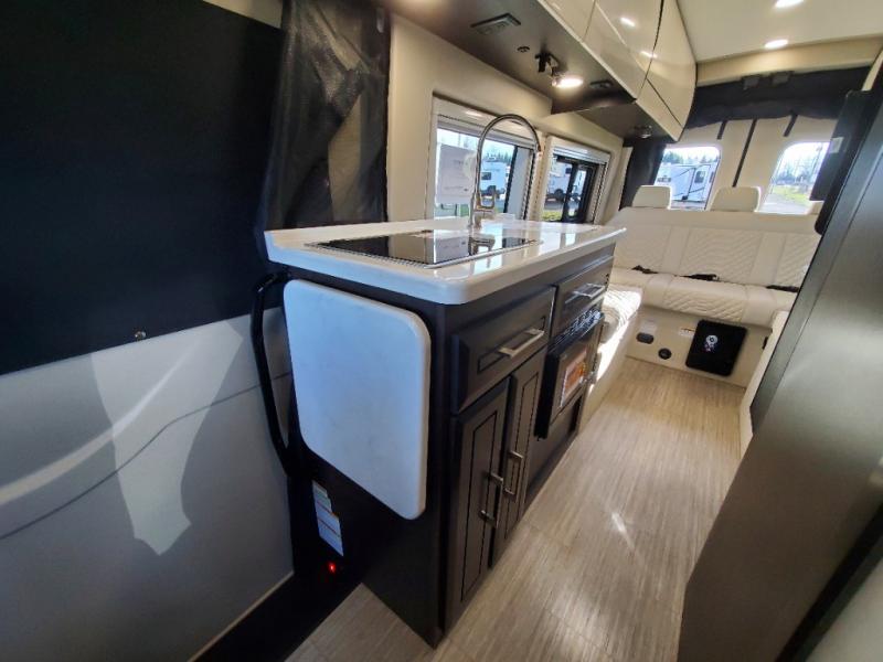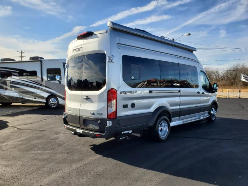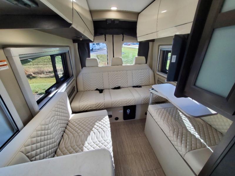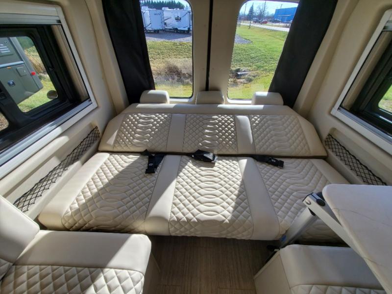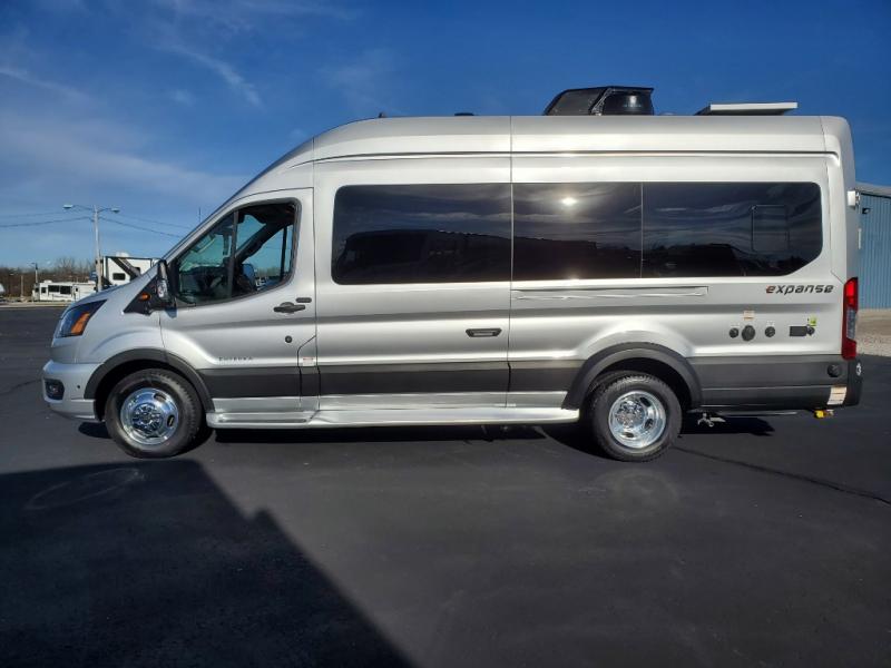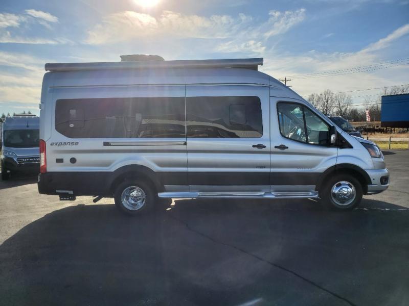 The Expanse brings you luxury, comfort, and safety all in an easy-to-drive Class B size. The rear 68" wide power sofa has plenty of space to stretch out, and two additional jump seats and a table mount make it comfortable enough for a few people to eat dinner or watch the 24" LED HD TV. You could also enjoy meals up front, where the driver and passenger seats can be swiveled around to access the table there. Conveniently, the kitchen is in the middle so no matter where you decide to eat, the table is only a few steps away! The wet bath is also centrally located, with a 25" x 46 3/4" shower, foot flush toilet, and Aqua View® SHOWERMI$ER™ water management system. Thoughtful design includes styling elements like the Tecnoform® European-style high-gloss cabinetry, residential vinyl flooring, and a removable privacy shade for the sliding door window.