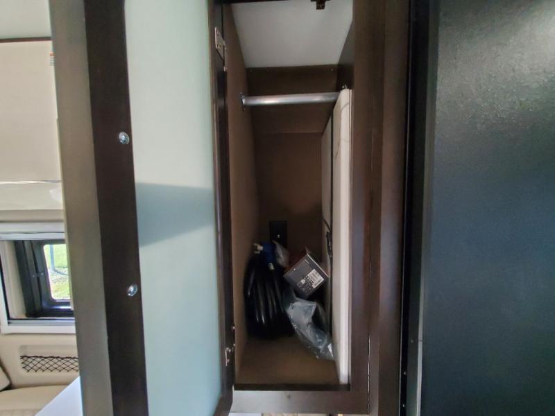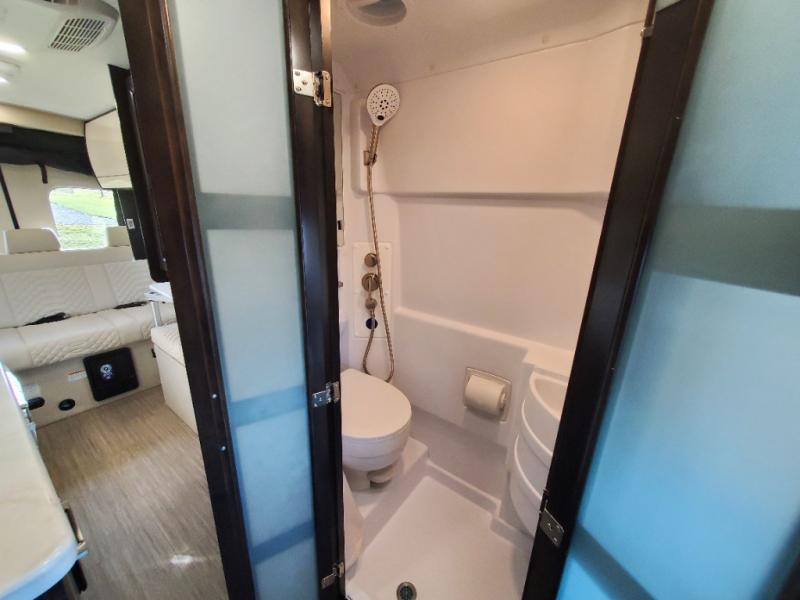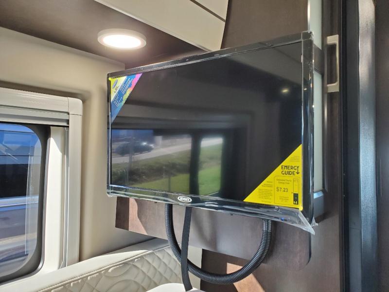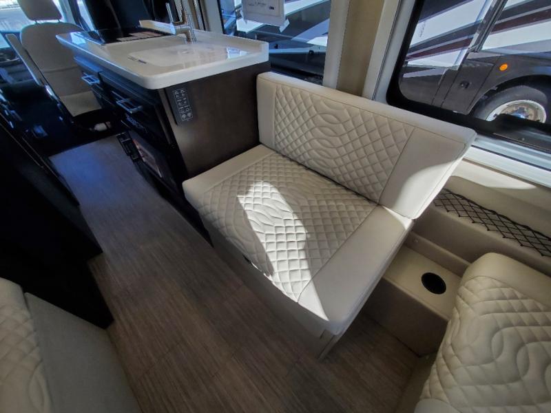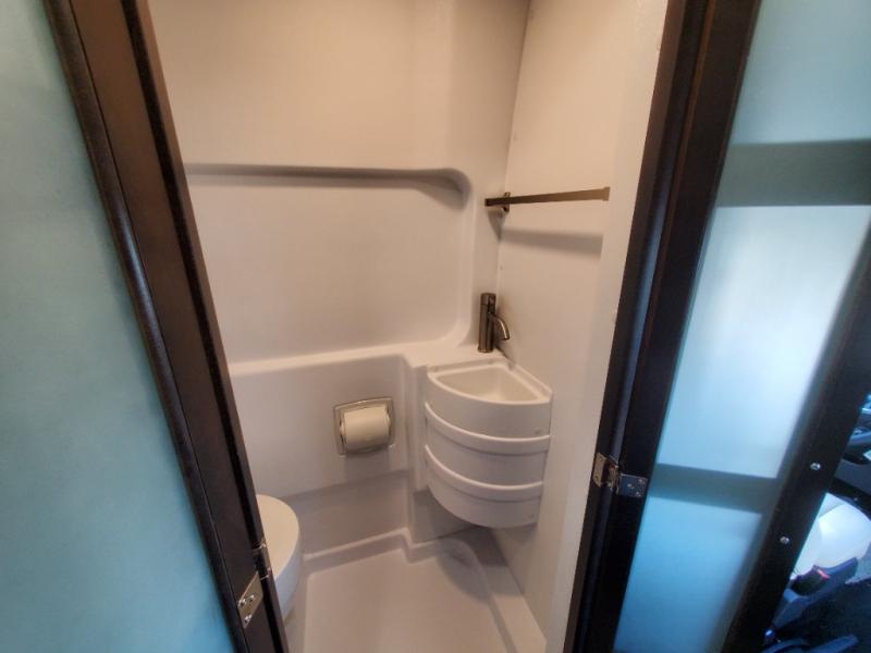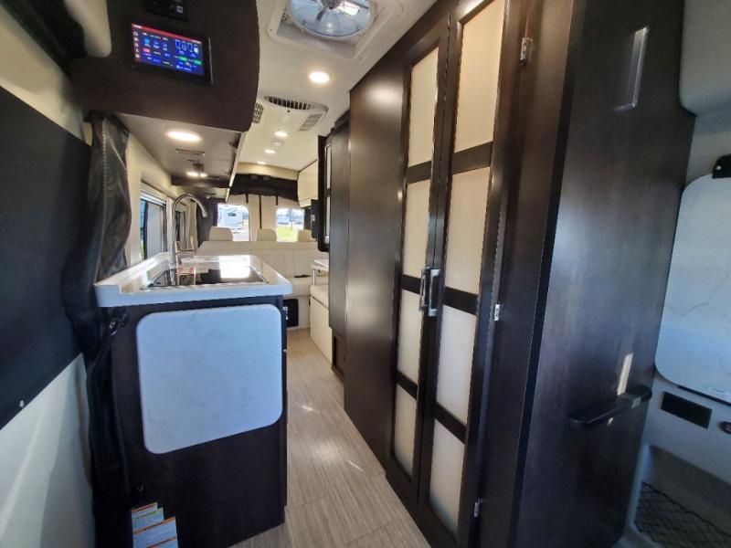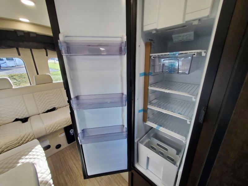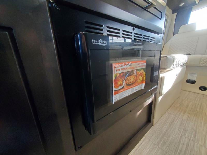 The Expanse brings you luxury, comfort, and safety all in an easy-to-drive Class B size. The rear 68" wide power sofa has plenty of space to stretch out, and two additional jump seats and a table mount make it comfortable enough for a few people to eat dinner or watch the 24" LED HD TV. You could also enjoy meals up front, where the driver and passenger seats can be swiveled around to access the table there. Conveniently, the kitchen is in the middle so no matter where you decide to eat, the table is only a few steps away! The wet bath is also centrally located, with a 25" x 46 3/4" shower, foot flush toilet, and Aqua View® SHOWERMI$ER™ water management system. Thoughtful design includes styling elements like the Tecnoform® European-style high-gloss cabinetry, residential vinyl flooring, and a removable privacy shade for the sliding door window.