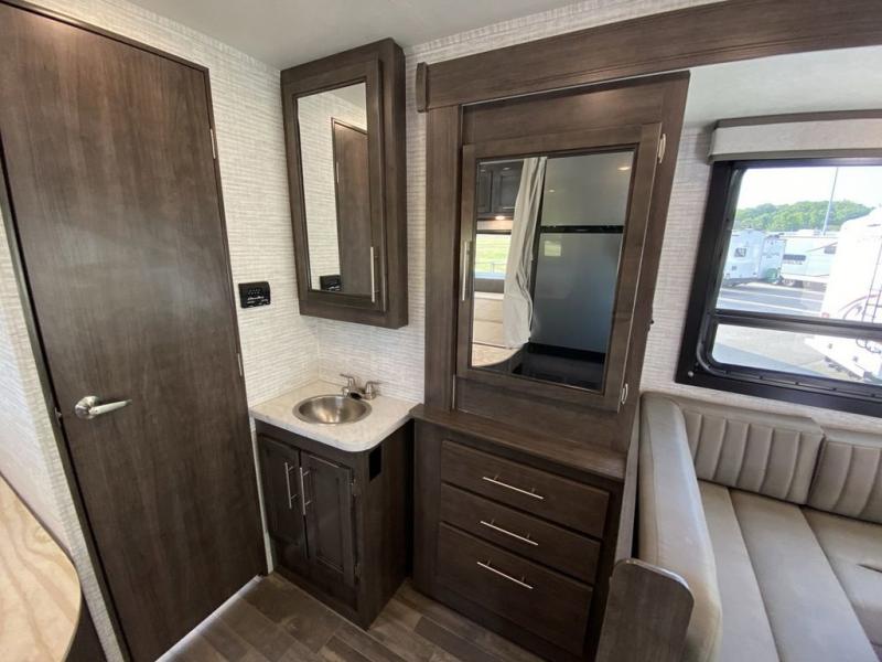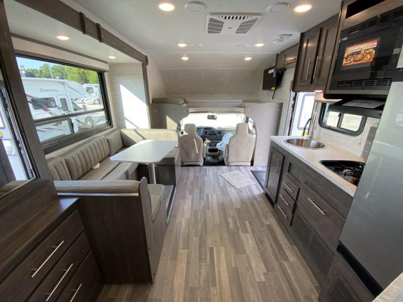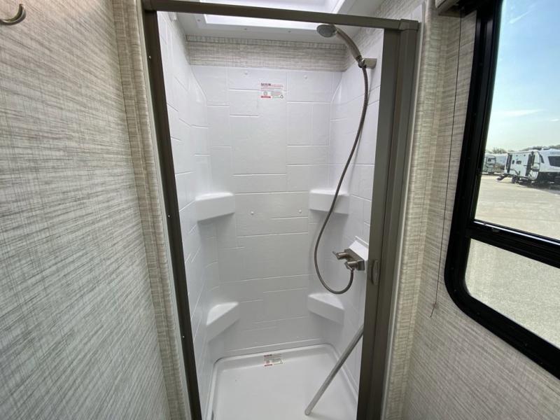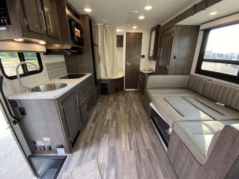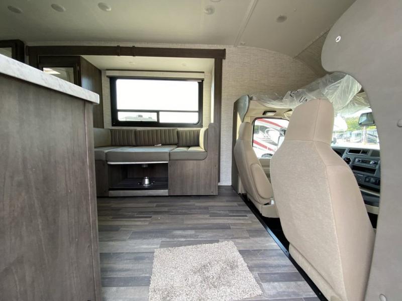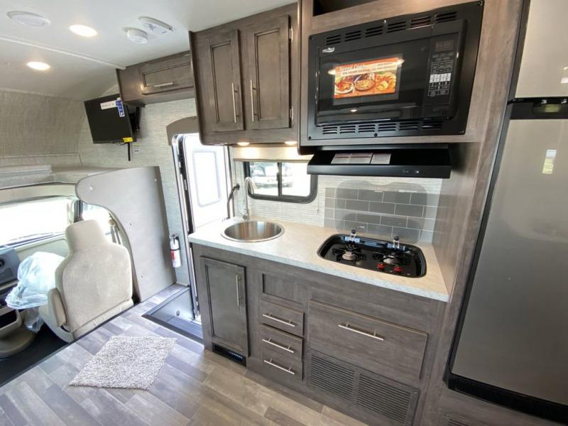 The Odyssey SE Class C gas motorhome by Entegra Coach is constructed with TuffShell vacuum-bond laminated sidewalls, a one-piece, seamless fiberglass front cap, and bead-foam insulation for added durability and strength. Whether you choose a model with a Ford E-450 chassis or Chevy 4500 chassis, you will get a durable coach made to last. The driver will also love the power steering, tilt steering wheel, and auxiliary start switch, and there are privacy curtains for the cab area to close at night. The 7' interior ceiling height will provide plenty of space to stretch out and the high-intensity, recessed LED lights will make your space feel more like home. All of your power needs will be met with a 4,000-watt generator and 12V house battery, plus there is a 13.5K BTU A/C and 30K BTU furnace to keep you comfortable all year long. There are a couple additions you might want to add to further customize your Odyssey SE, like the optional automatic hydraulic leveling jacks and the optional 200W solar panel for some off-grid camping!