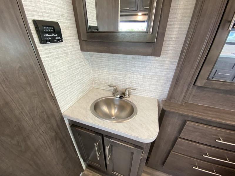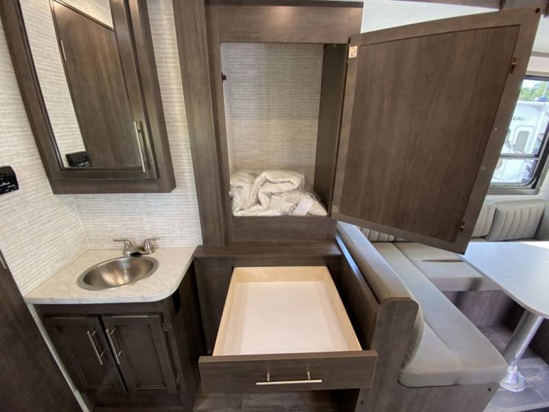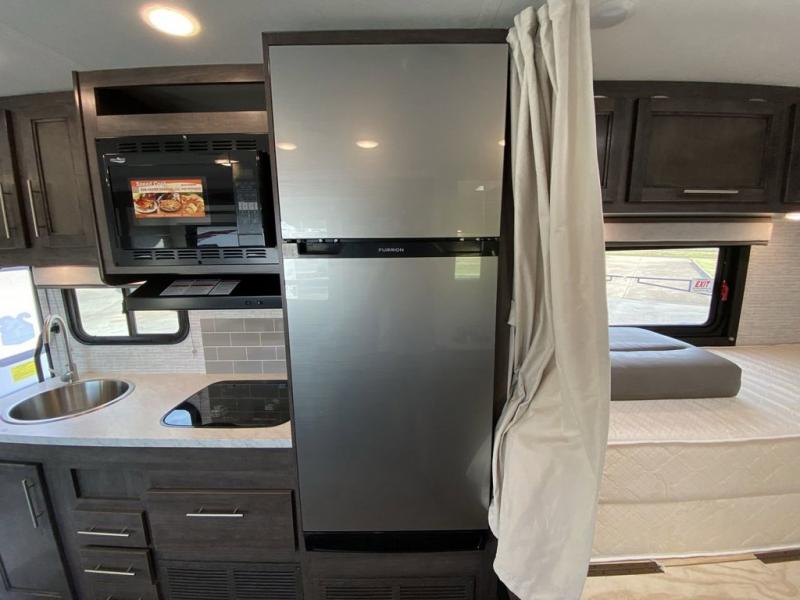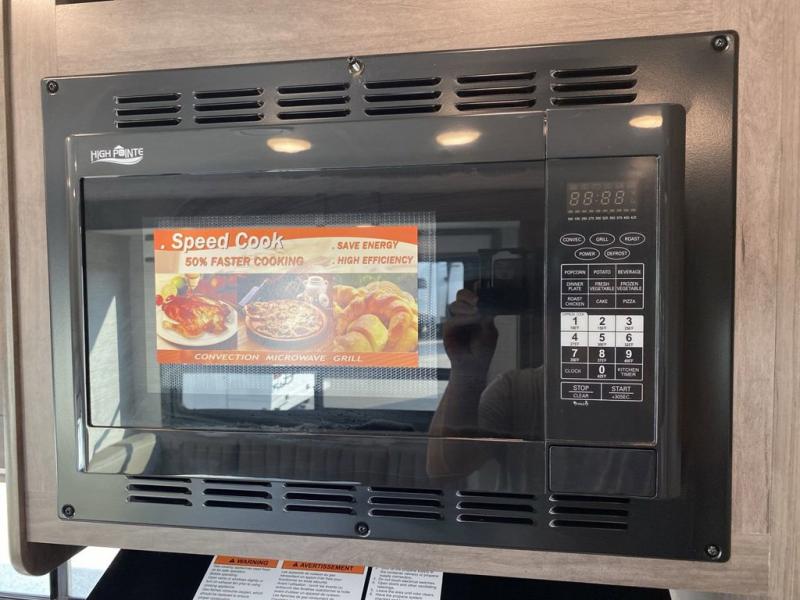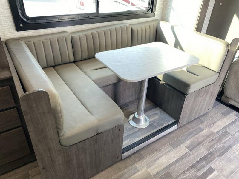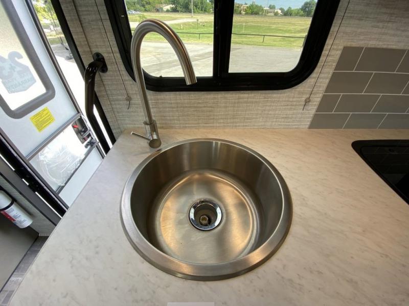 This coach will feel a little more like home with its spacious interior thanks to the U-shaped dinette slide! You can dine here, play games, and even let guests sleep here. There is additional sleeping space in the cab-over bunk and the rear corner 60" x 74" queen bed. The rear corner bath includes the 24" x 32" shower and foot flush toilet, and the stainless steel bath sink is just outside this room so two people can freshen up at once. You will find everything you need to cook meals each day, including a two burner cooktop with a flush cover, a convection microwave, plus a 10 cu. ft. 12V refrigerator to store perishables.