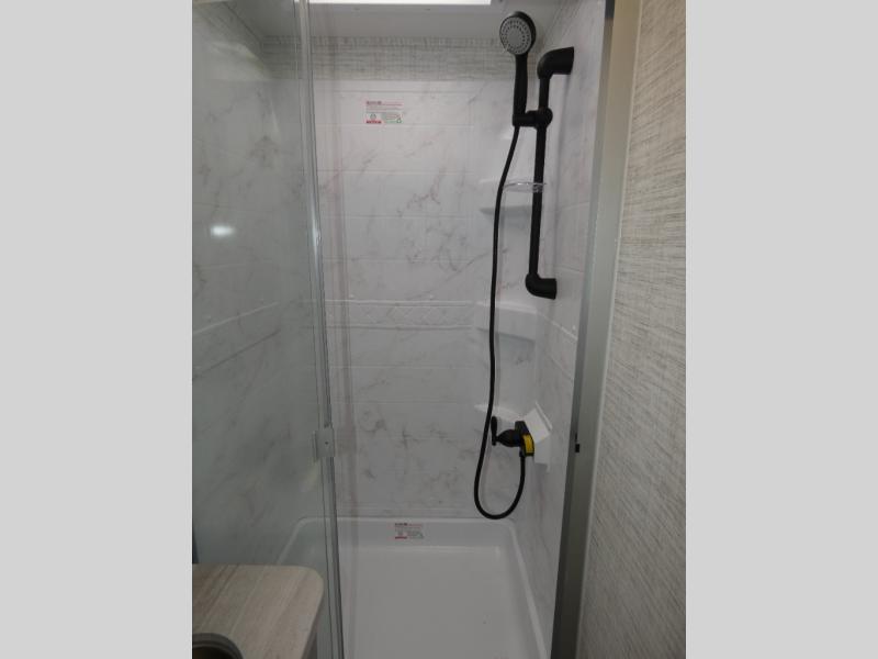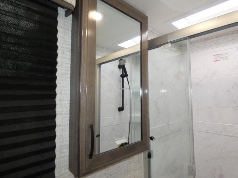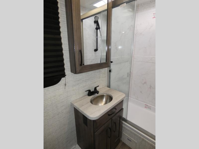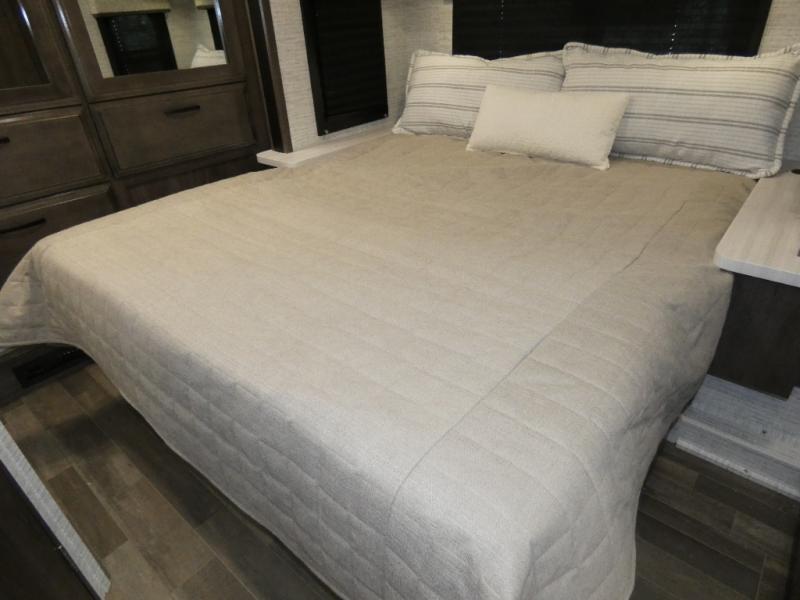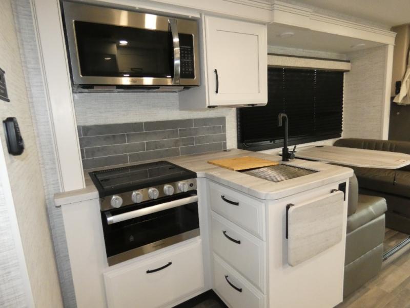Sleep like a king after driving the scenic byways, hiking the trails and exploring the campgrounds. The rear bedroom offers a king bed slide, a wardrobe, a TV option, and a sliding door to close off the bedroom with an additional wardrobe and the corner full bathroom. The combined kitchen and living area is spacious thanks to another slide which includes a booth dinette, and kitchen amenities including a counter extension, sink, the Furrion all-in-one-cooktop and oven and a residential-size microwave. And the 8 cu. ft. refrigerator and pantry are next to the sofa so you can easily grab a beverage before sitting down. The furniture doubles as sleeping space, and the cab-over bunk is always available.