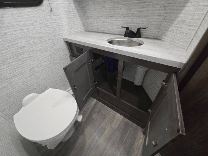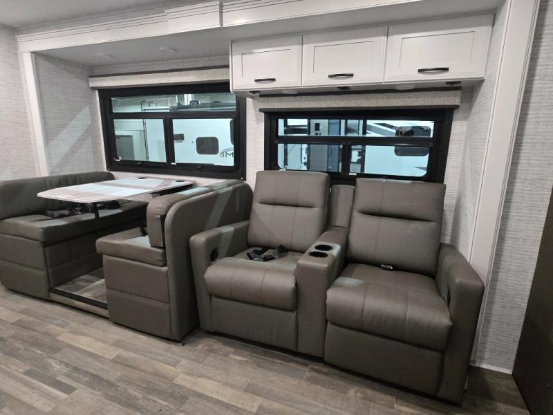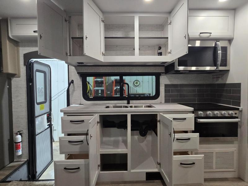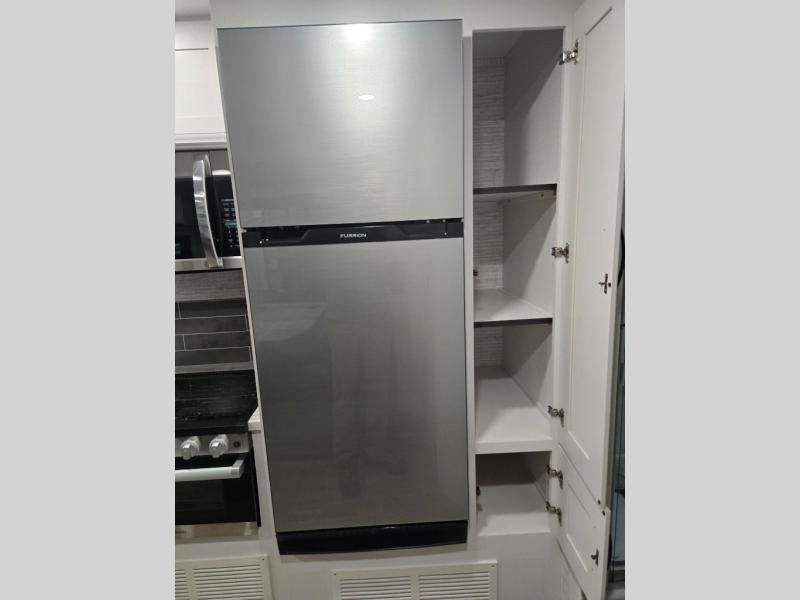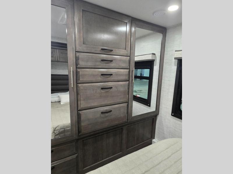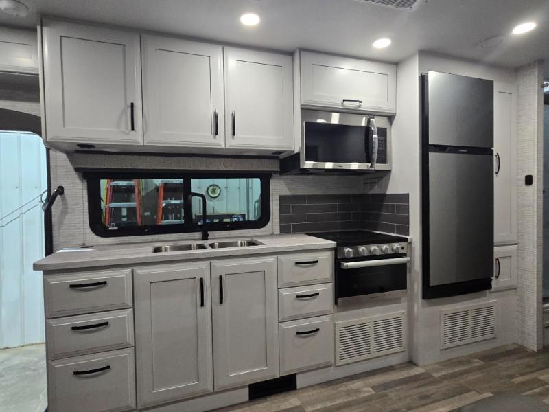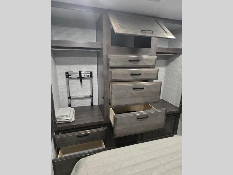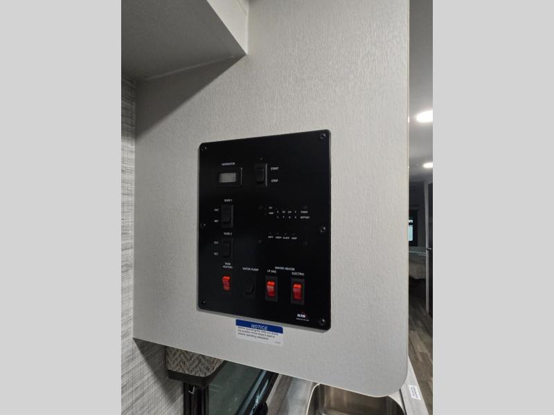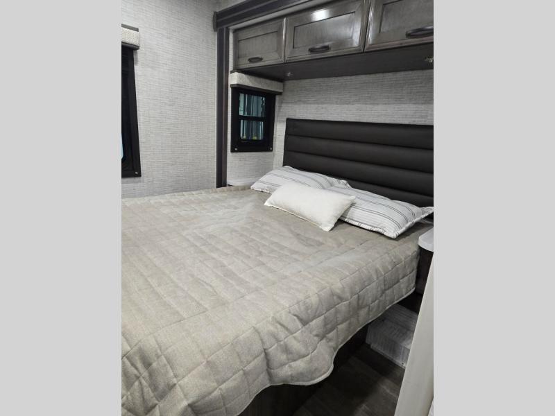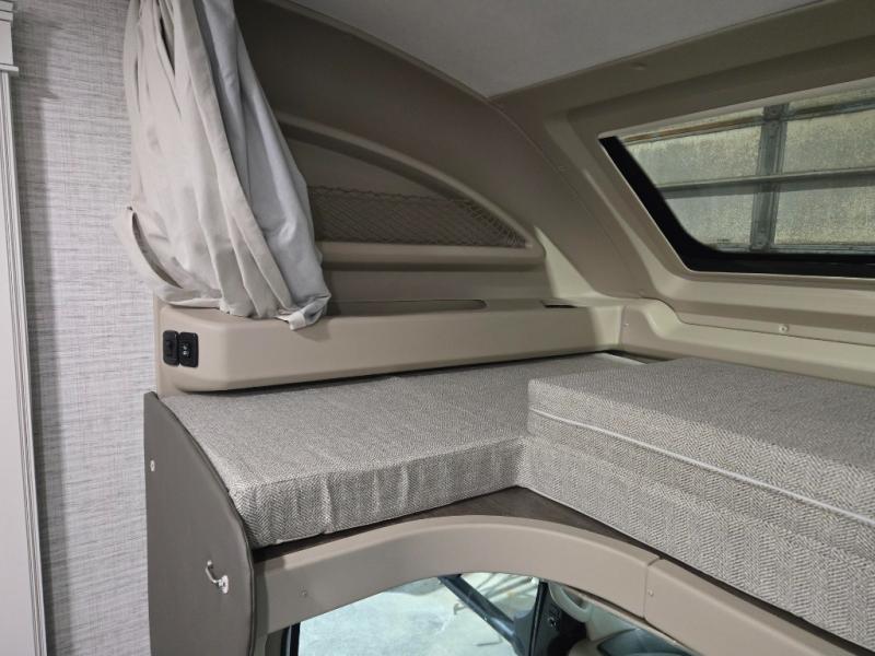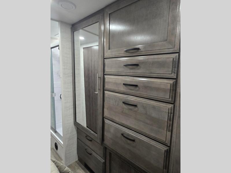 This coach allows you to take vacations in comfort and luxury with a spacious bedroom that includes a queen bed slide, dual wardrobes and a TV option for nighttime viewing, plus a way to close off the bedroom for privacy. The split bathroom gives you the ability to take a shower while another is brushing their teeth in the private toilet and sink room. You will find the main living and kitchen area to be spacious as well with a slide out that includes a booth dinette and sofa. And the cook will love the galley kitchen including the residential-size microwave and Furrion all-in-one cooktop and oven. And the cab-over bunk plus the furniture offers extra sleeping space. There are many more features to enjoy, take a look!