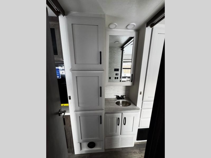 Relax inside while sitting on the sofa, at the booth dinette or on the swivel captains chairs while enjoying the fireplace and 50" TV, or unwind outside under the 18' electric awning while watching the exterior TV. After shopping in town or hiking the trails you can get cleaned up in the private toilet and shower room then brush your teeth in the bathroom sink a few steps outside the door. The private bedroom includes a space saving sliding door, a unique rear queen bed slide, plus storage. The cook will enjoy making meals using the residential-size microwave and Furrion all-in-one cooktop and oven, then storing leftovers in the 8 cu. ft. refrigerator. And the L-shaped counter with sink will come in handy.