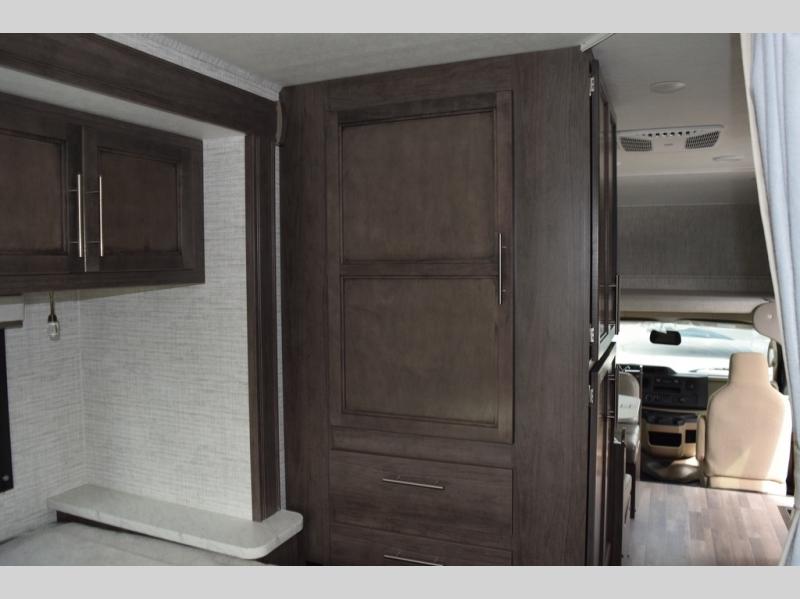 The Odyssey SE Class C gas motorhome by Entegra Coach is constructed with TuffShell vacuum-bond laminated sidewalls, a one-piece, seamless fiberglass front cap, and bead-foam insulation for added durability and strength. Whether you choose a model with a Ford E-350 chassis or Chevy 4500 chassis, you will get a durable coach made to last. The driver will also love the power steering, tilt steering wheel, and auxiliary start switch. The 7' interior ceiling height will provide plenty of space to stretch out and the high-intensity, recessed LED lights will make your space feel more like home. All of your power needs will be met with a 4,000-watt generator and 12V house battery, plus there is a 13.5K BTU A/C and 30K BTU furnace to keep you comfortable all year long. There are a couple additions you might want to add to further customize your Odyssey SE, like the optional automatic hydraulic leveling jacks and the optional 200W solar panel for some off-grid camping!